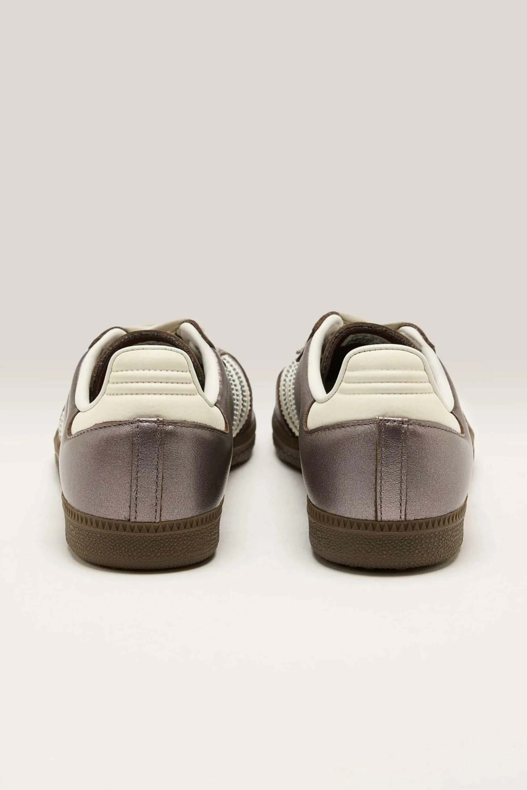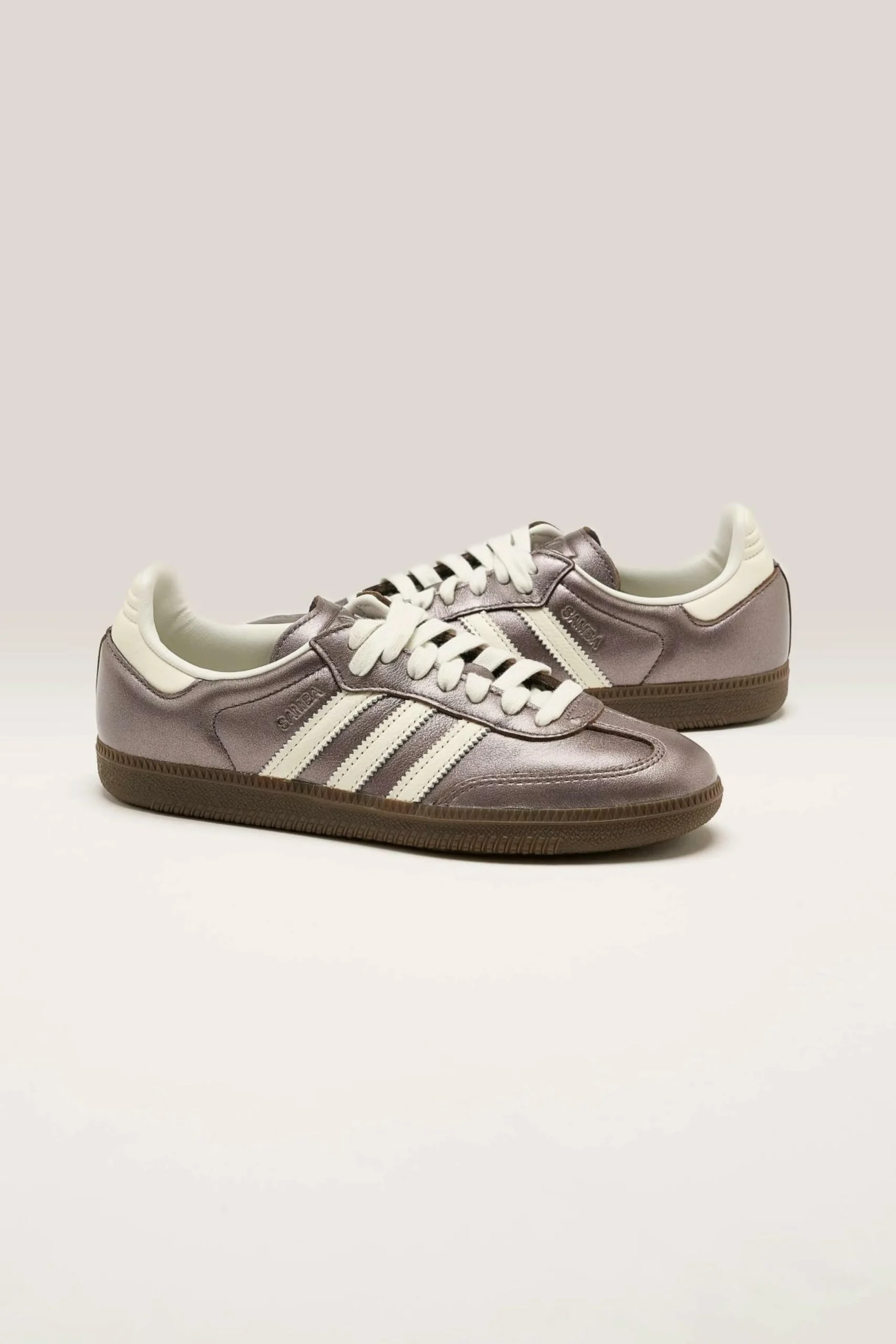 The Adidas Samba OG legacy sneakers feature a smooth leather upper with a high-shine metallic finish in a low-profile silhouette.
