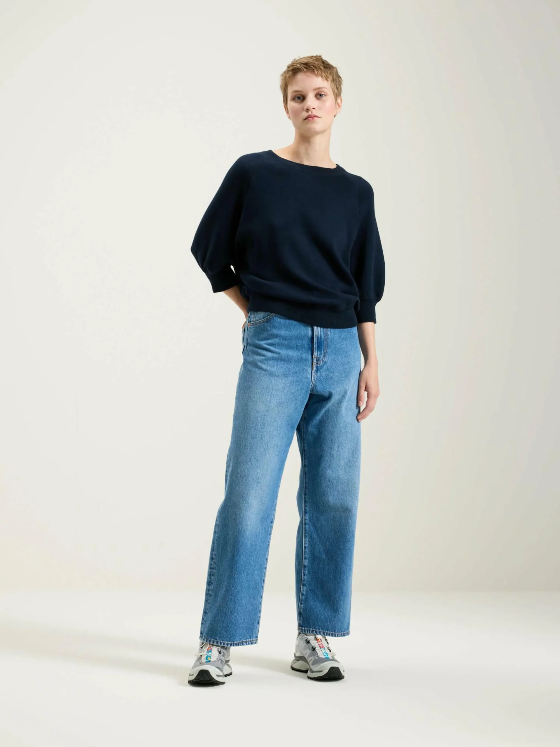 Pull col rond oversize avec manches 3/4 et bords côtelés en coton bleu marine.