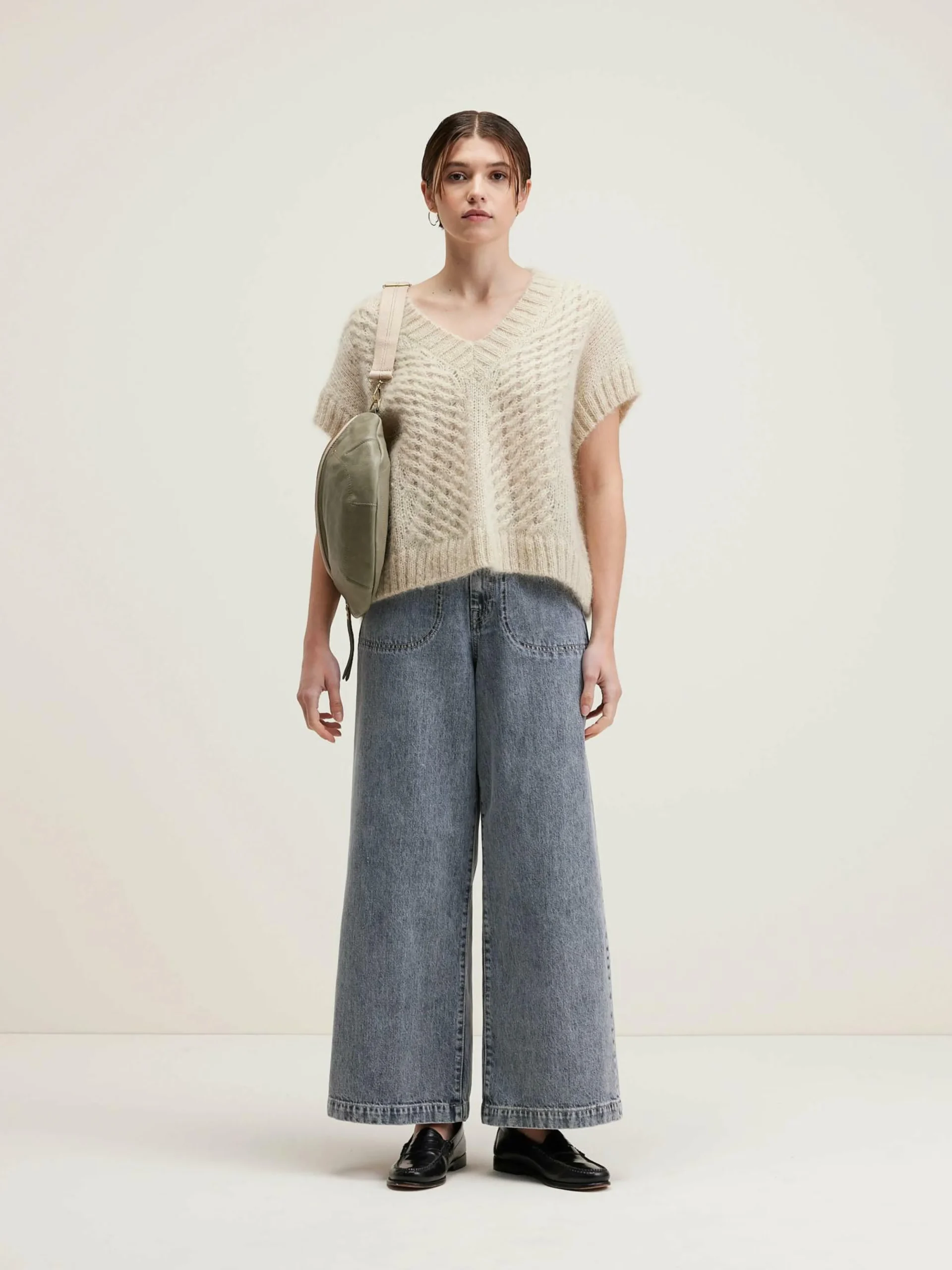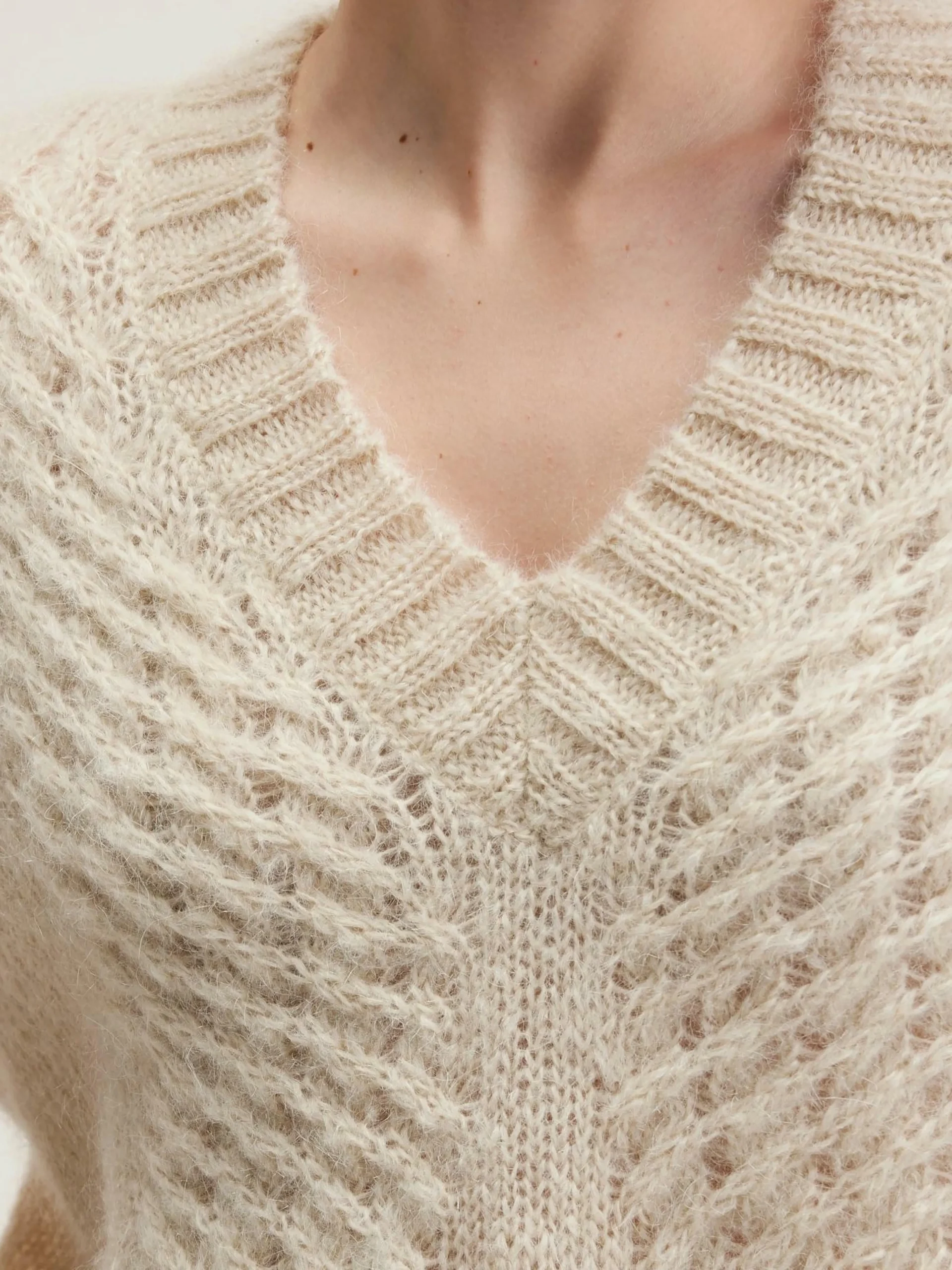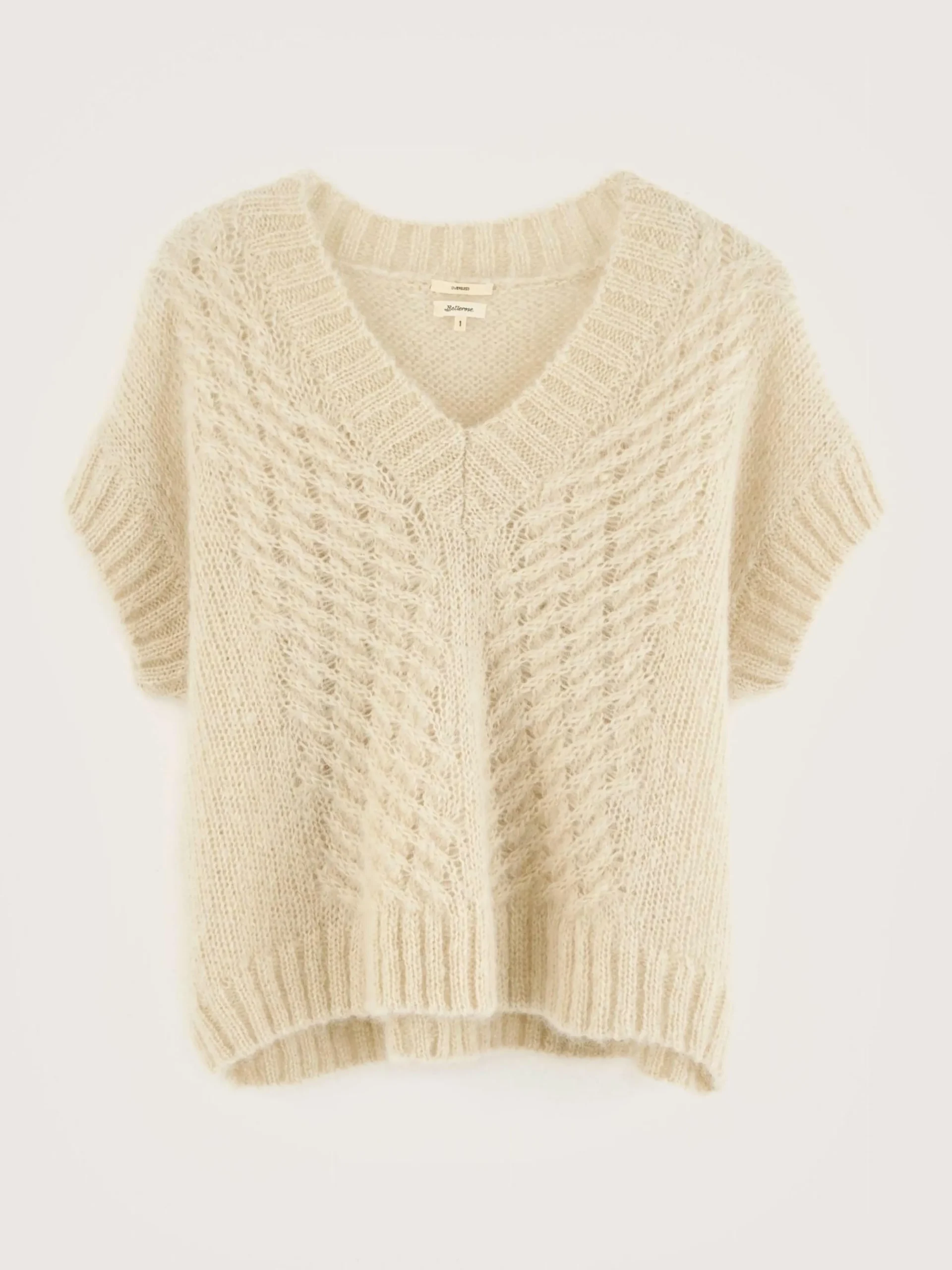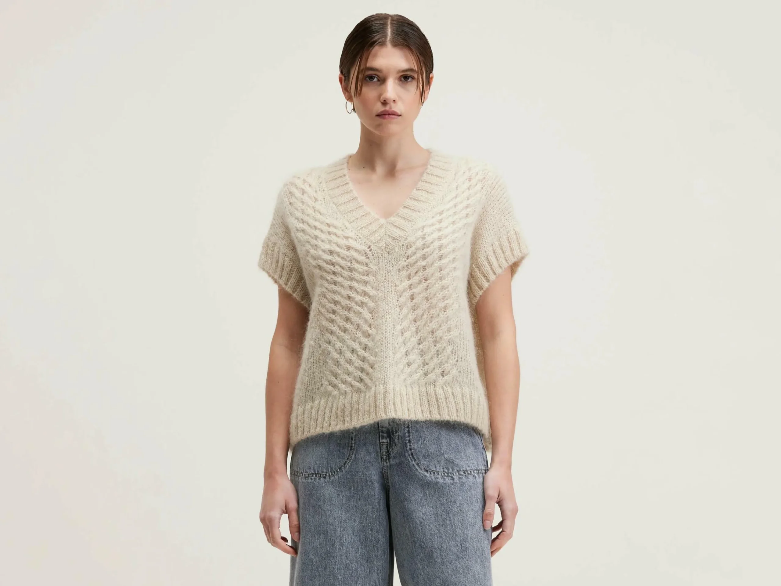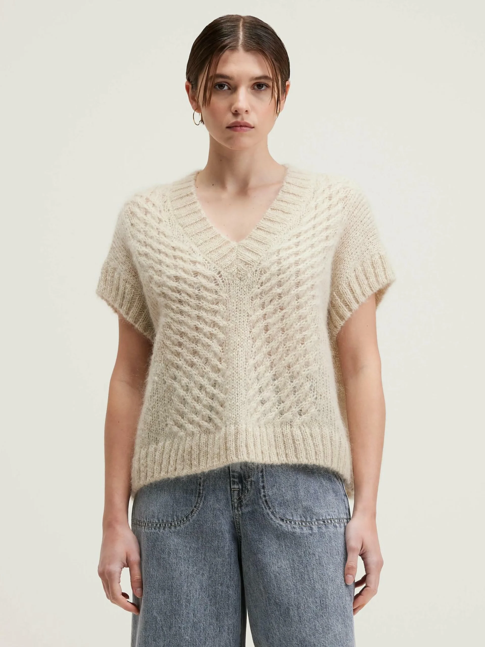 Pull léger sans manches, coupe oversize, détails de torsades, couleur beige.