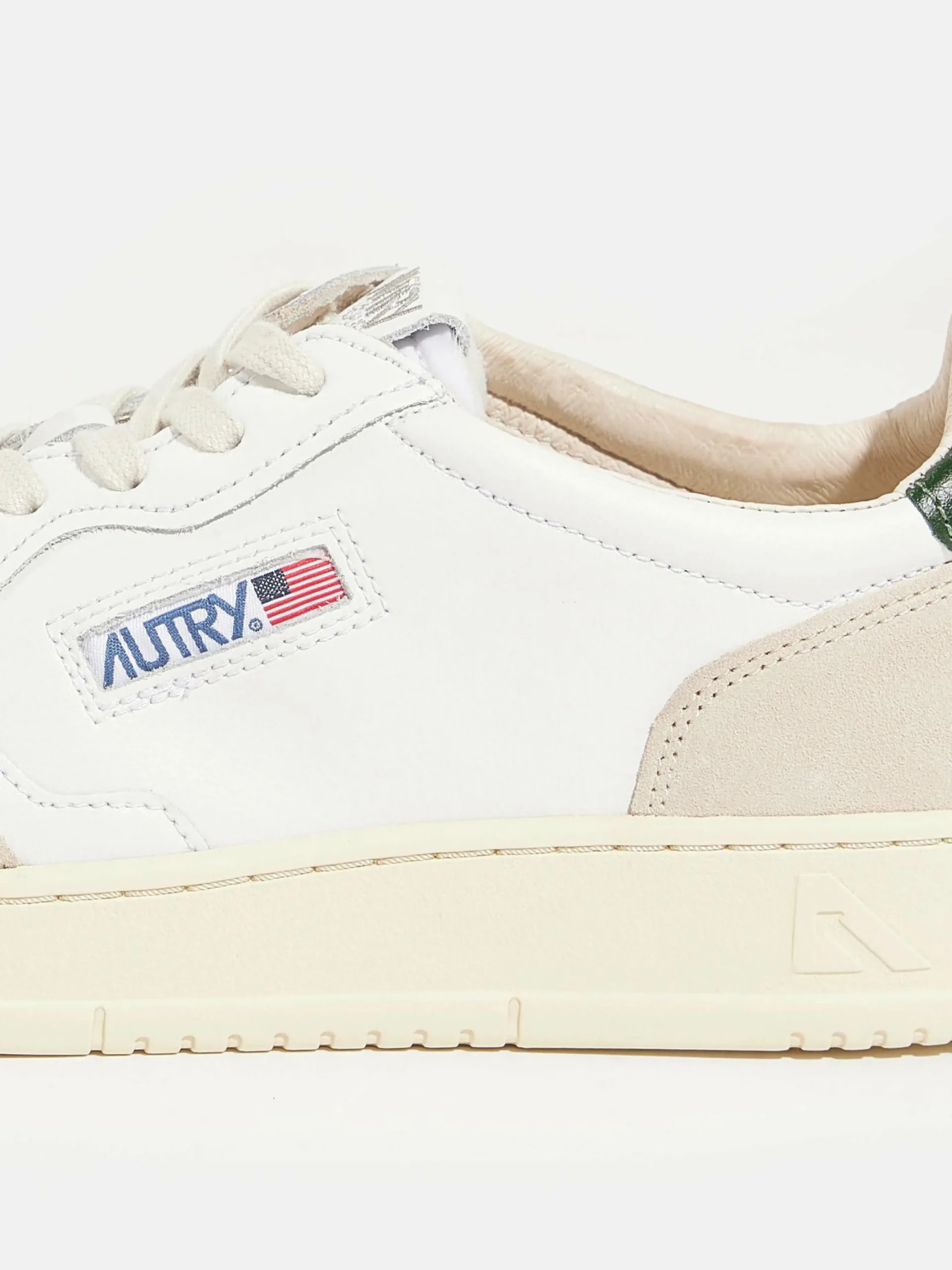 Les sneakers Autry Medalist Low possèdent une tige en cuir blanc souple avec des empiècements en suède doux, un bout perforé et une languette de talon en cuir vert.