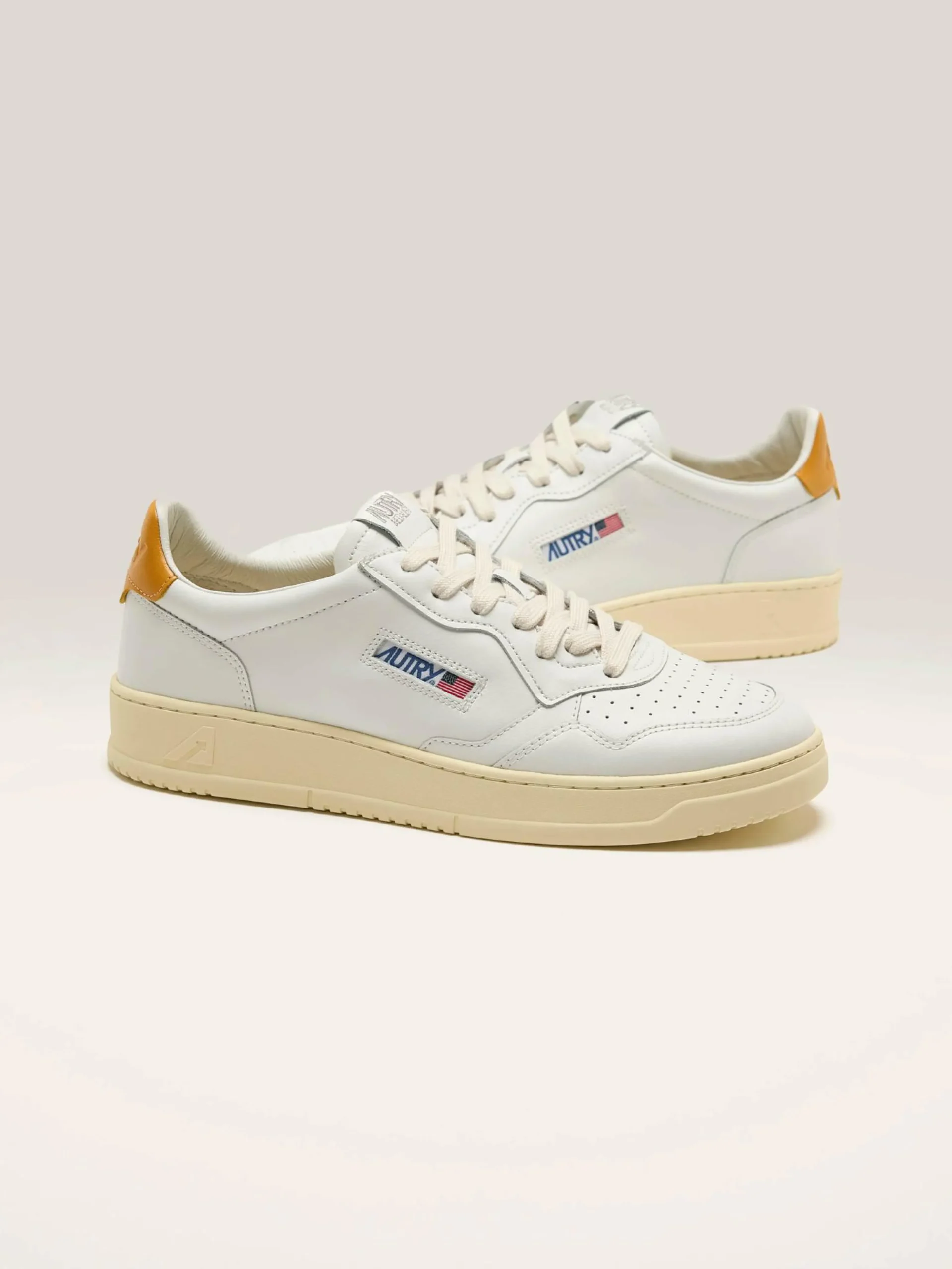Les sneakers Autry Medalist Low présentent une silhouette sportive en cuir blanc avec une languette de talon en cuir couleur miel, créant un contraste dynamique.