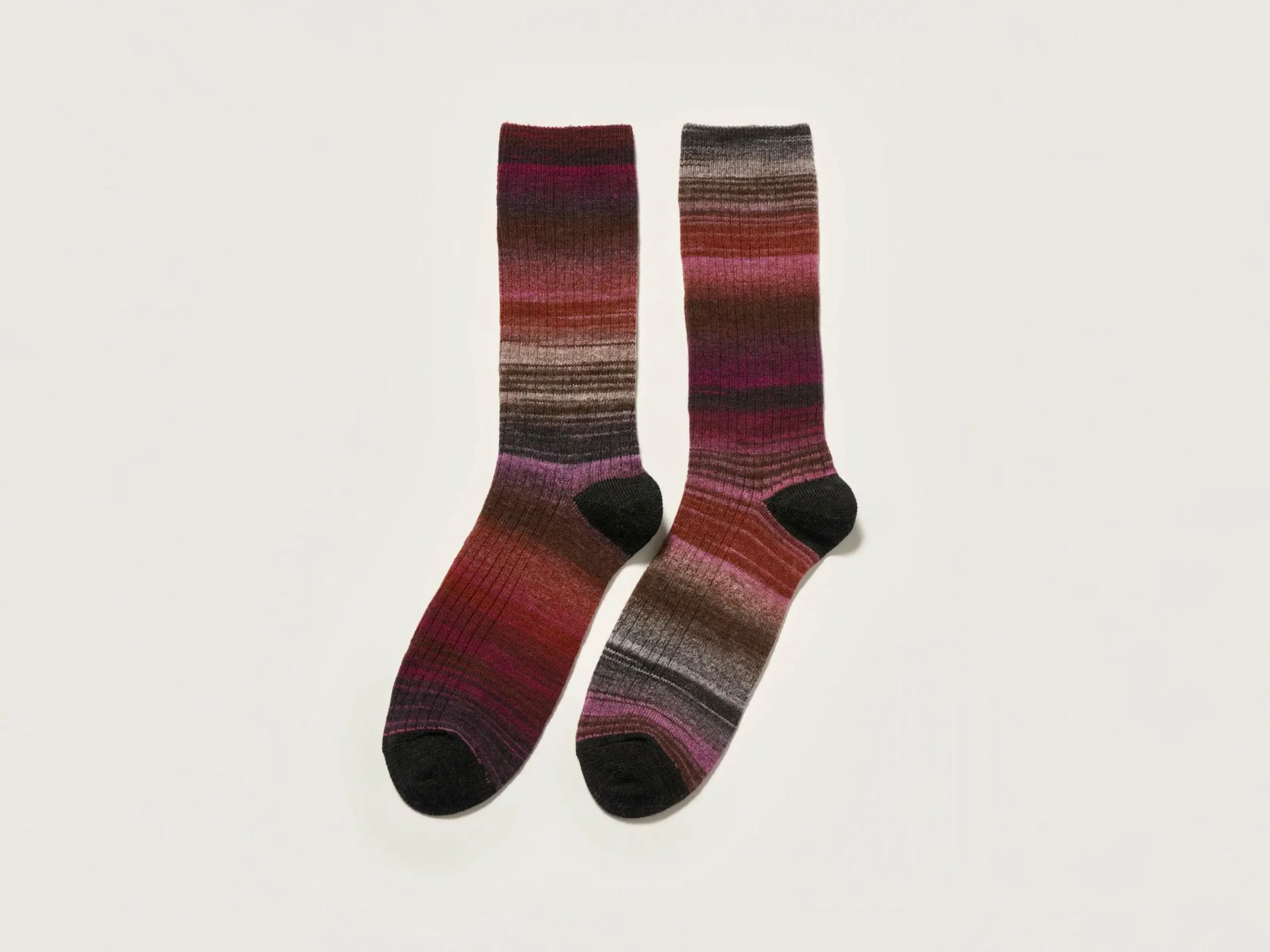 Chaussettes en maille côtelée tricotées en fil imprimé dans des tons roses et rouges, avec pointes et talons contrastés.