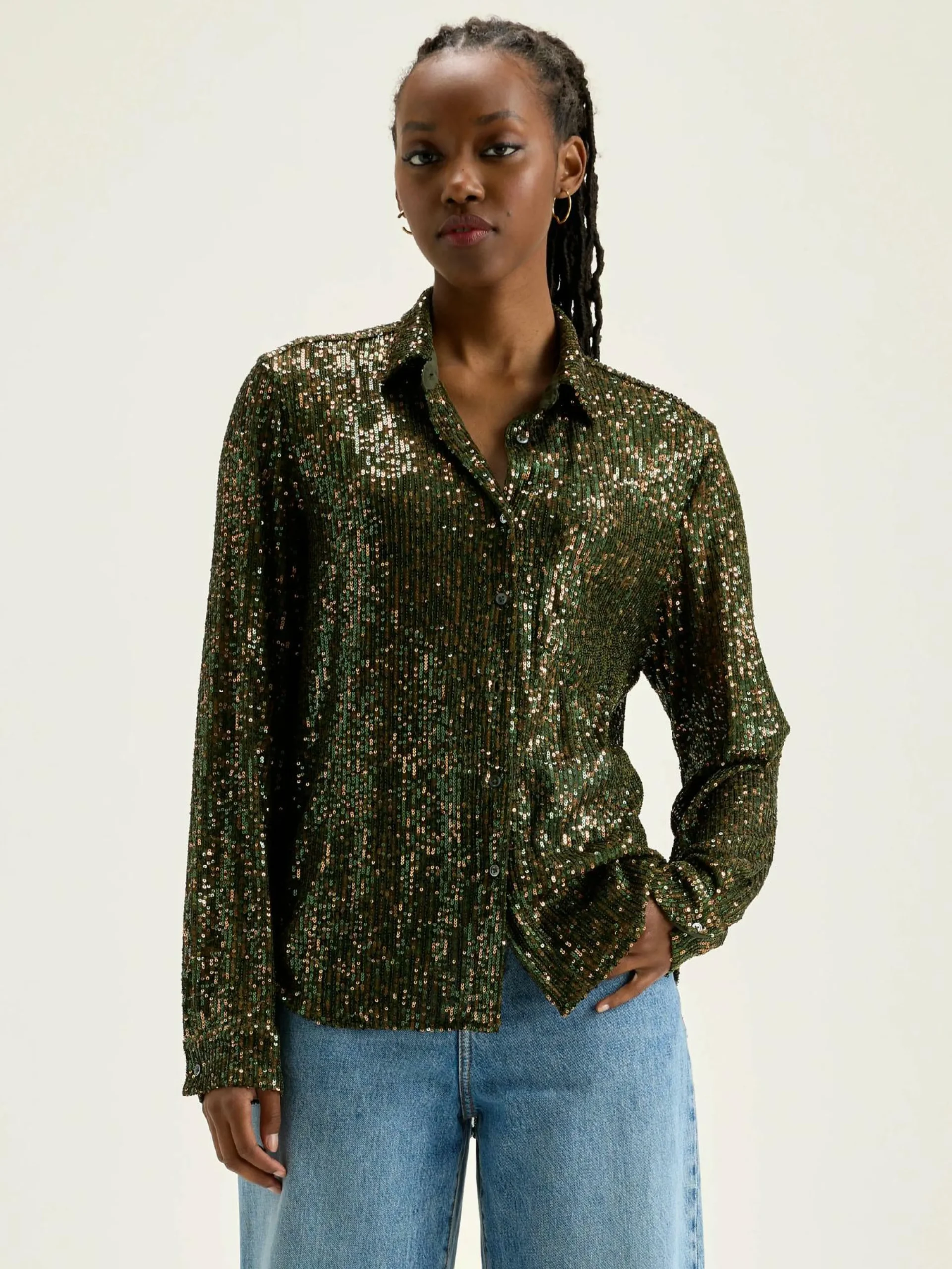 Chemise à coupe longue et droite entièrement brodée de sequins vert mousse.