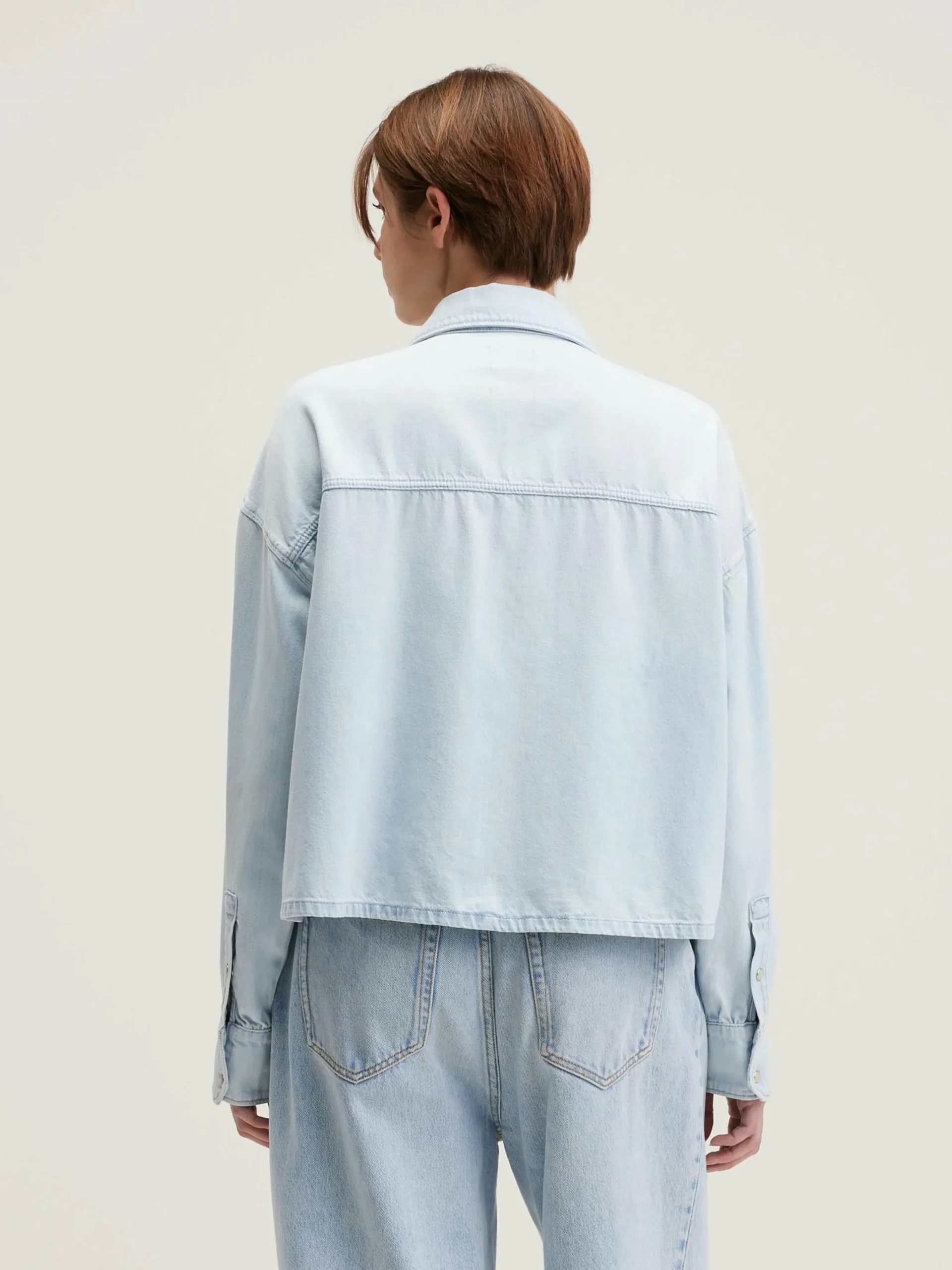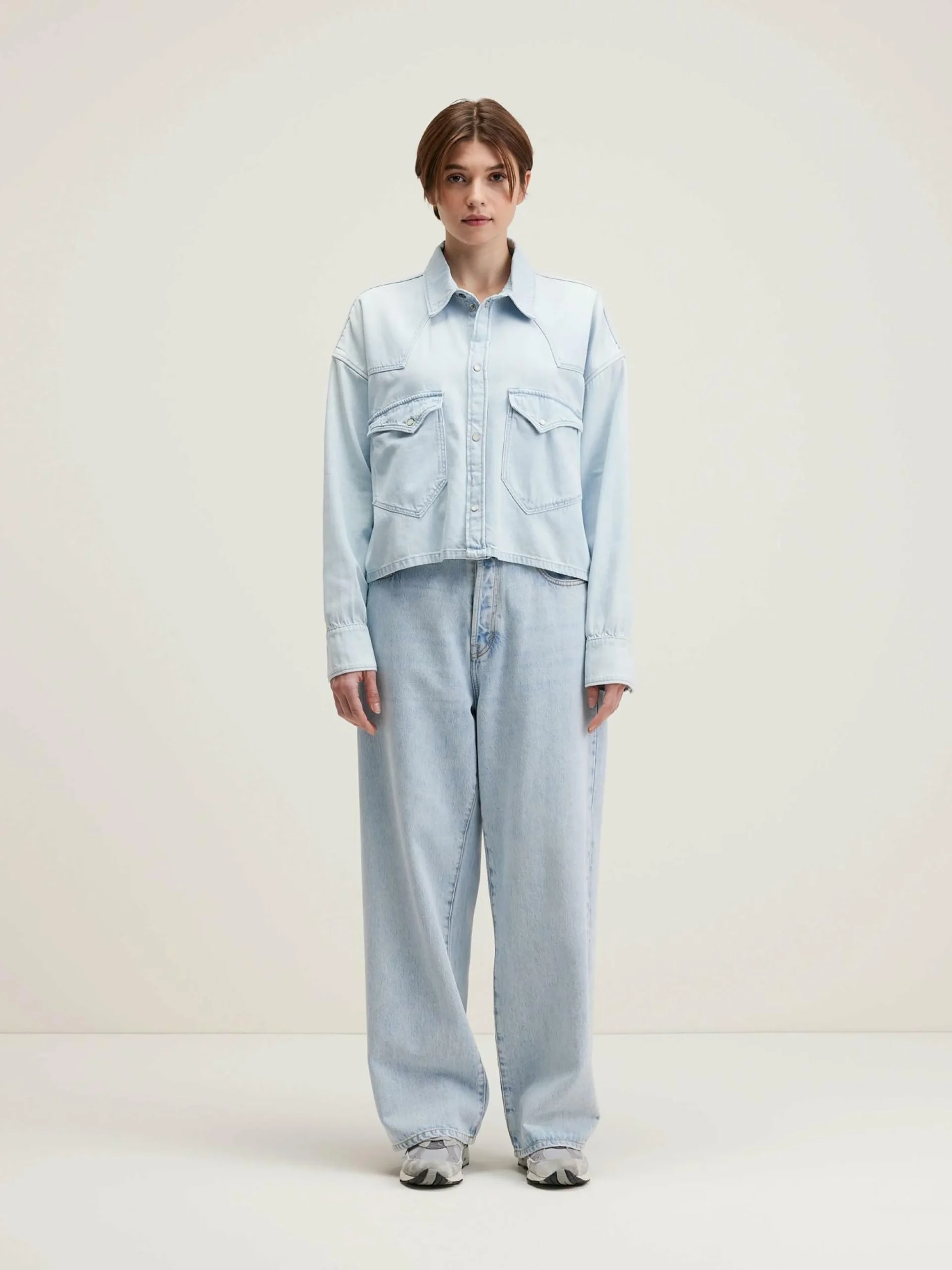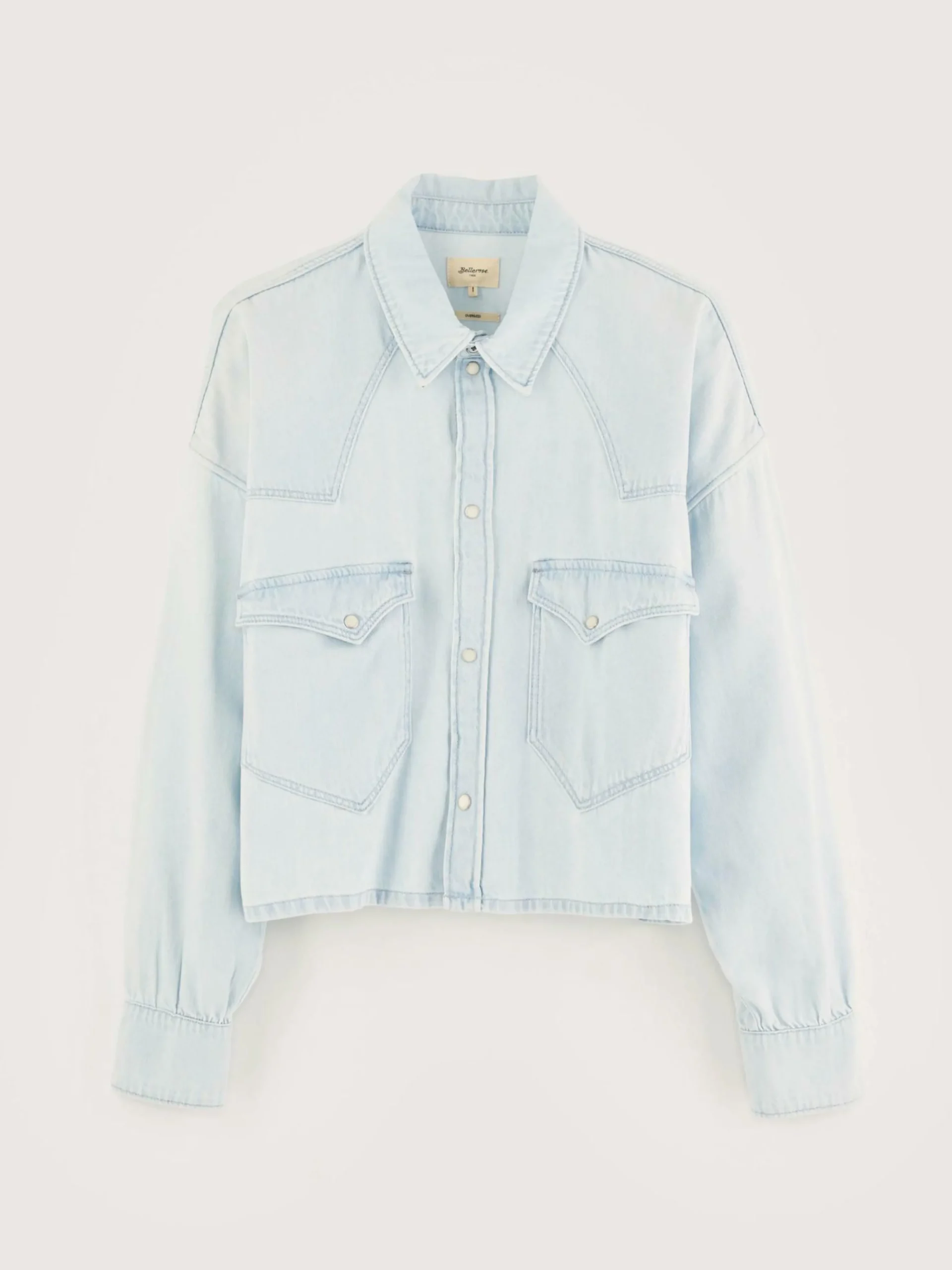 Chemise d’inspiration western, oversize et cropped, en denim de coton bleu clair.