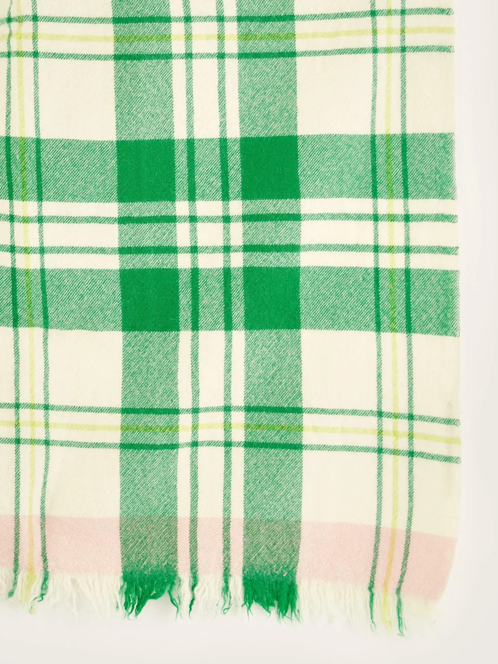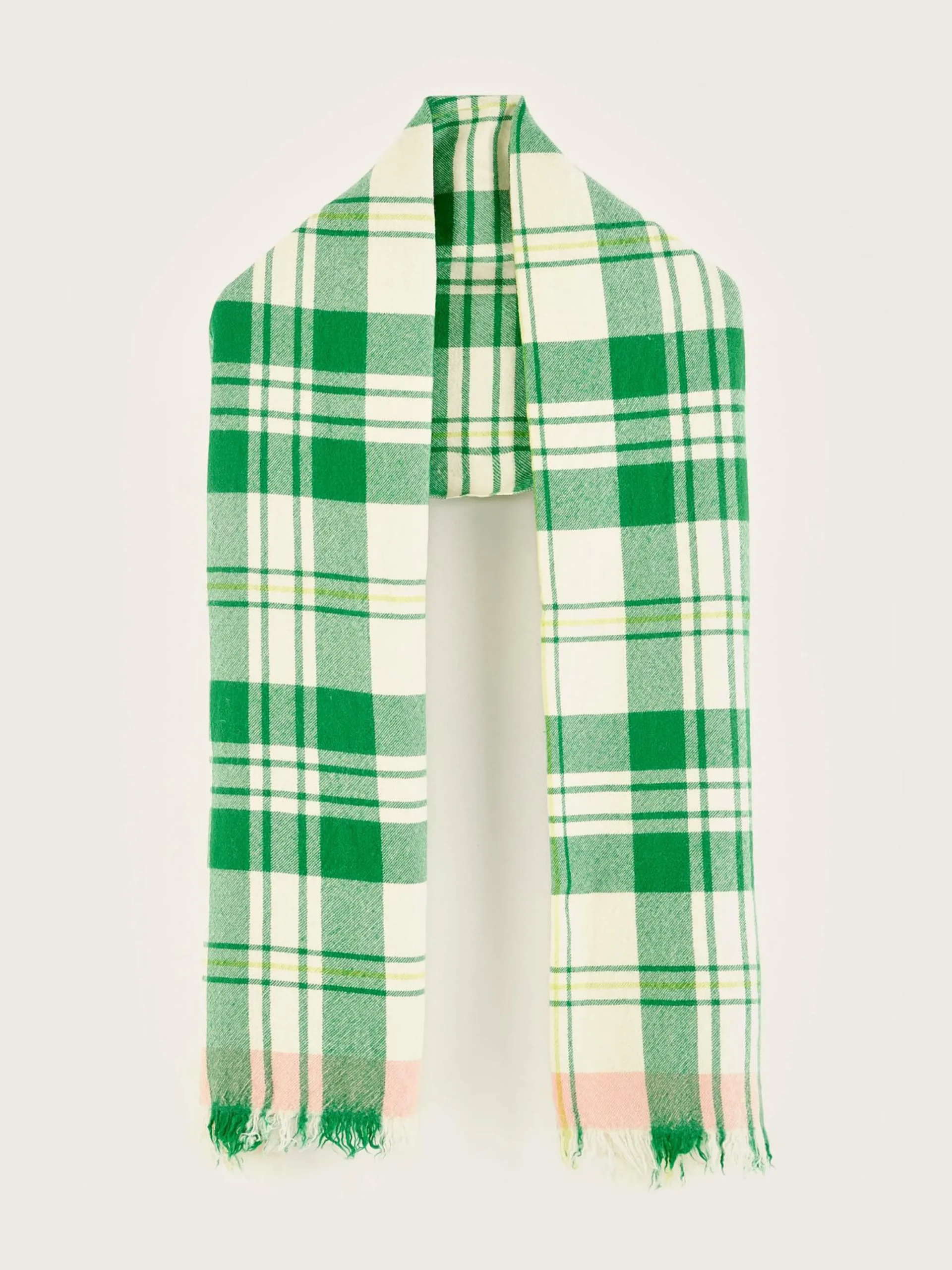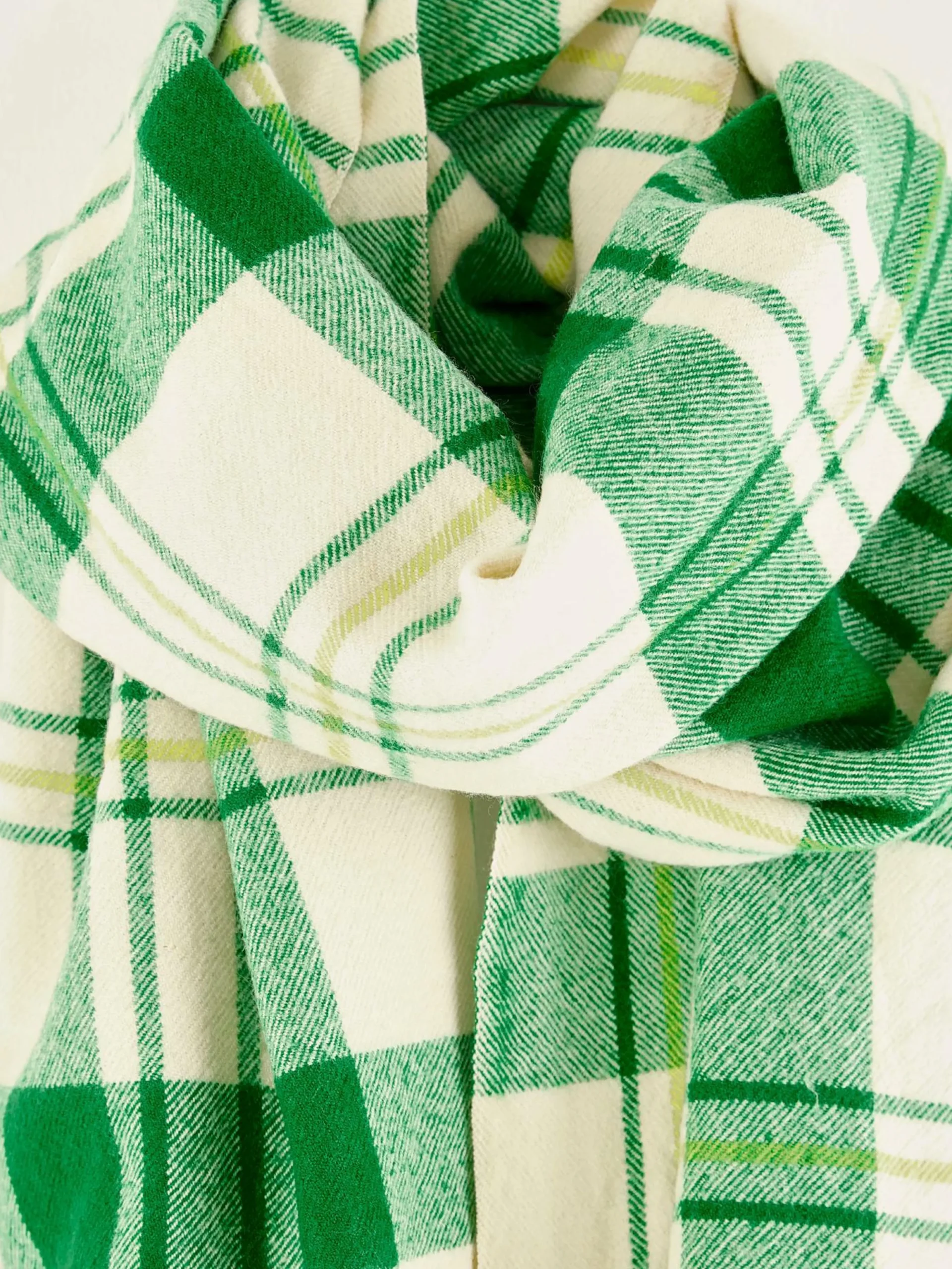 Écharpe tissée classique en laine à carreaux écrus et verts.