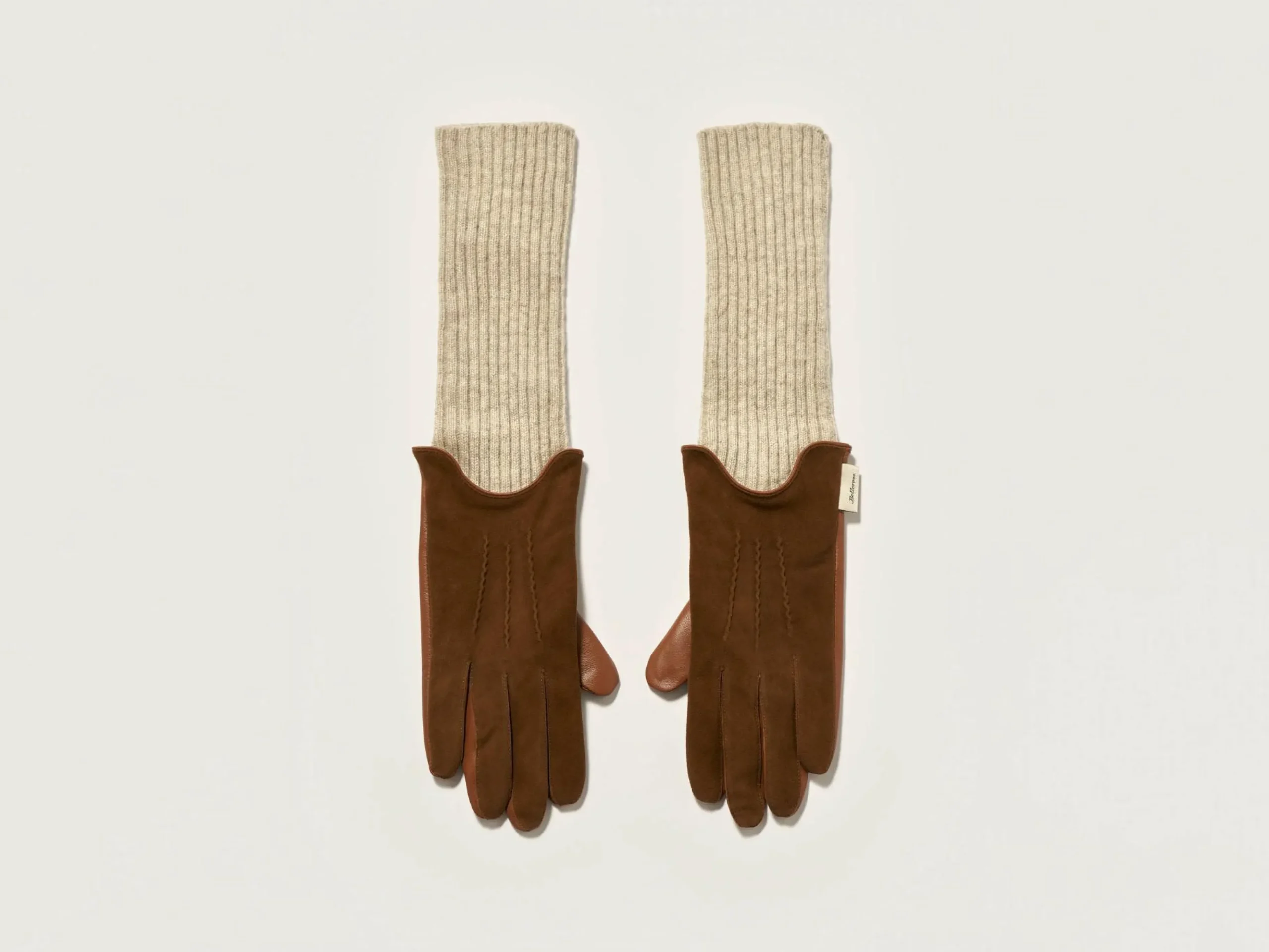Gants brun avec un dessus en daim et un détail de maille côtelée contrastée aux poignets.