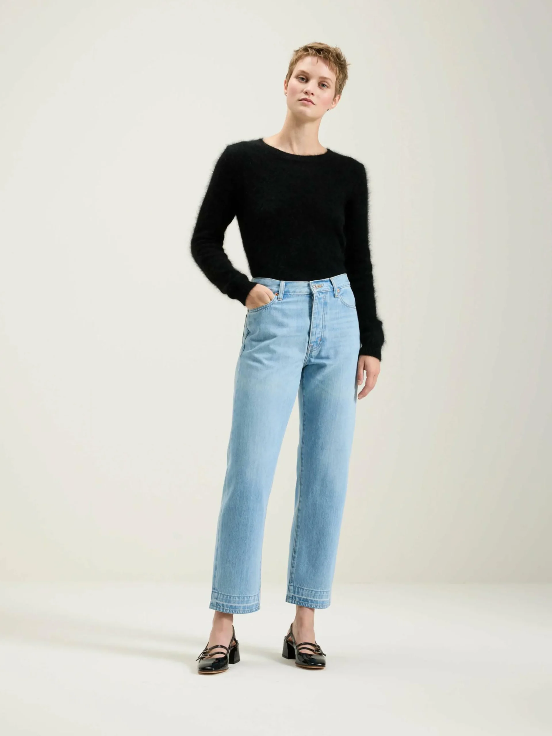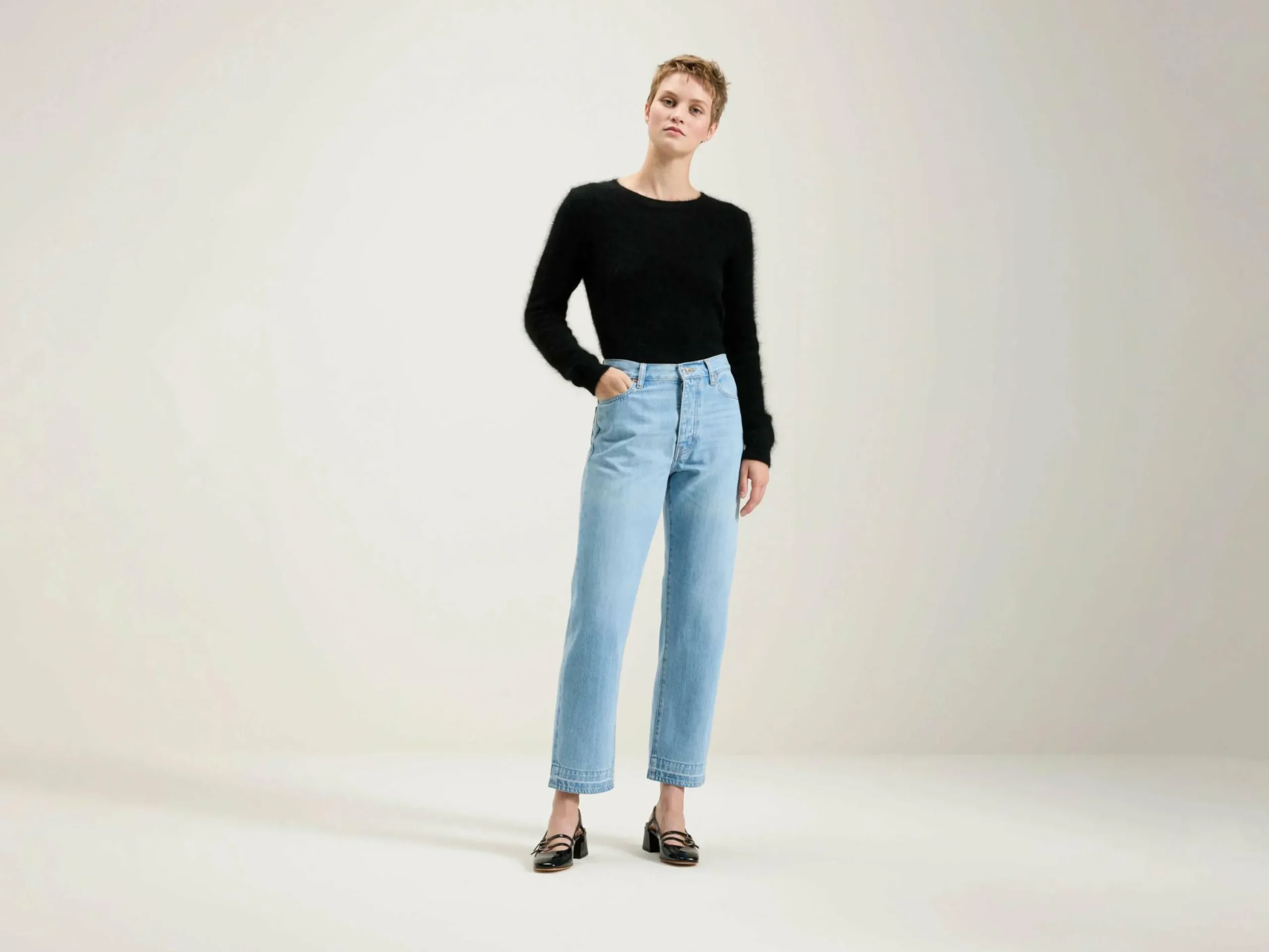 - Denim de poids moyen, sans élasticité