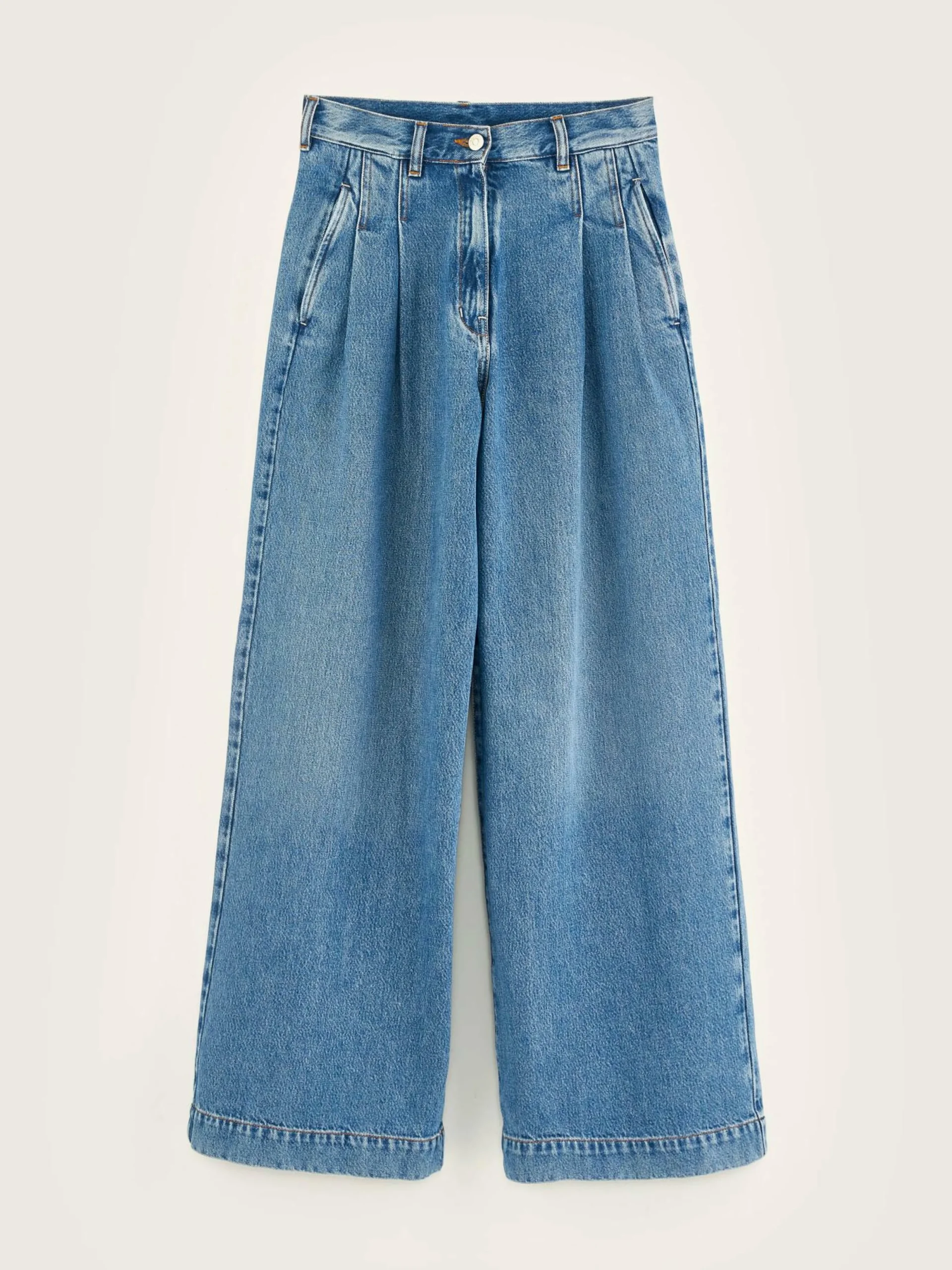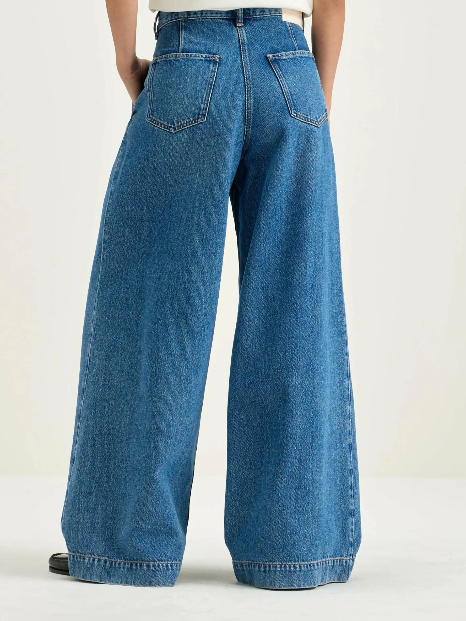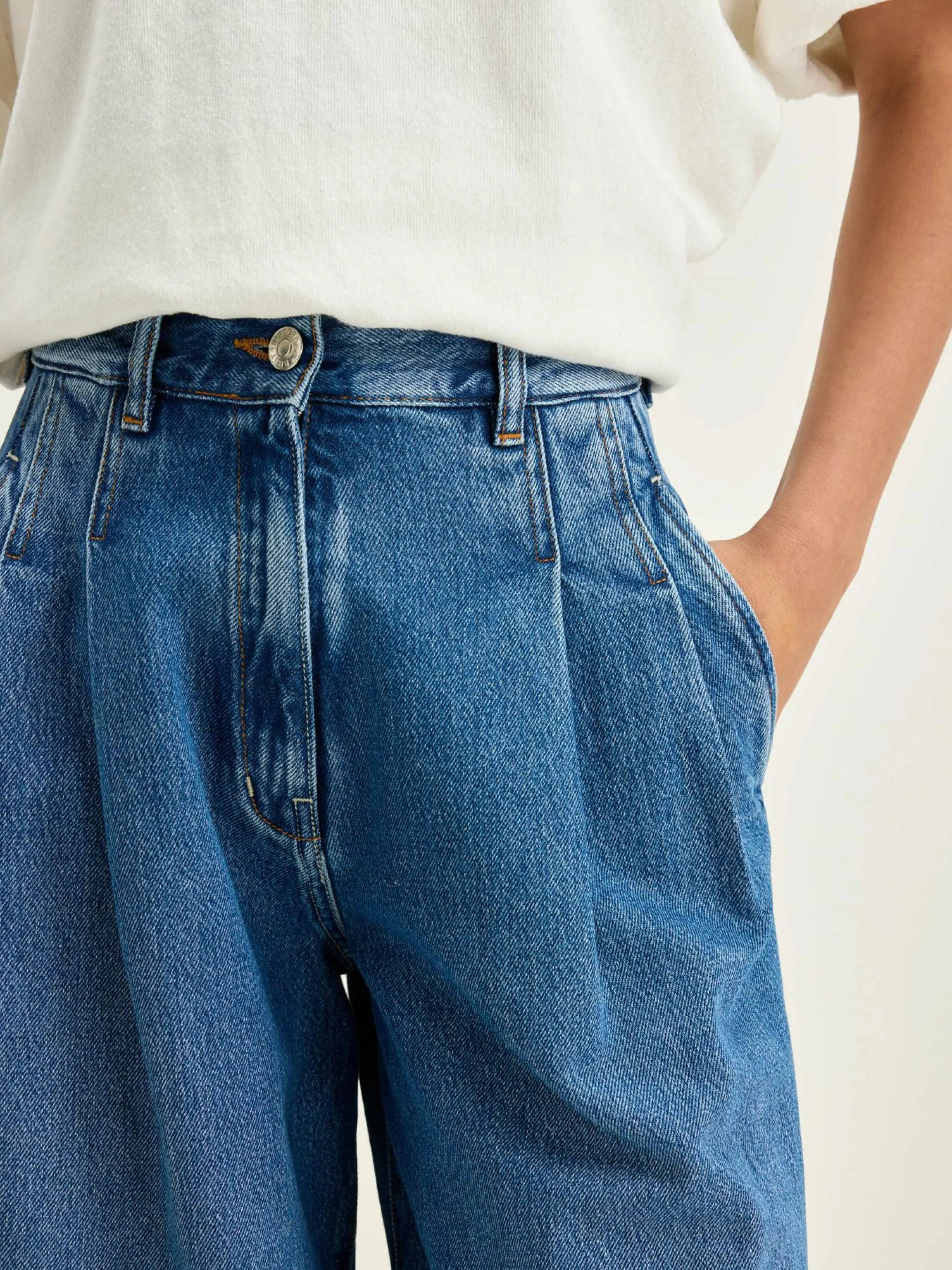 Jean plissé, taille haute et jambes très larges en denim used-blue.