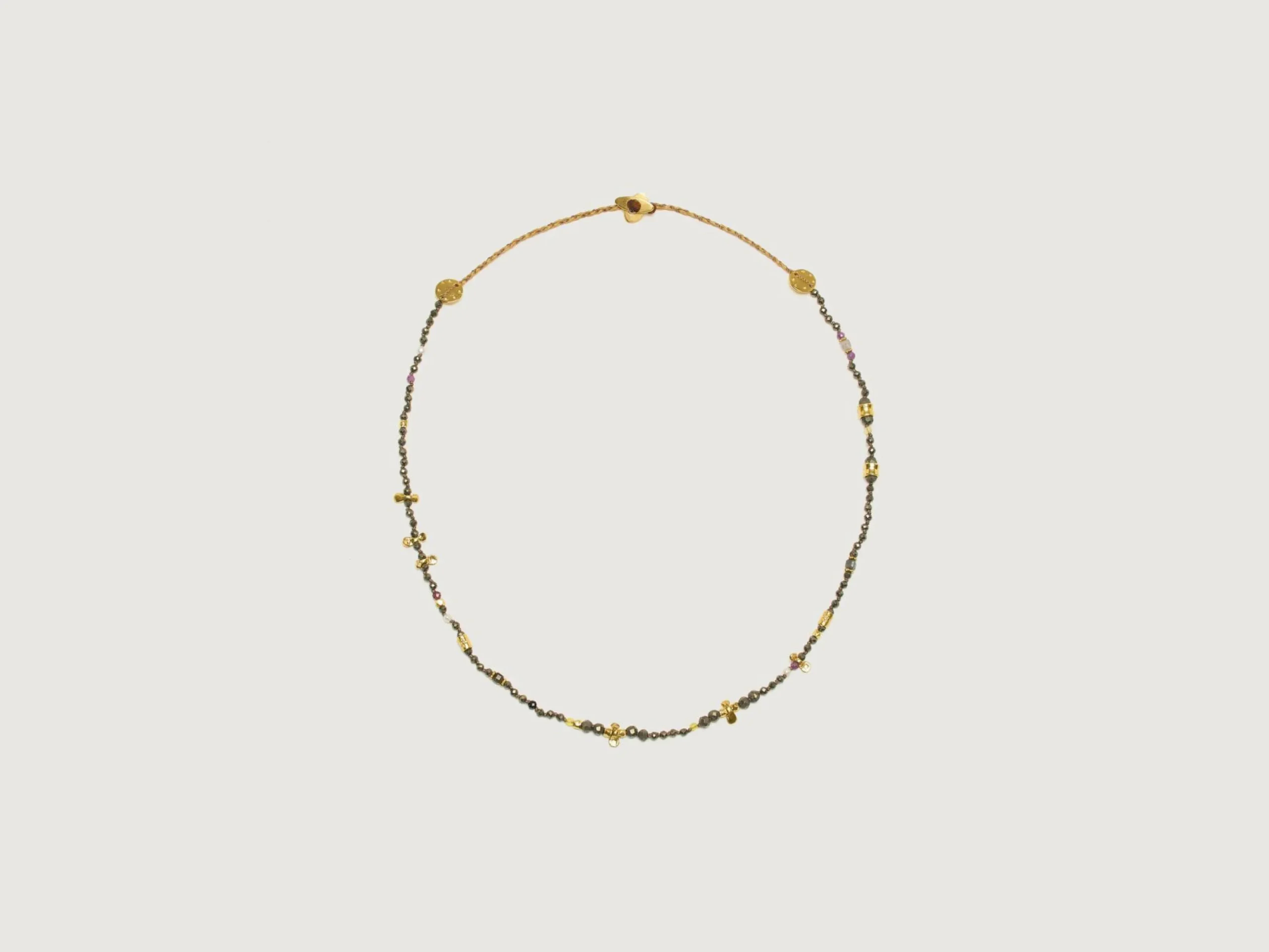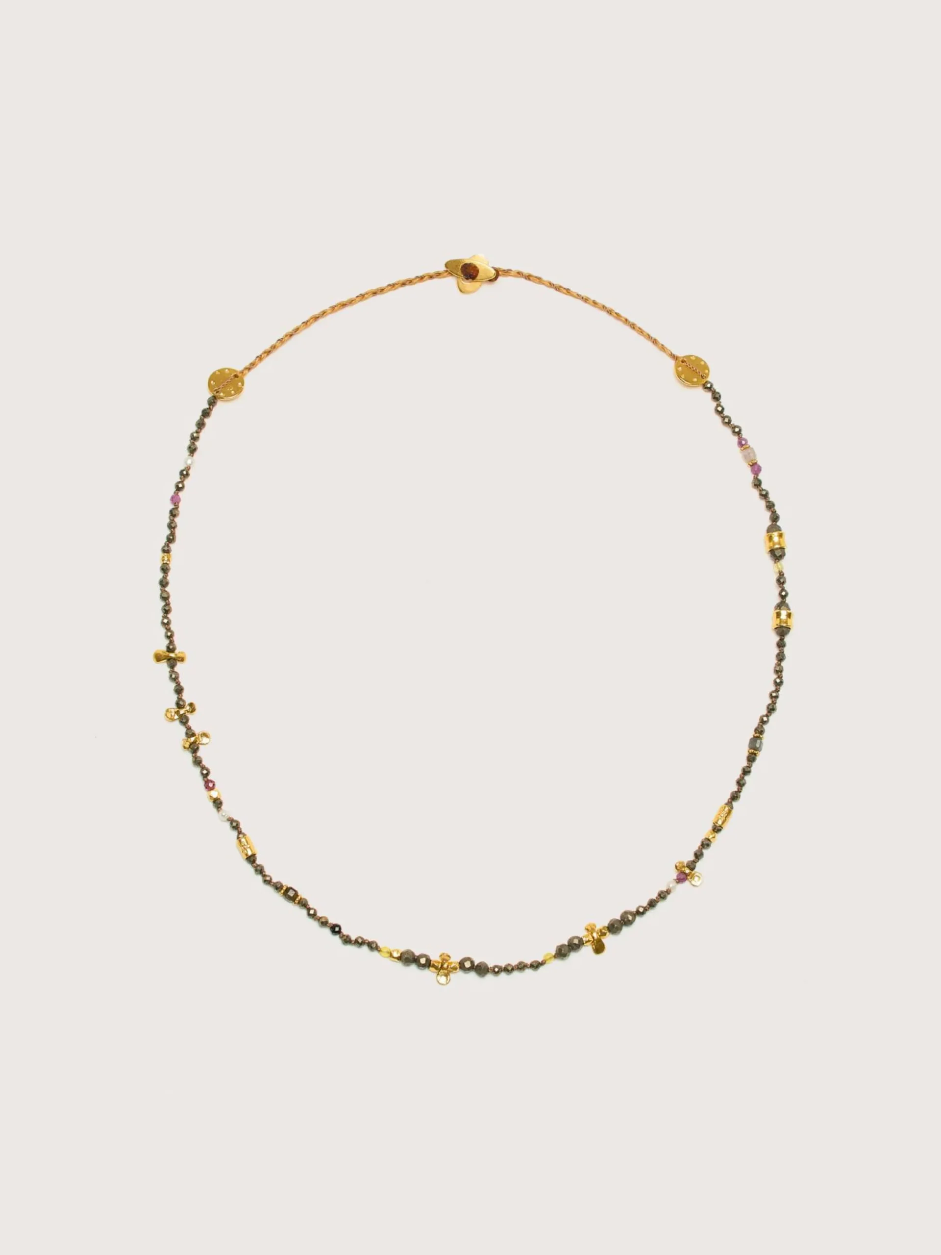 Ce collier de Mary Gaitani est fabriqué à la main en Grèce avec des pierres de pyrite et des breloques plaquées or 18k sur un cordon ciré.