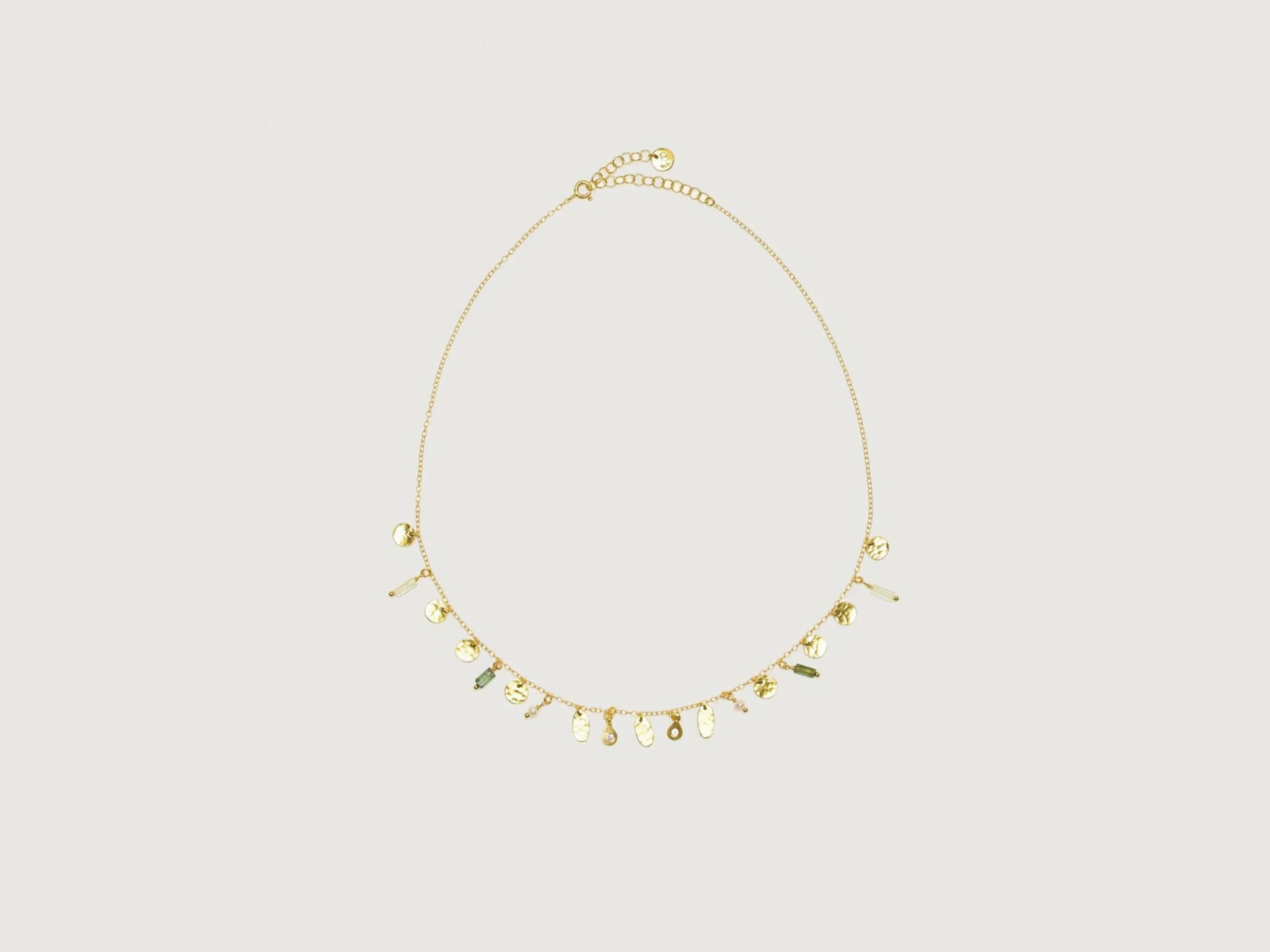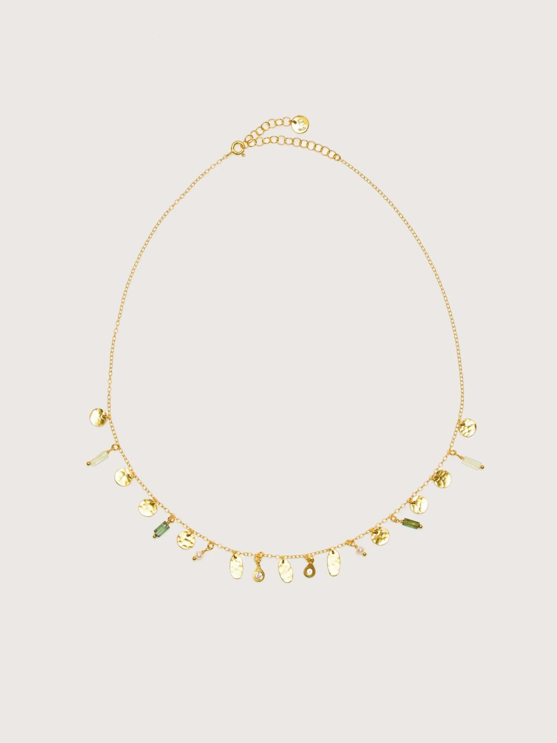 Ce collier de Mary Gaitani est fabriqué à la main en Grèce avec des pierres de tourmaline, des perles et des breloques plaquées or 18 carats.