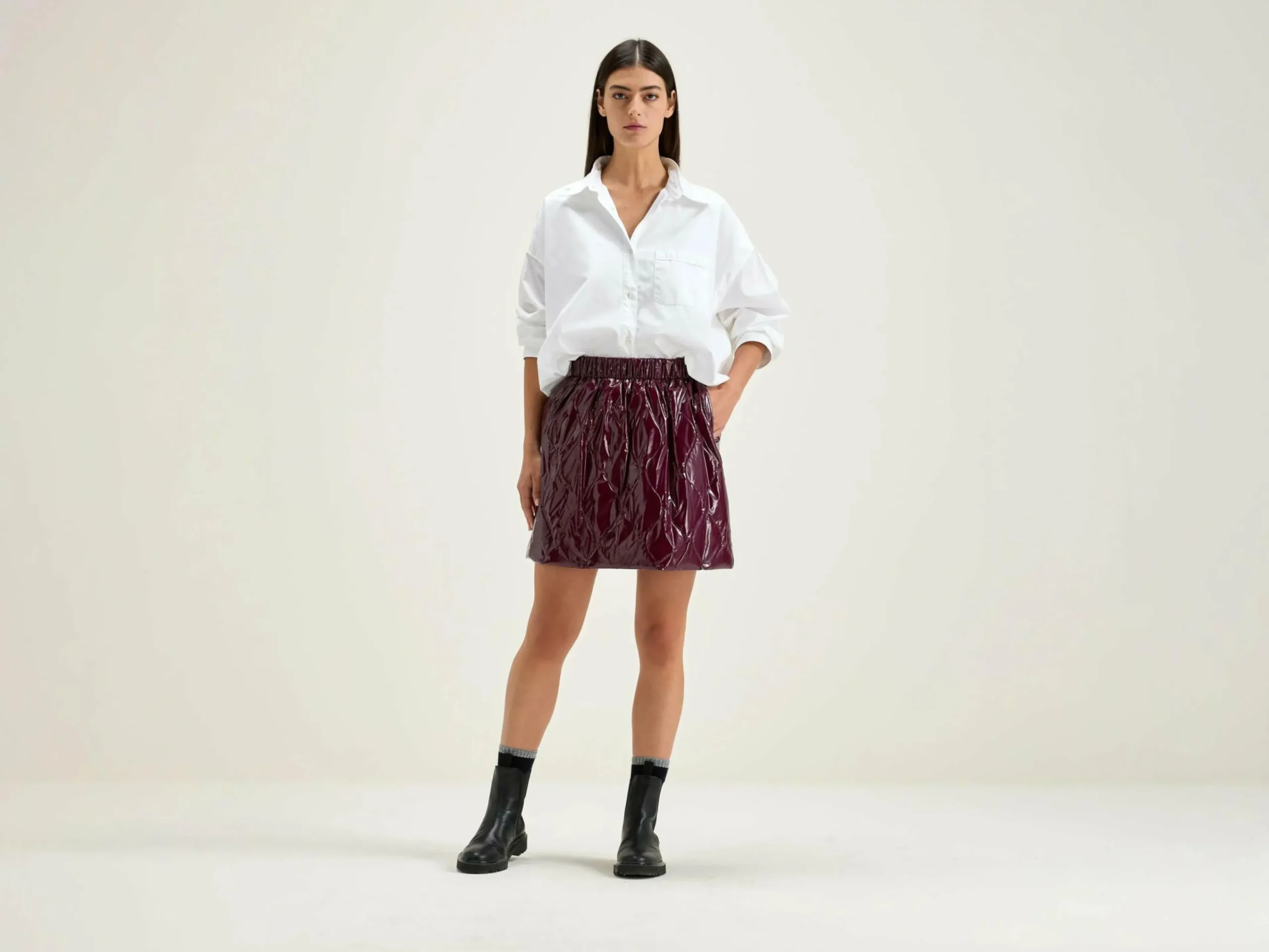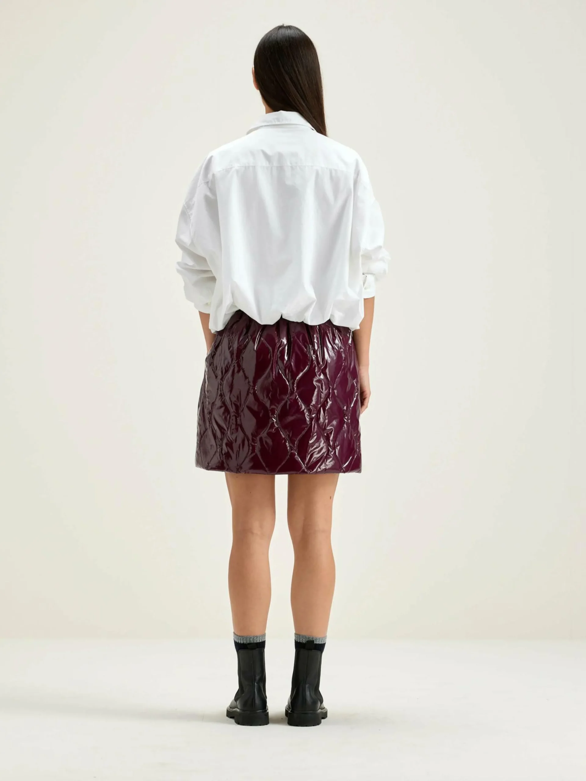 Minijupe matelassée à taille élastique en ripstop brillant couleur bordeaux.