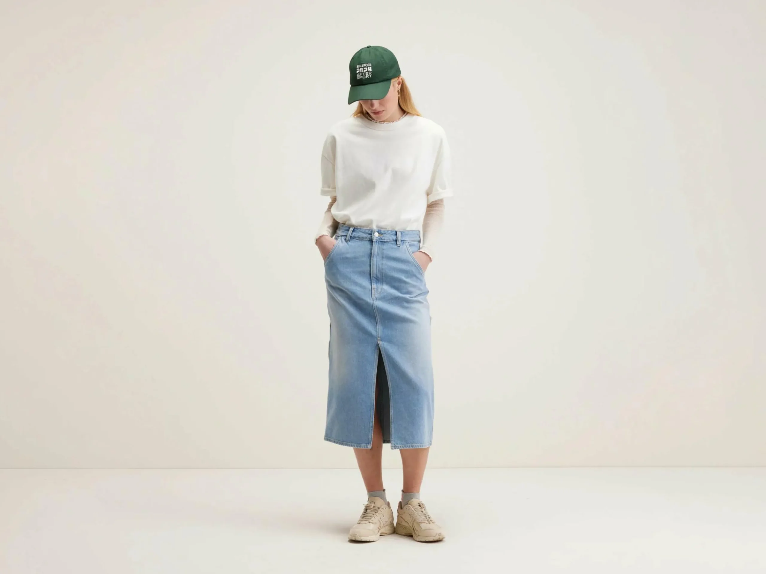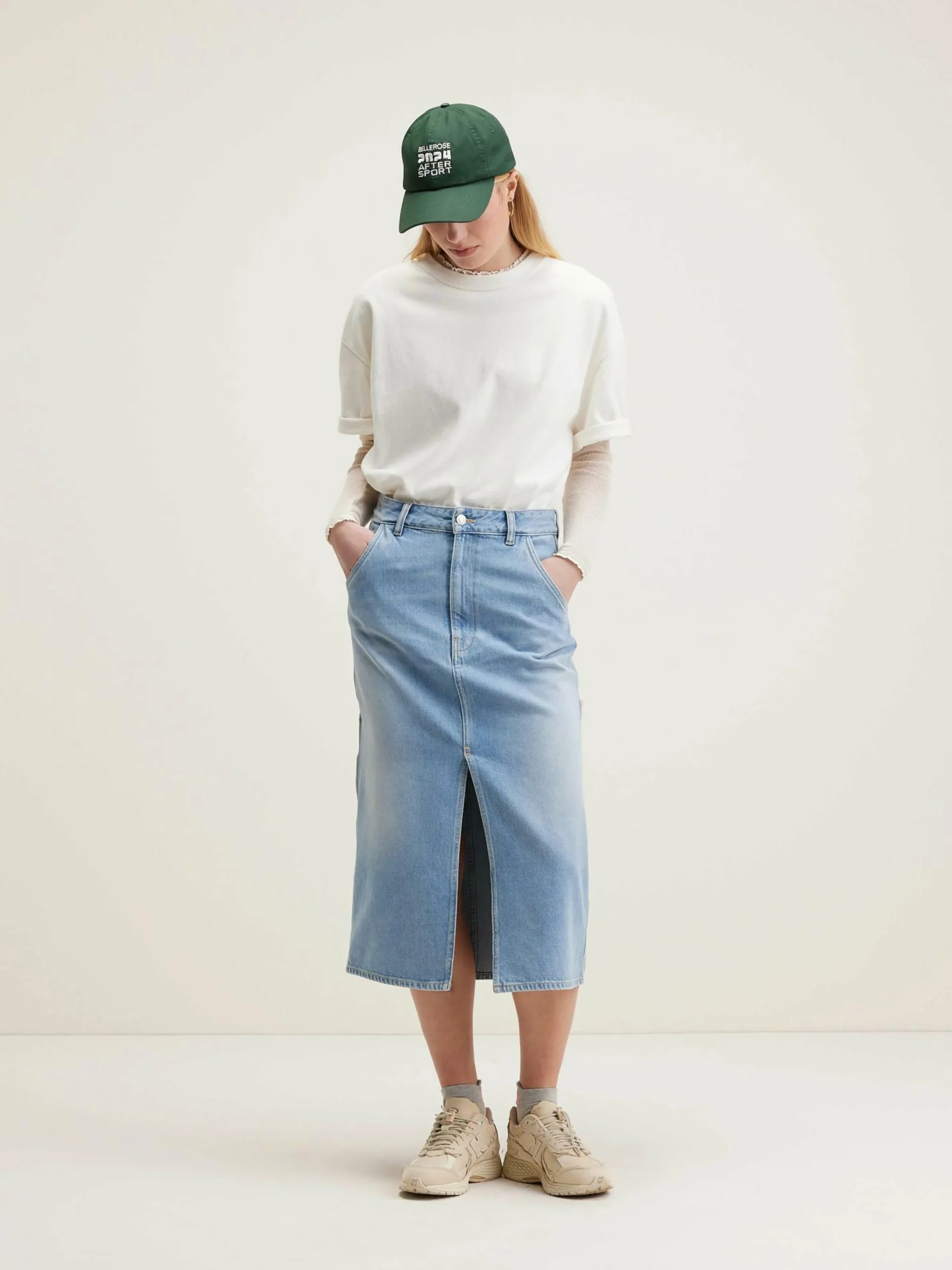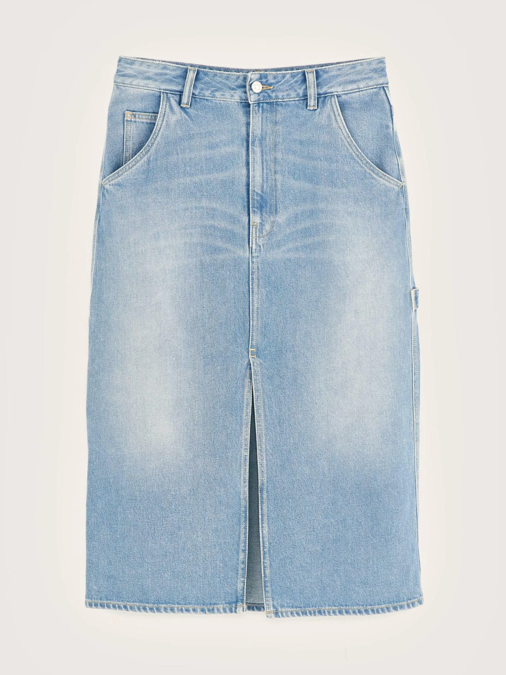 Jupe midi style cargo en denim de coton vintage blue avec légêres abrasions.