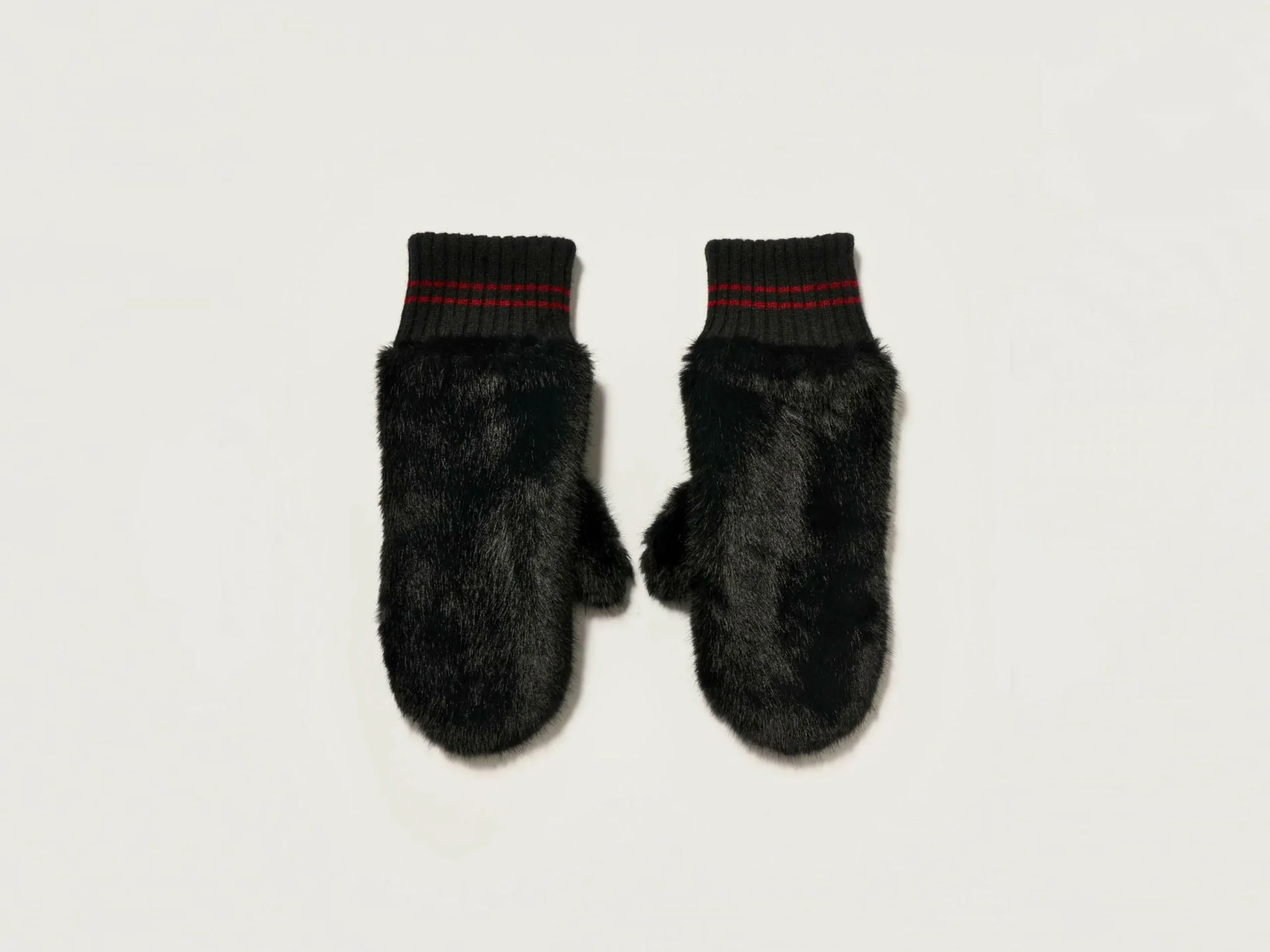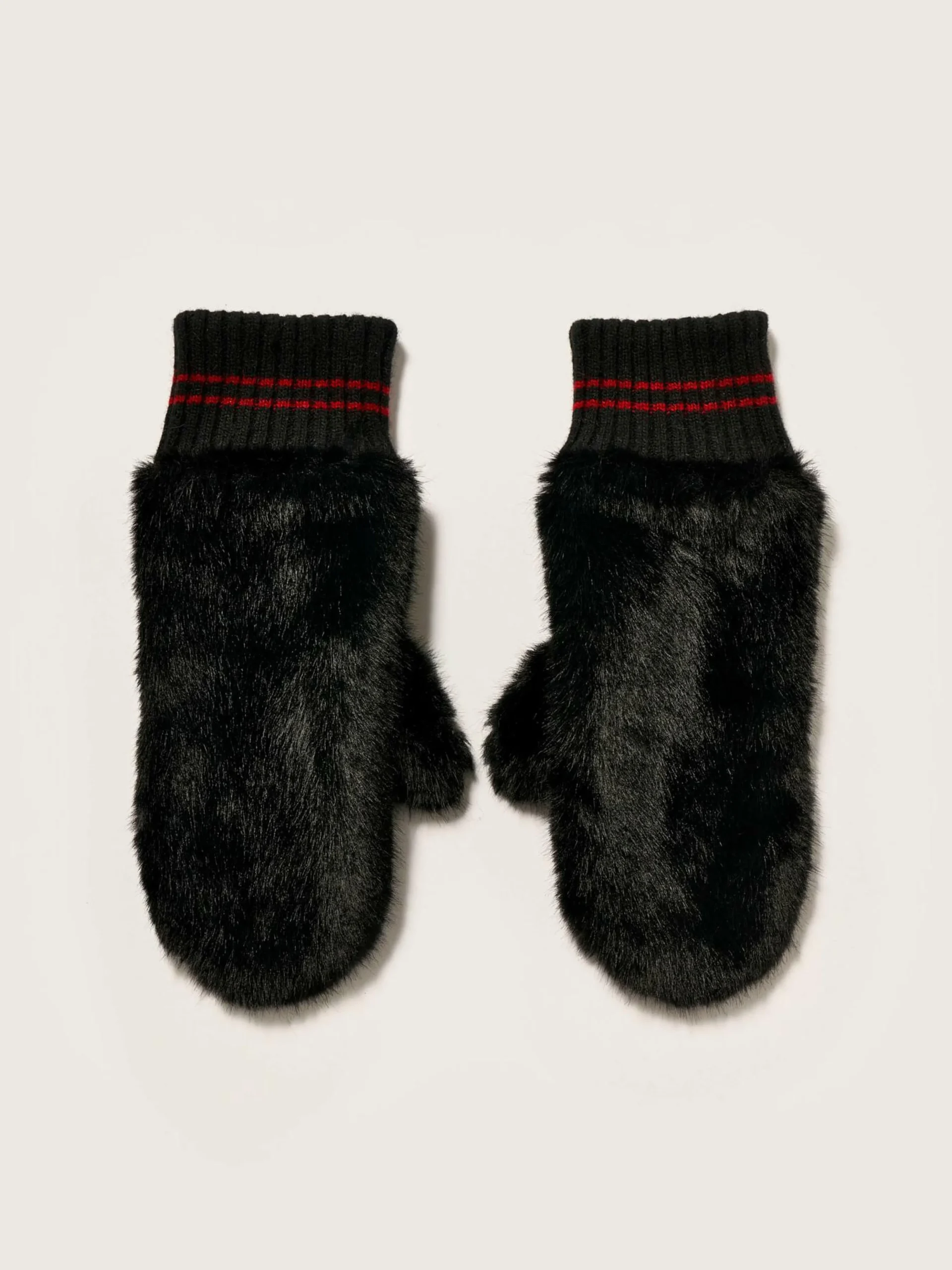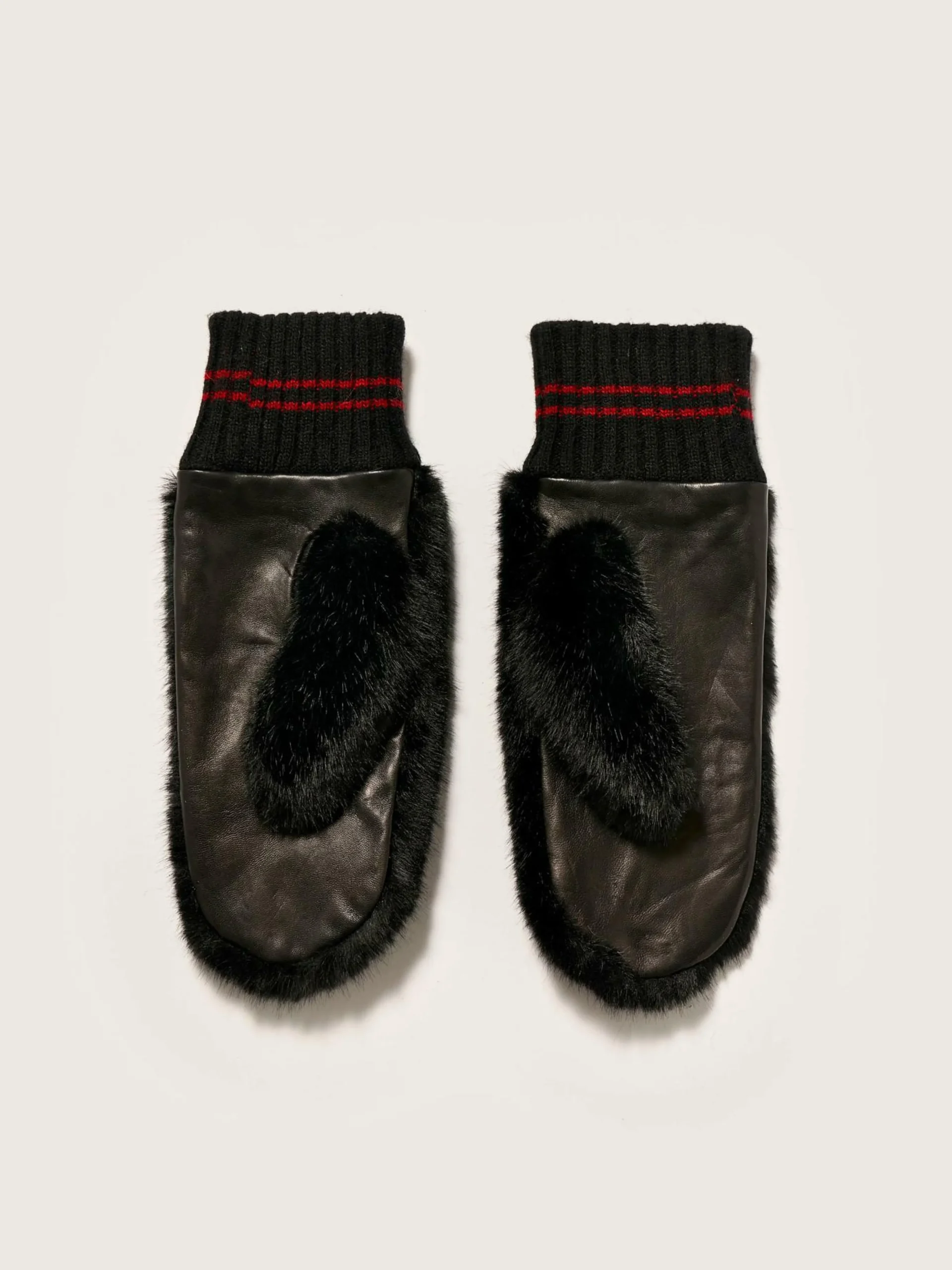 Moufles en fausse fourrure noire avec dos en cuir et détails en maille côtelée aux poignets.