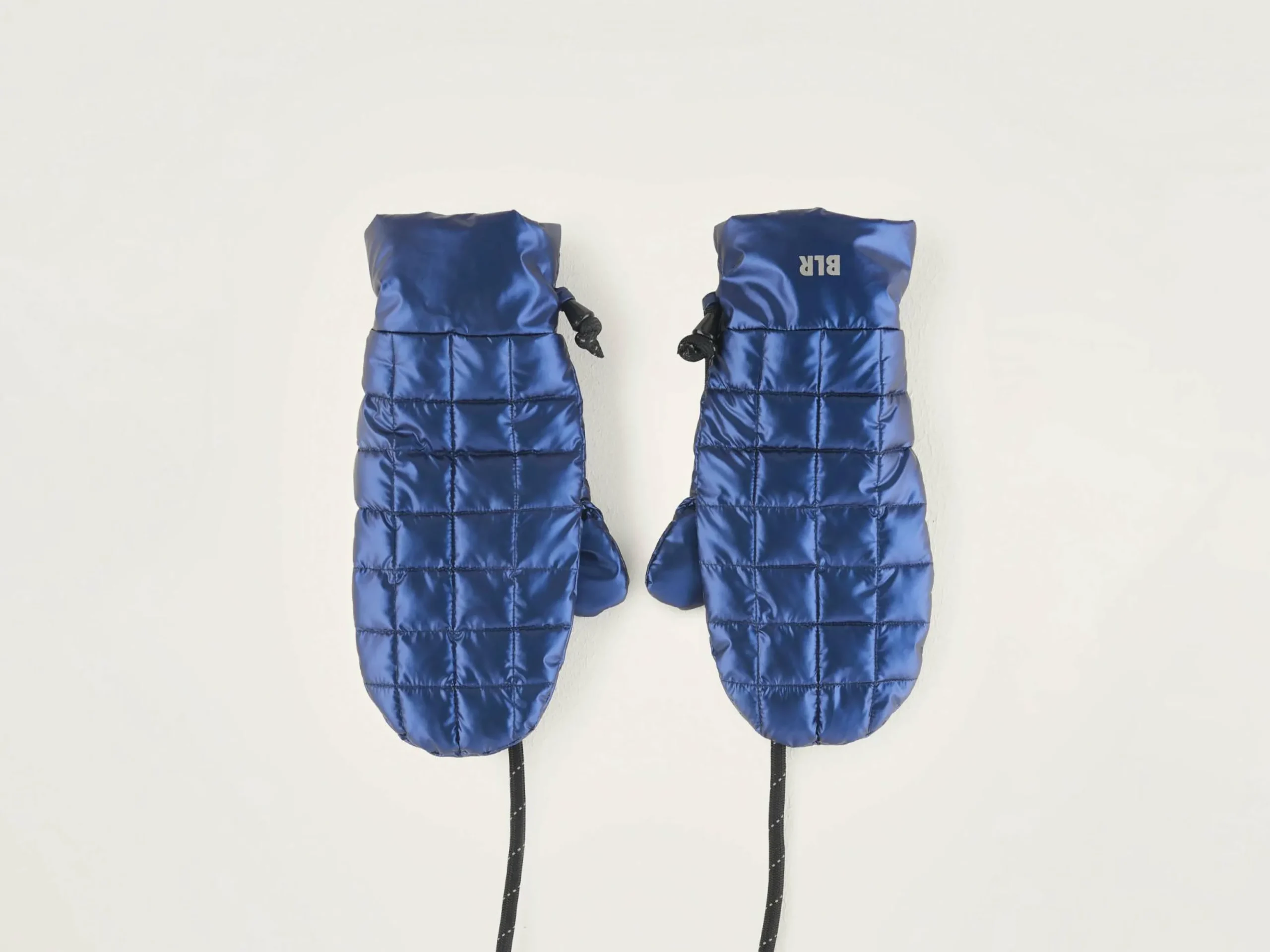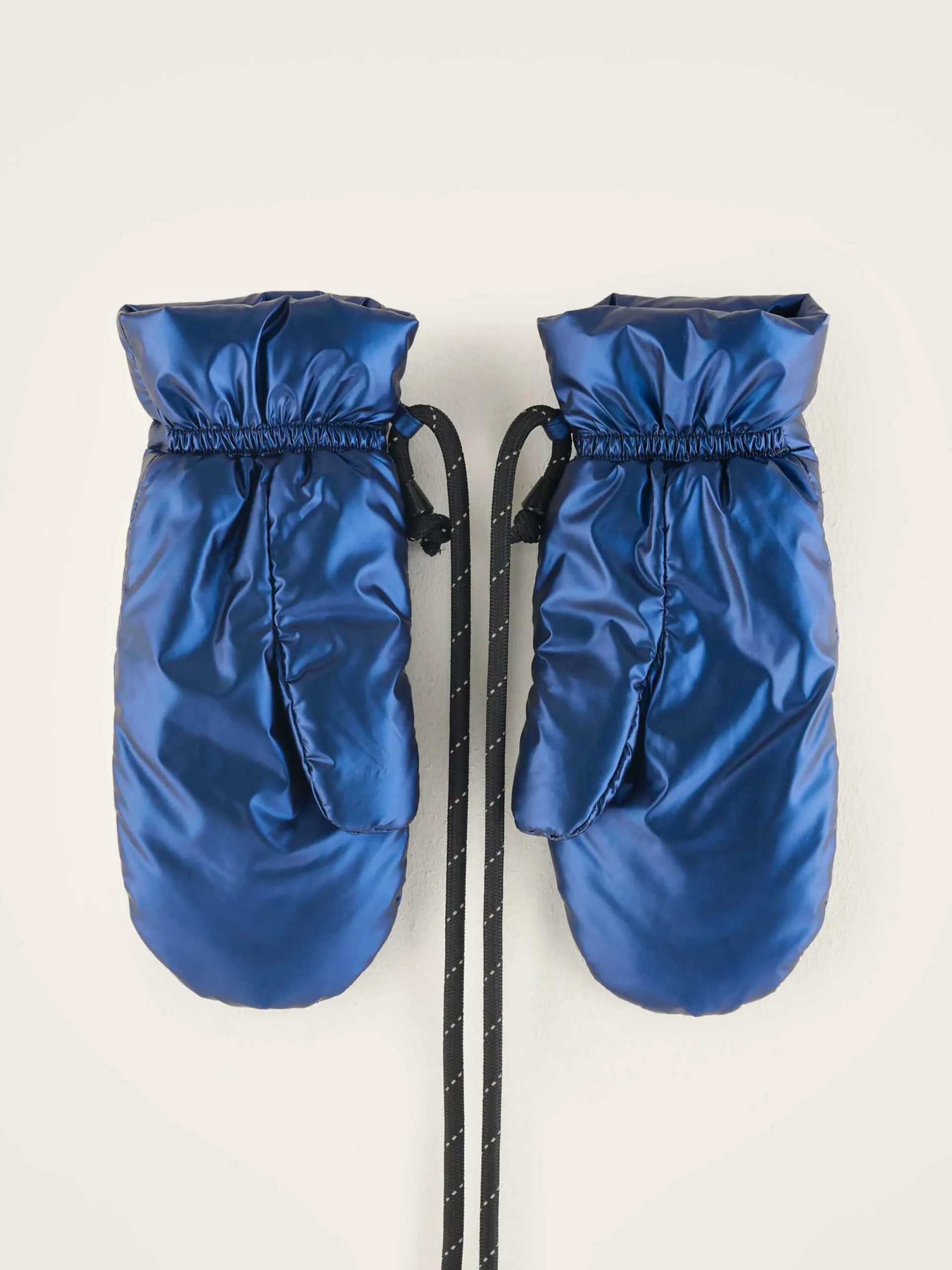 Moufles rembourrées en nylon brillant bleu avec cordon amovible.