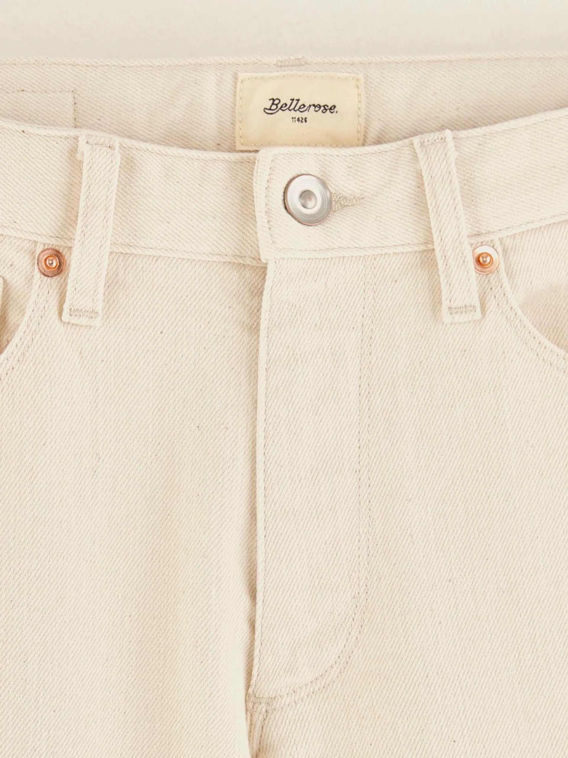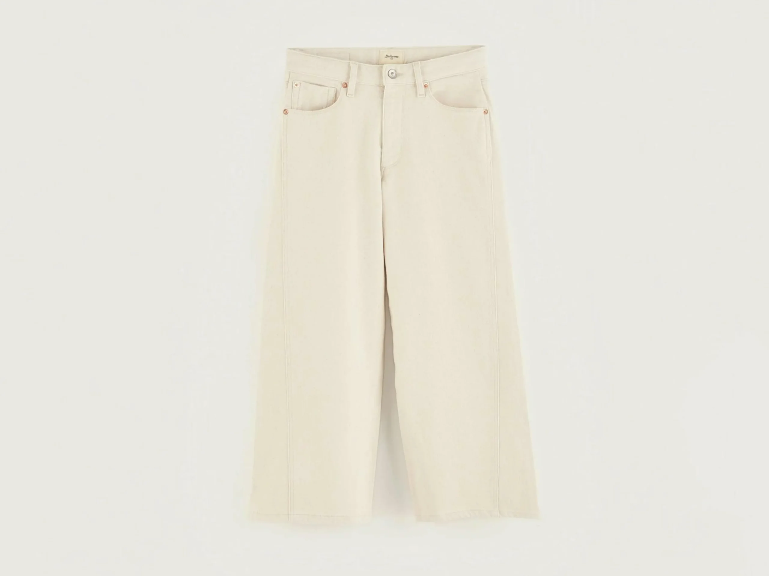 Pantalon taille basse, jambes flared, couleur écru.
