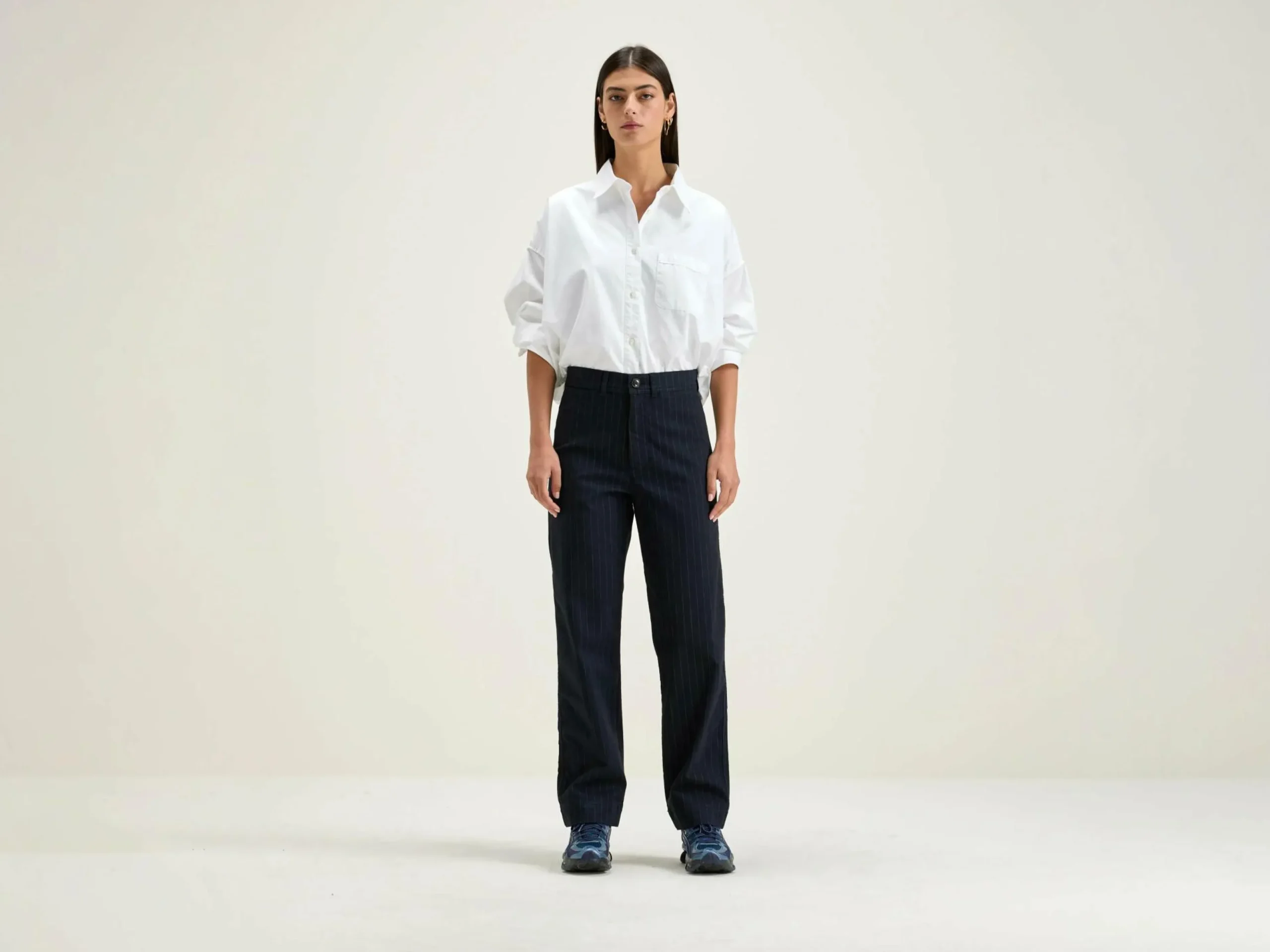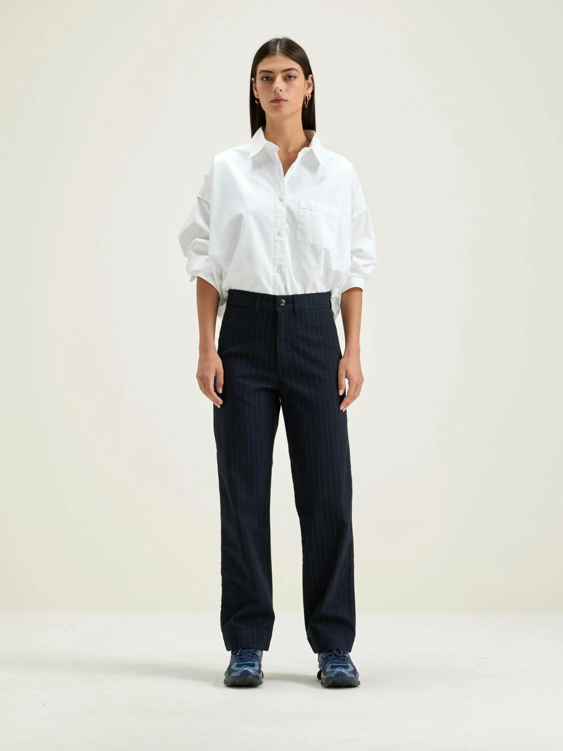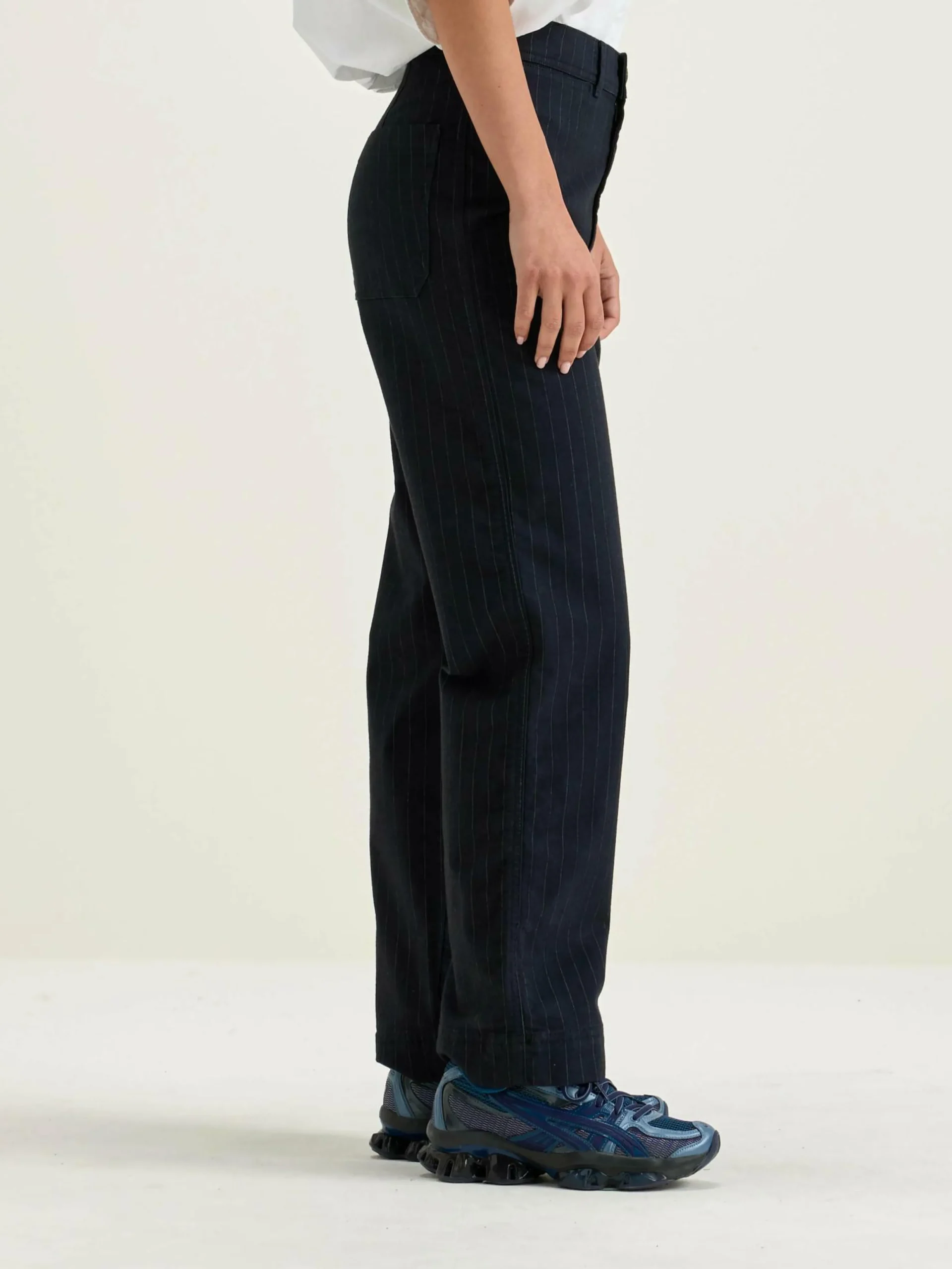 Pantalon noir ajusté à jambe droite, taille haute, à rayures classiques.