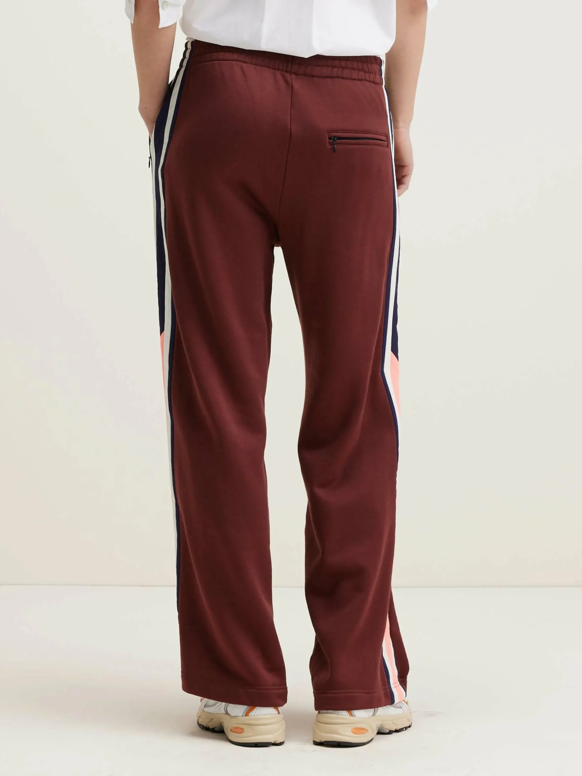 Jogging taille haute bordeaux avec bandes latérales contrastées.