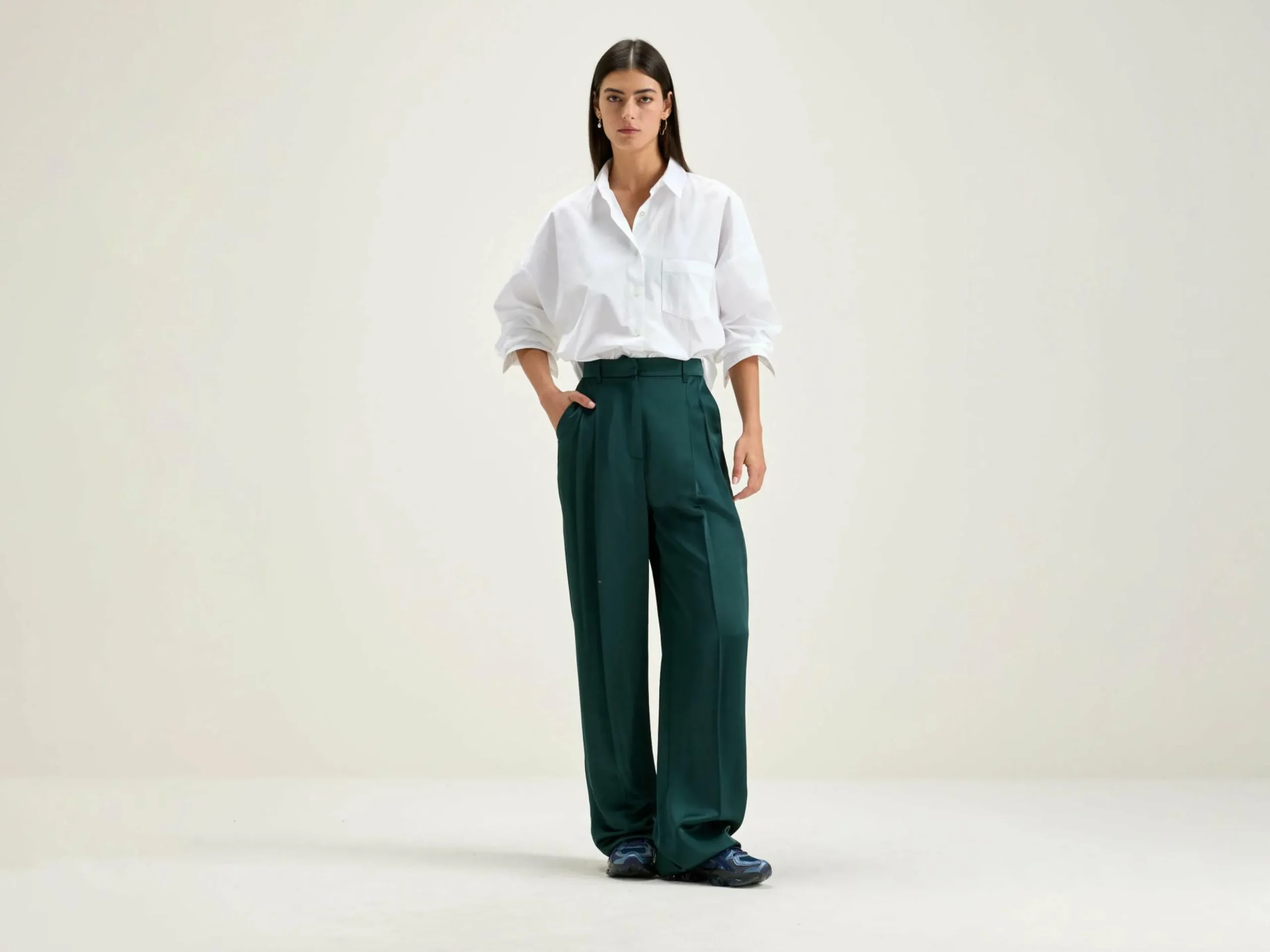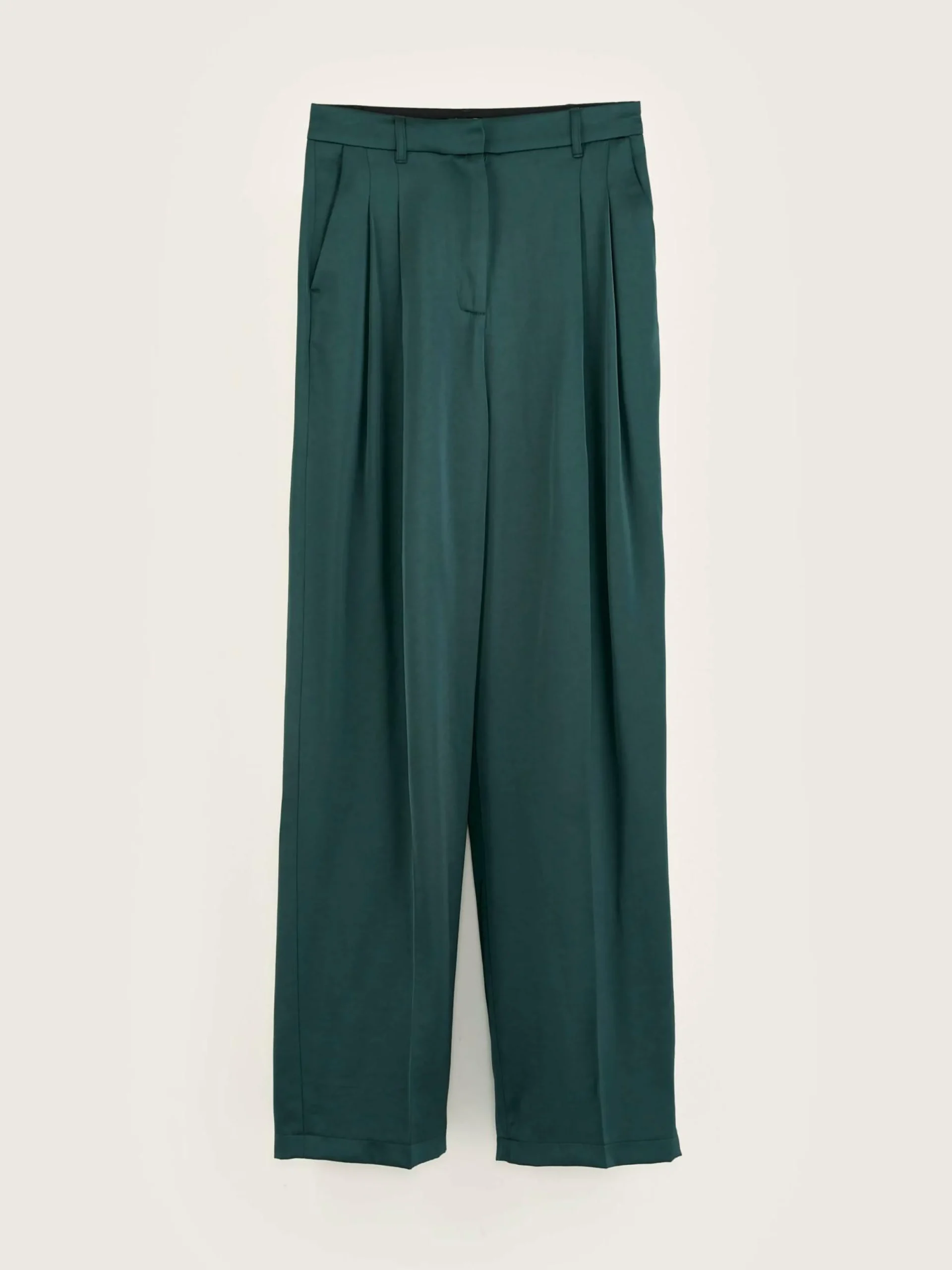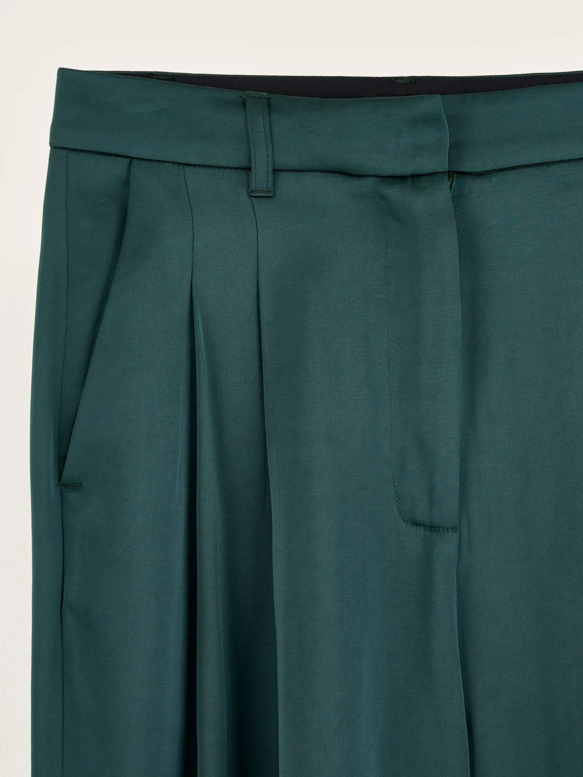 Pantalon taille haute style tailleur avec plis sur l’avant et jambes larges, couleur vert foncé.