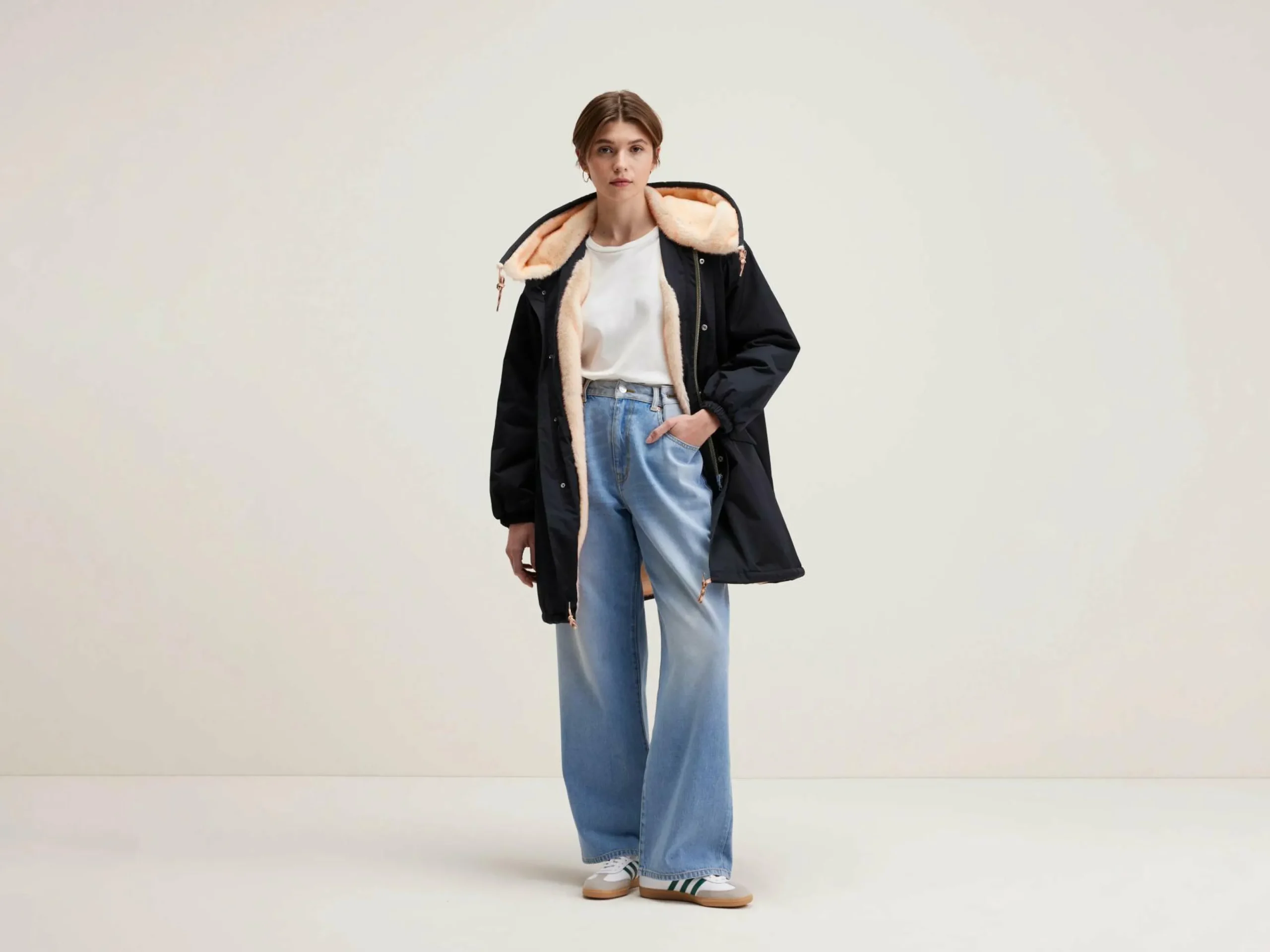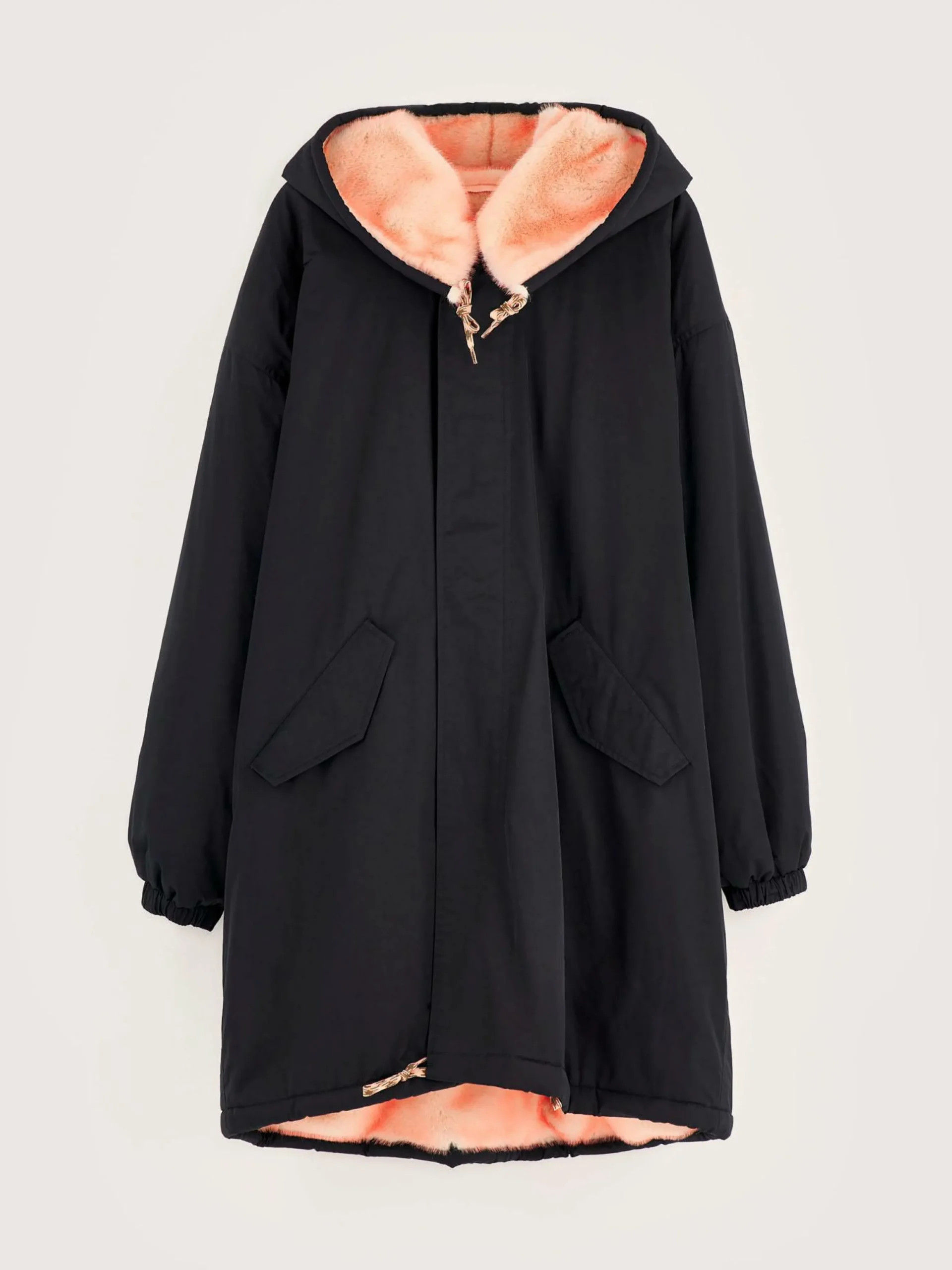 Parka oversize en toile off-black doublée de fausse fourrure écrue.