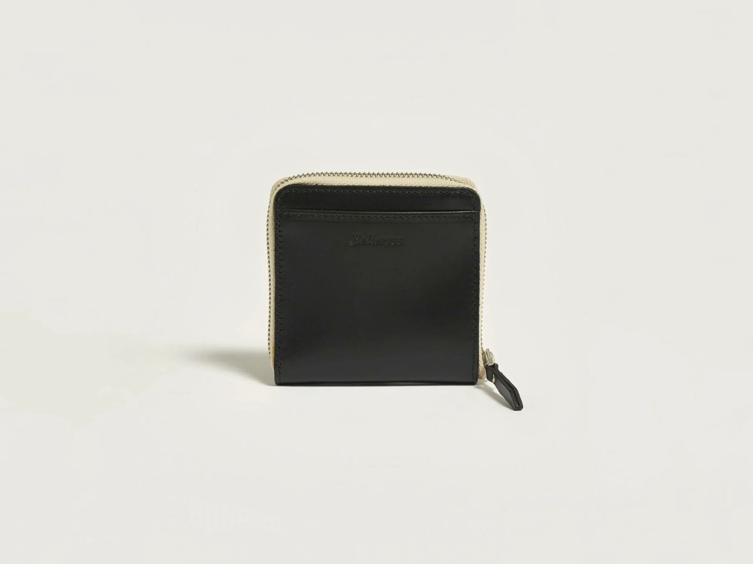 Portefeuille carré zippé en cuir lisse noir avec plusieurs fentes pour cartes et une poche à monnaie.