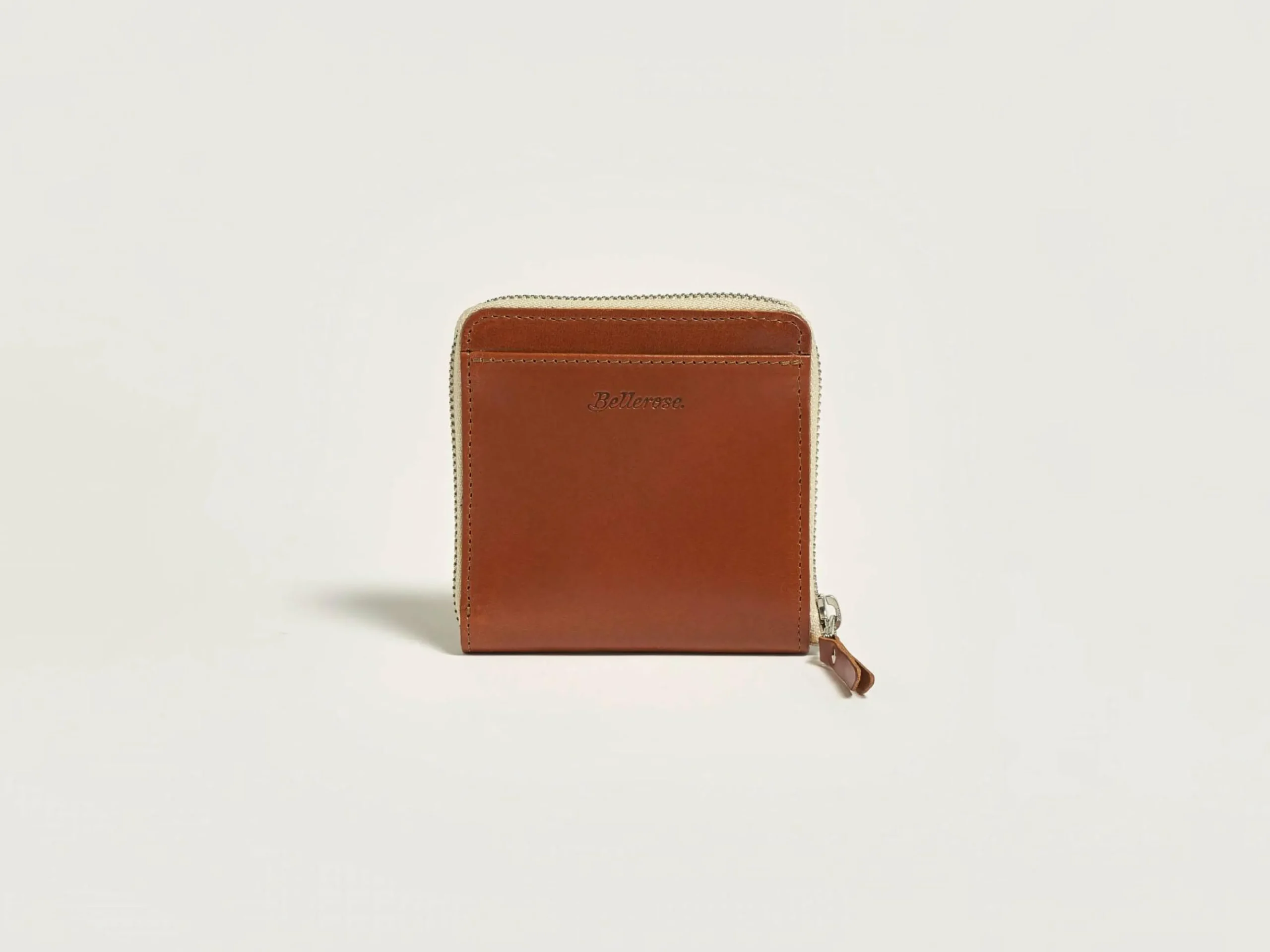 Portefeuille carré zippé en cuir lisse cognac avec plusieurs fentes pour cartes et une poche à monnaie.