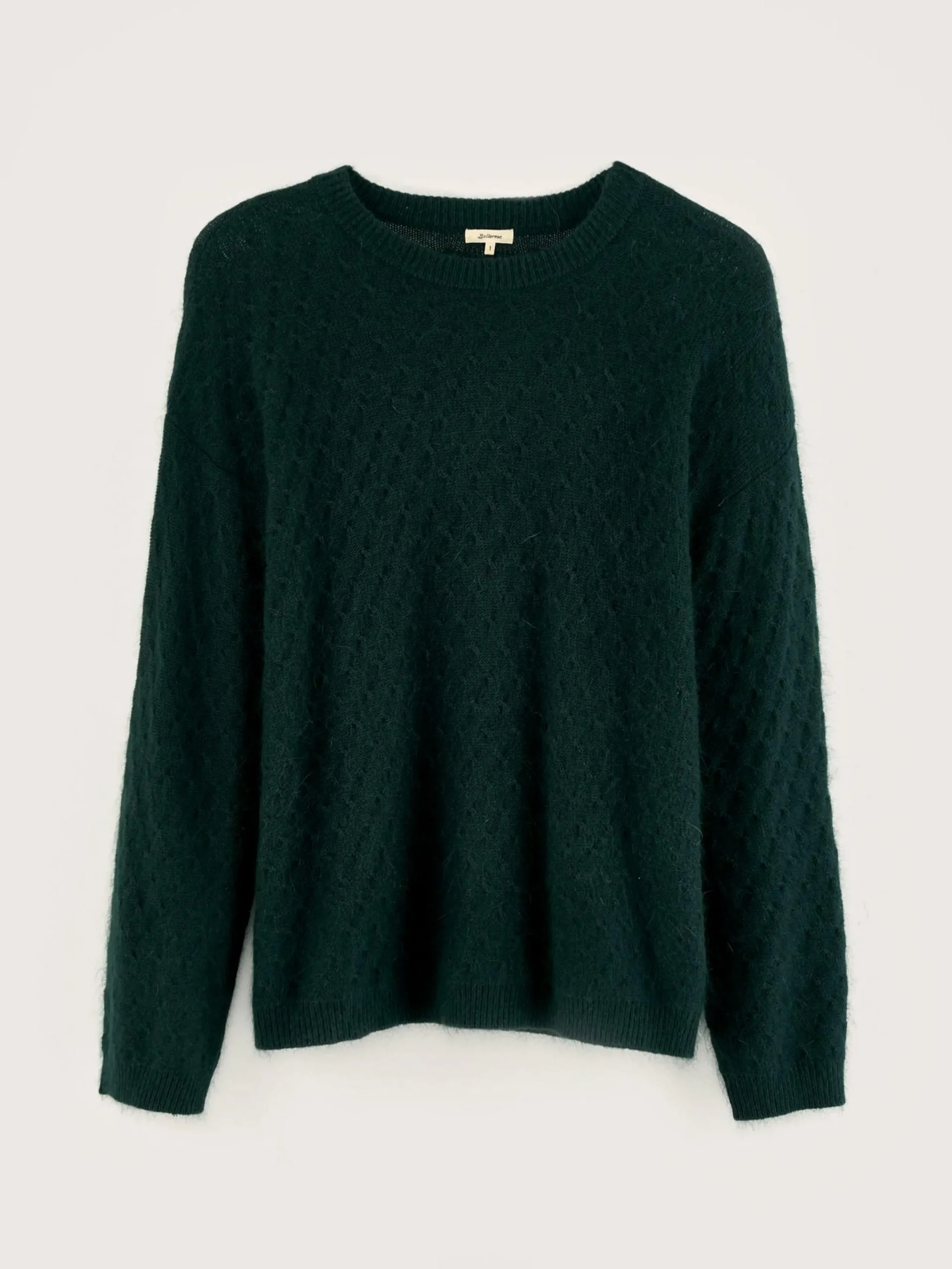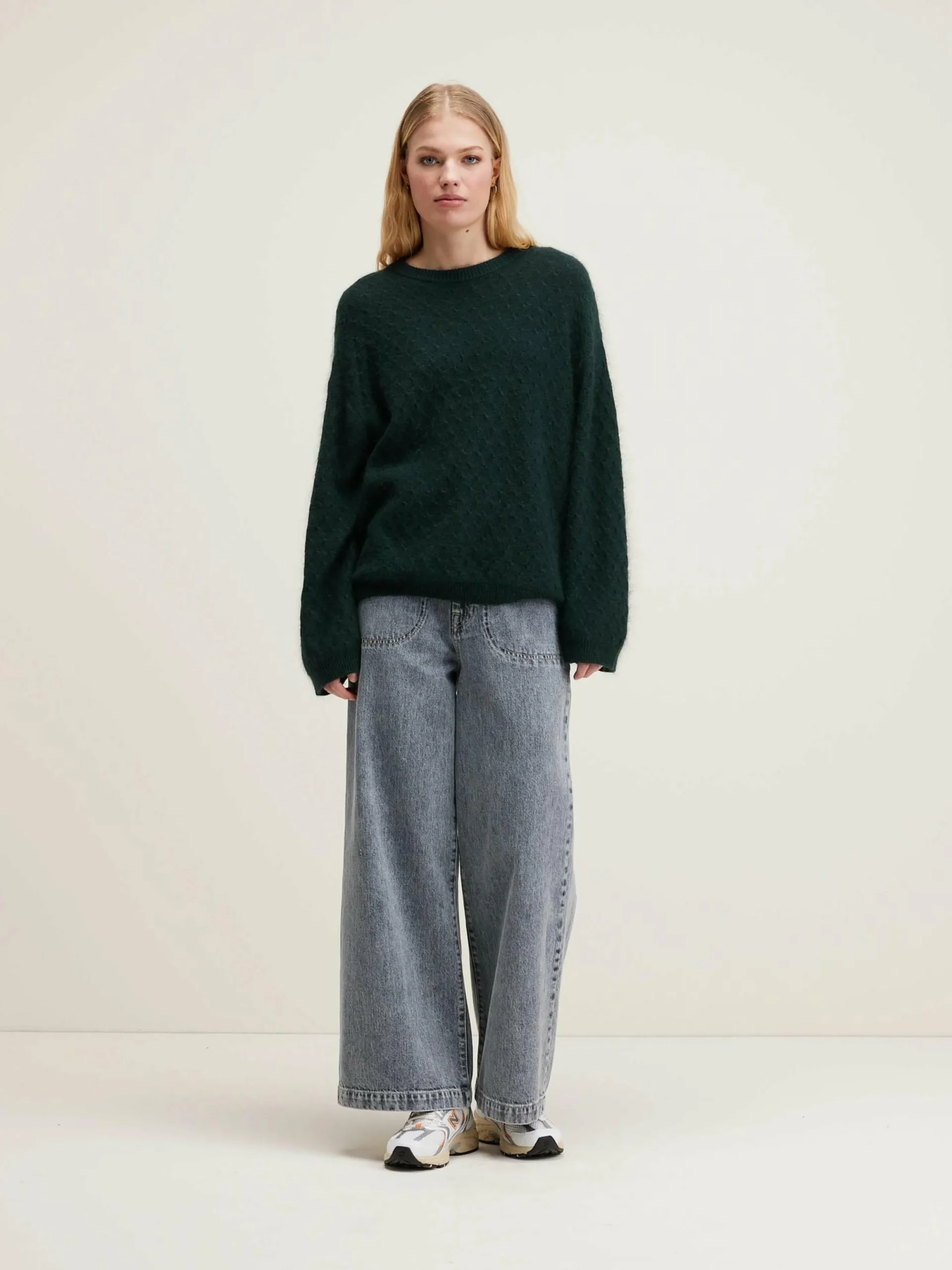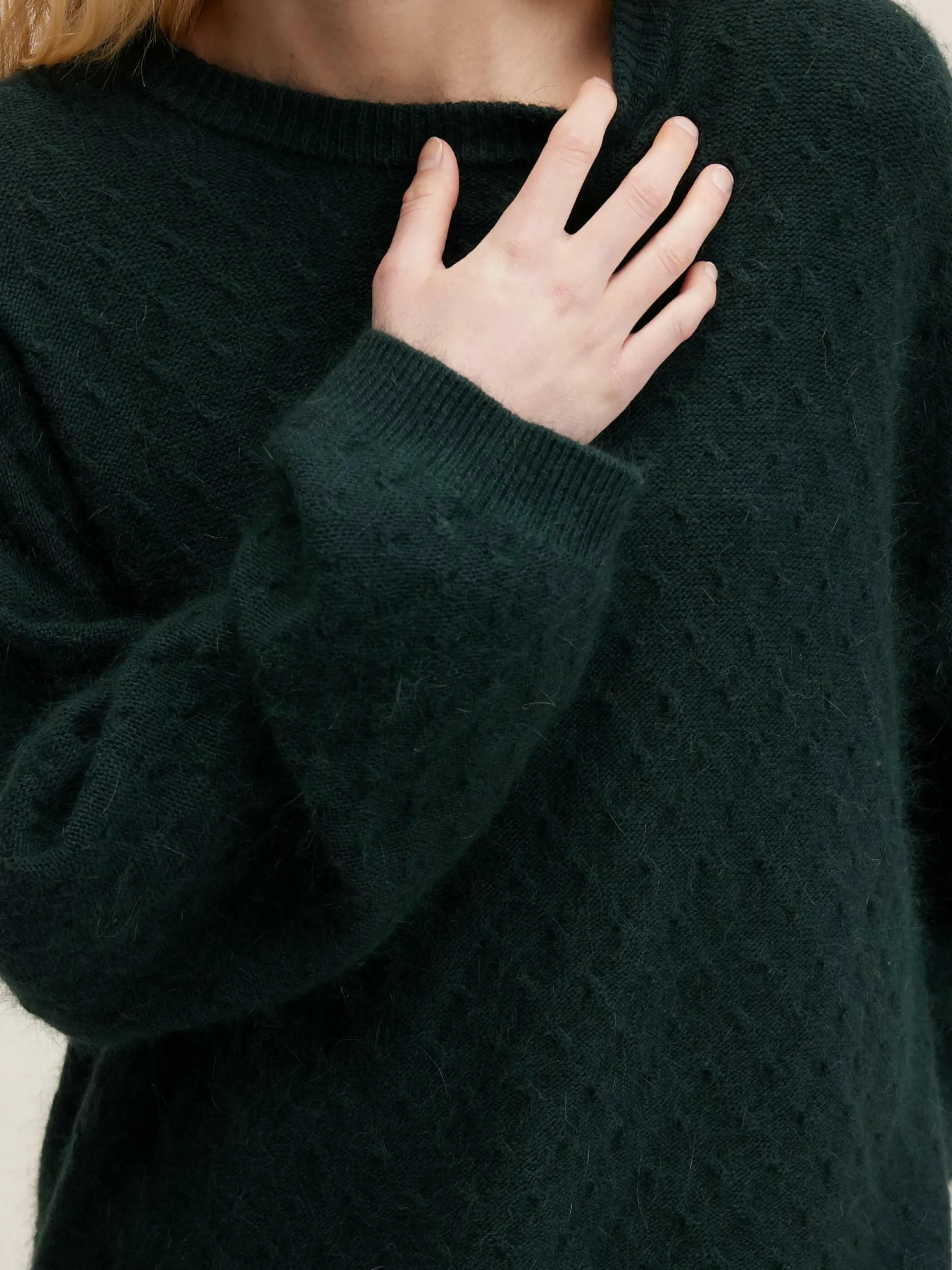 Pull en angora vert bouteille à col rond et coupe décontractée.