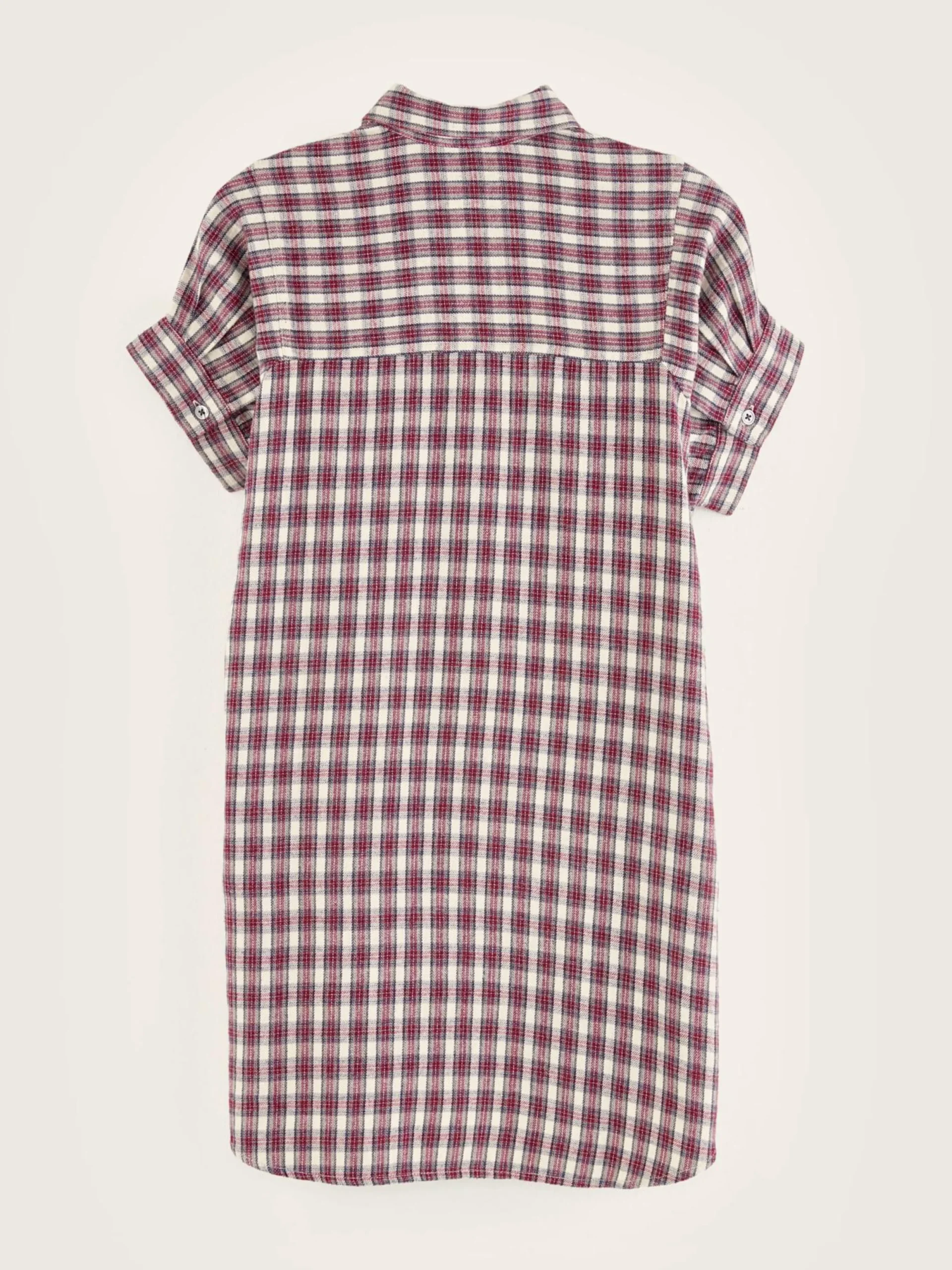 Mini robe chemise à manches roulotées en coton brossé à carreaux bordeaux et blanc.