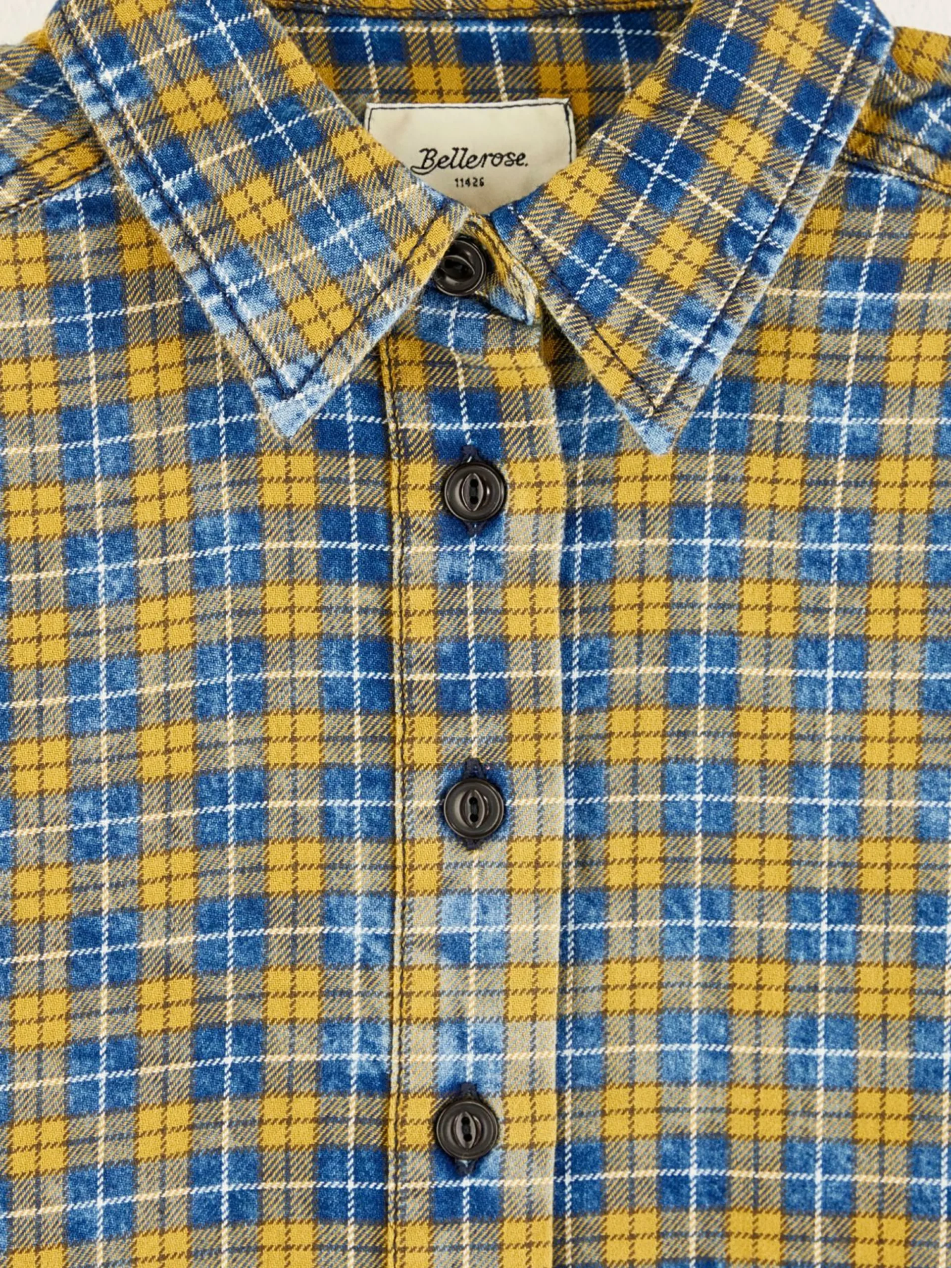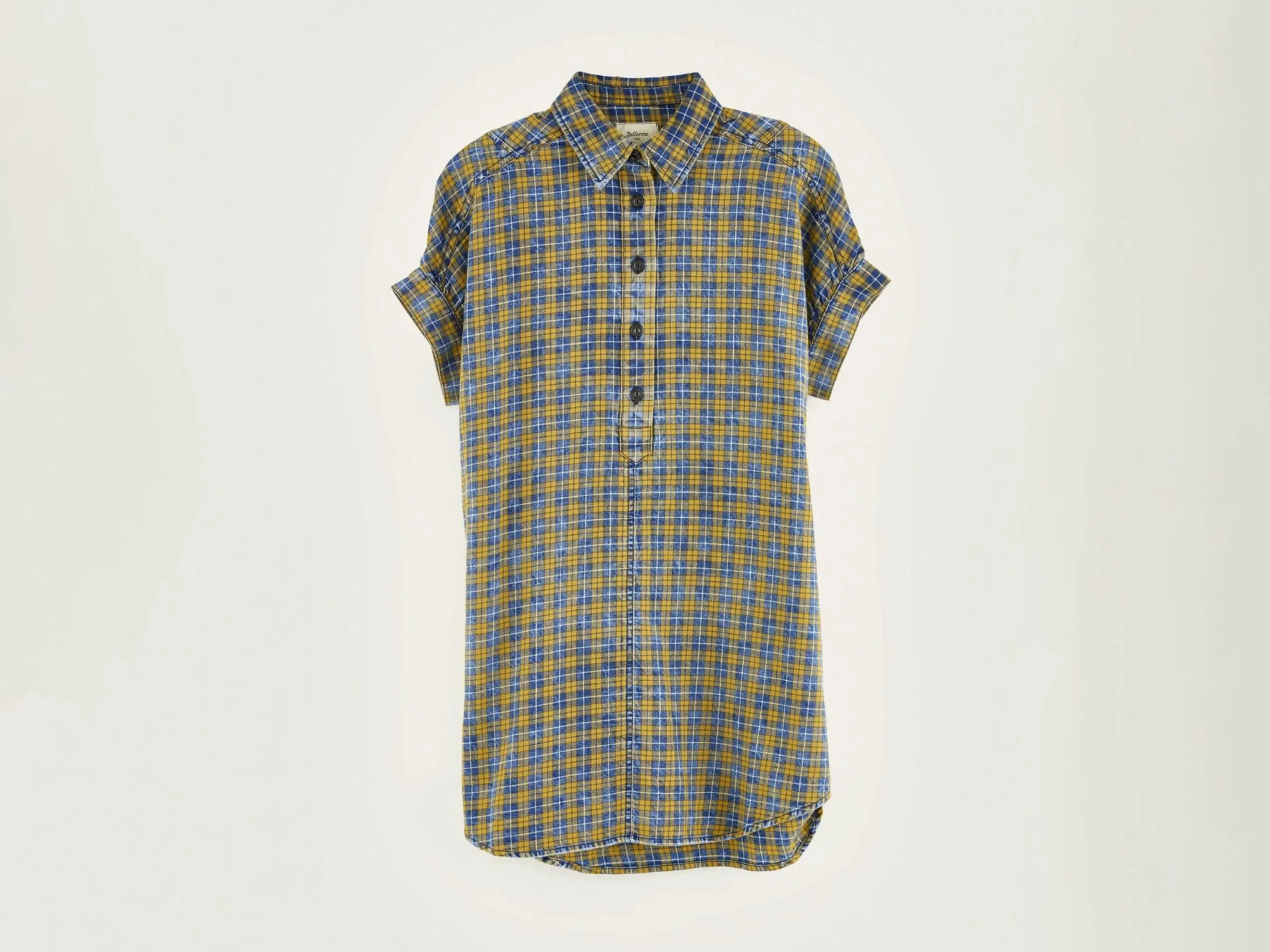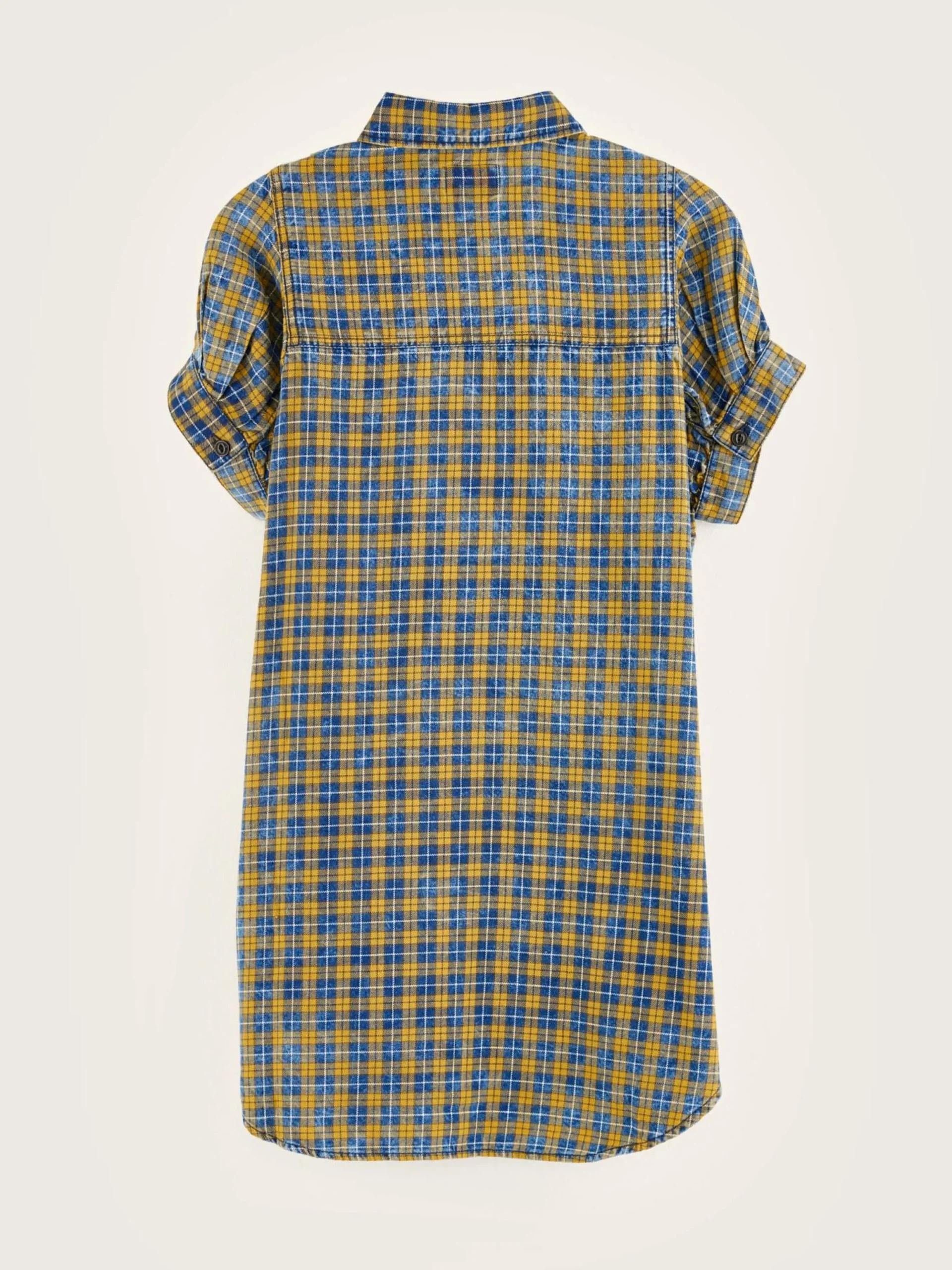 Robe chemise courte à manches retroussées en coton à carreaux indigo délavés.