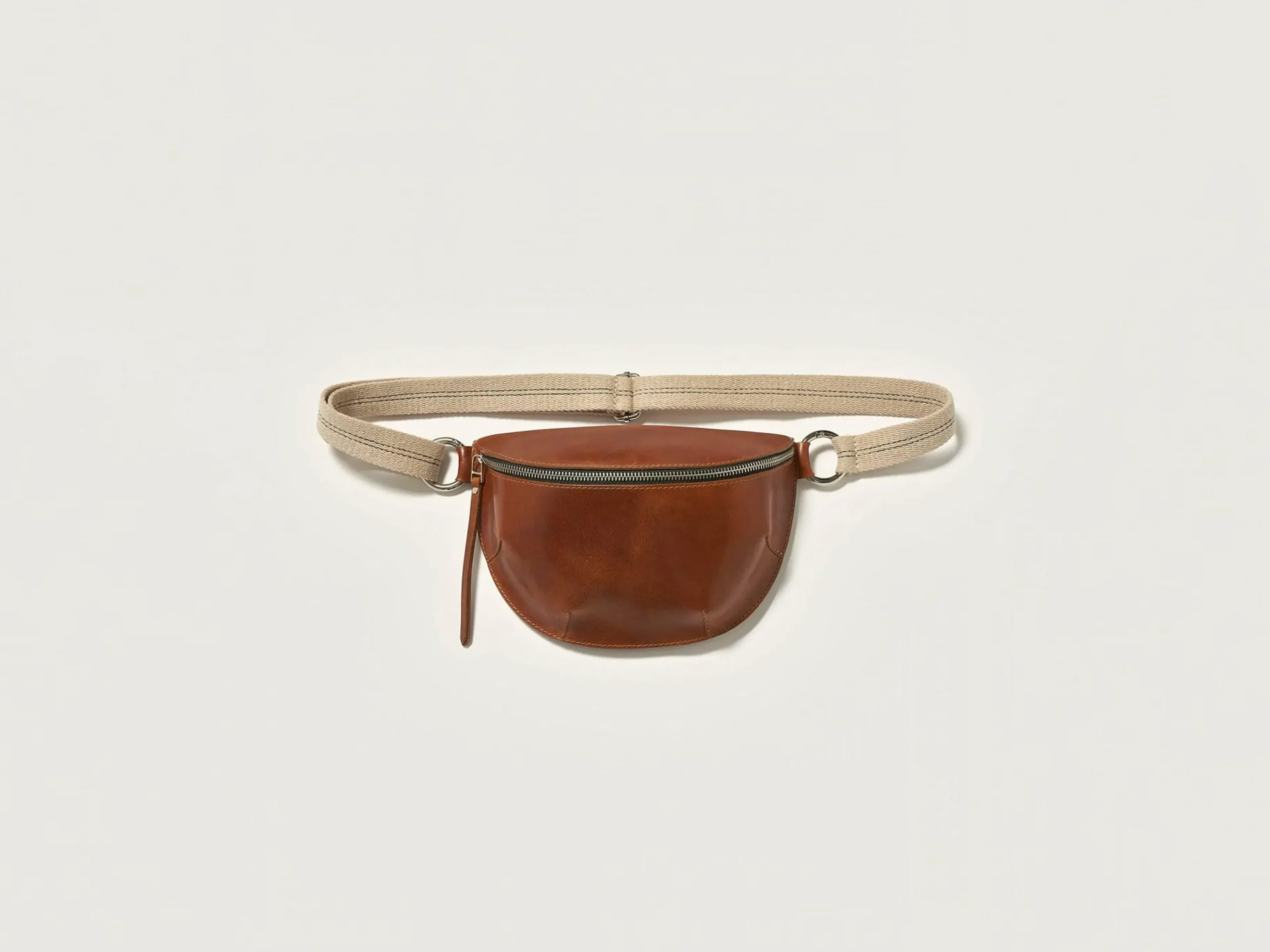 Sac en bandoulière en forme de demi-lune en cuir lisse cognac.