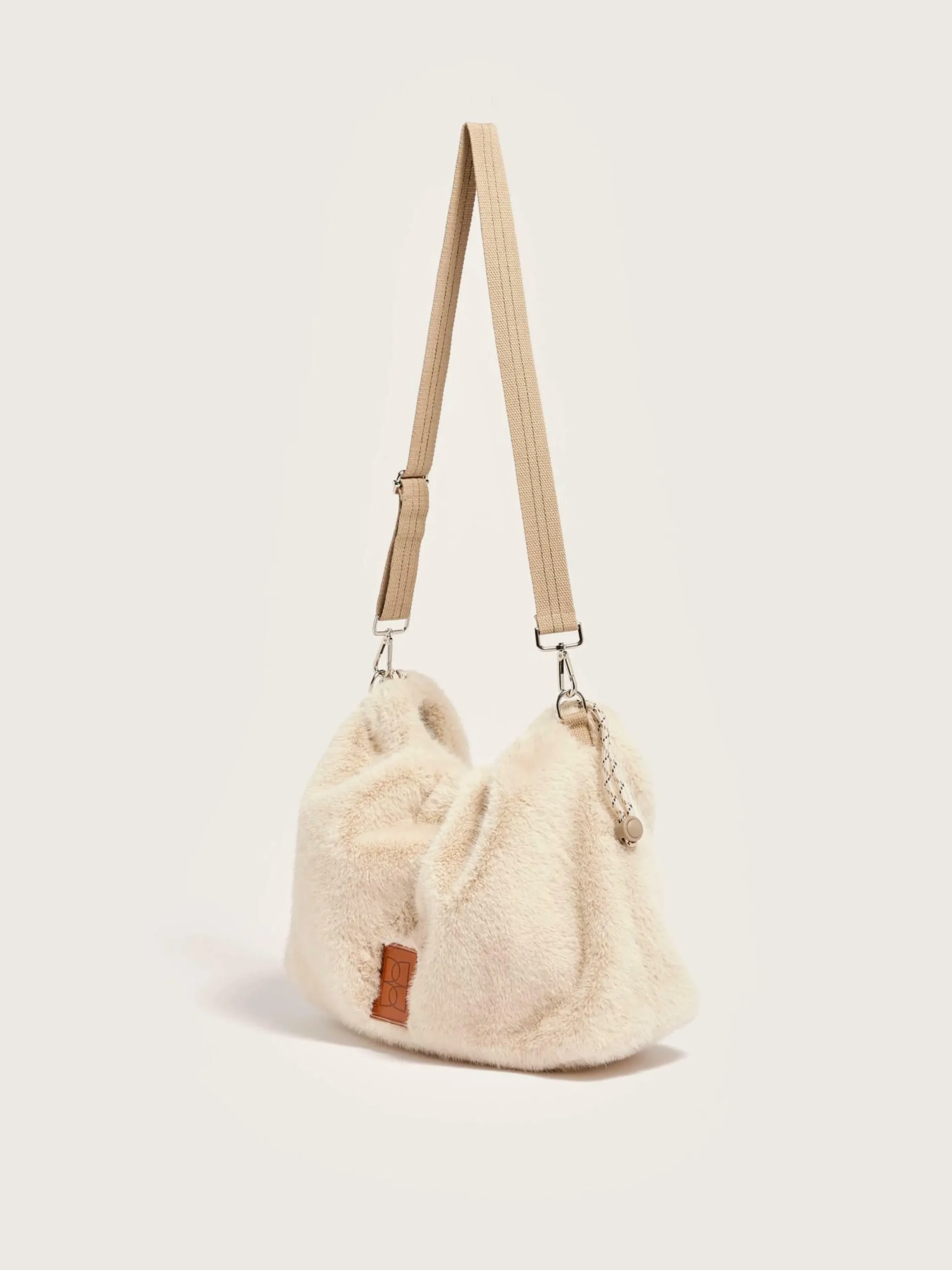 Sac berlingo en fausse fourrure écrue avec fermeture par zip et bandoulière amovible.