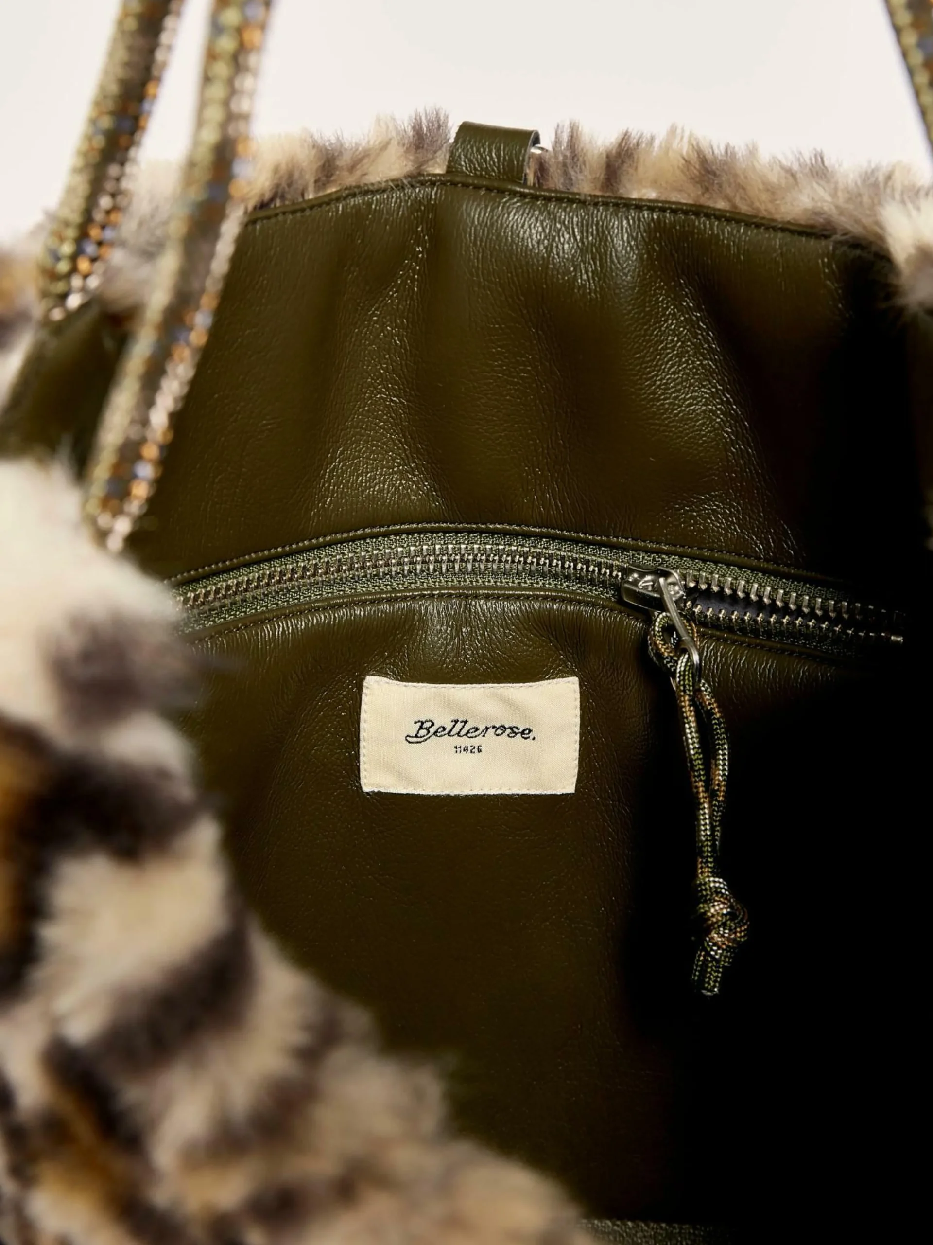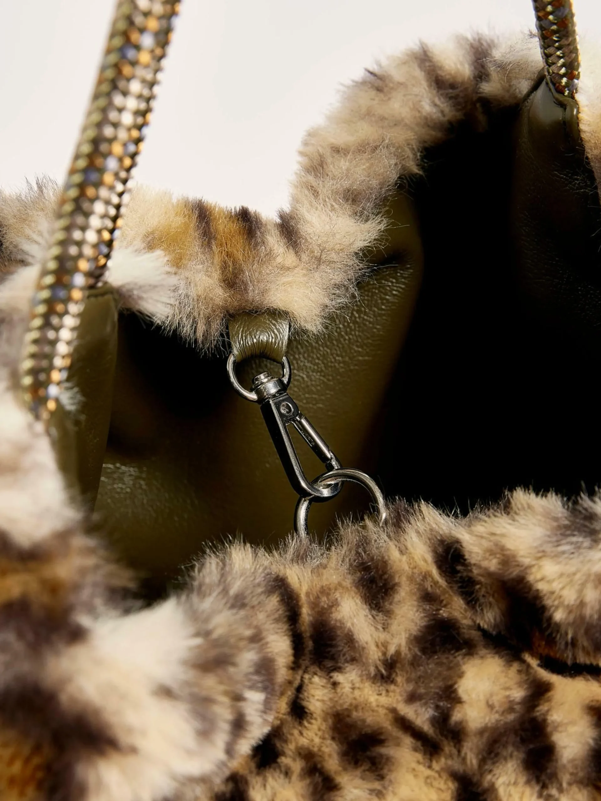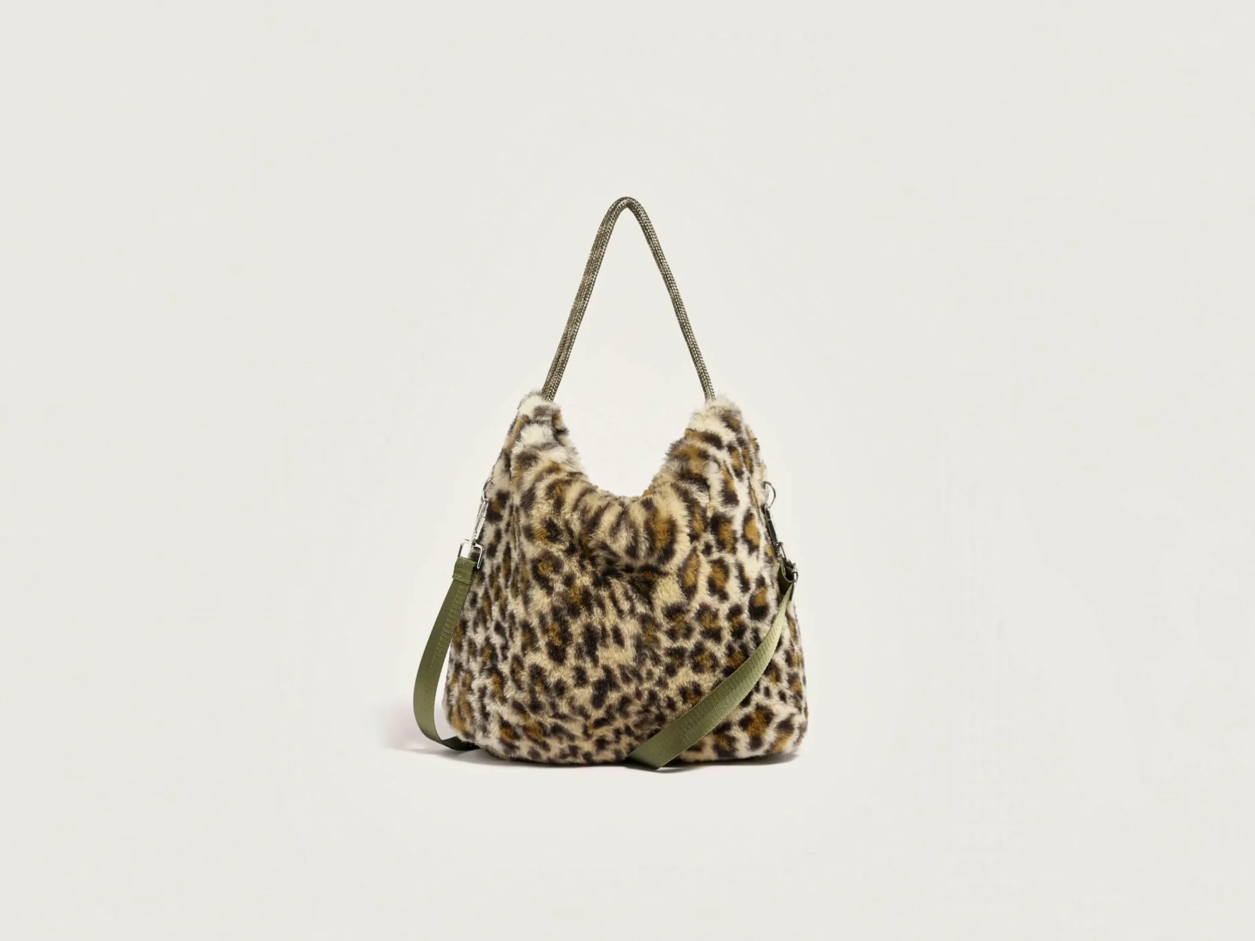 Sac réversible à bandoulière amovible. Un côté en fausse fourrure imprimée léopard et l’autre en simili cuir kaki.