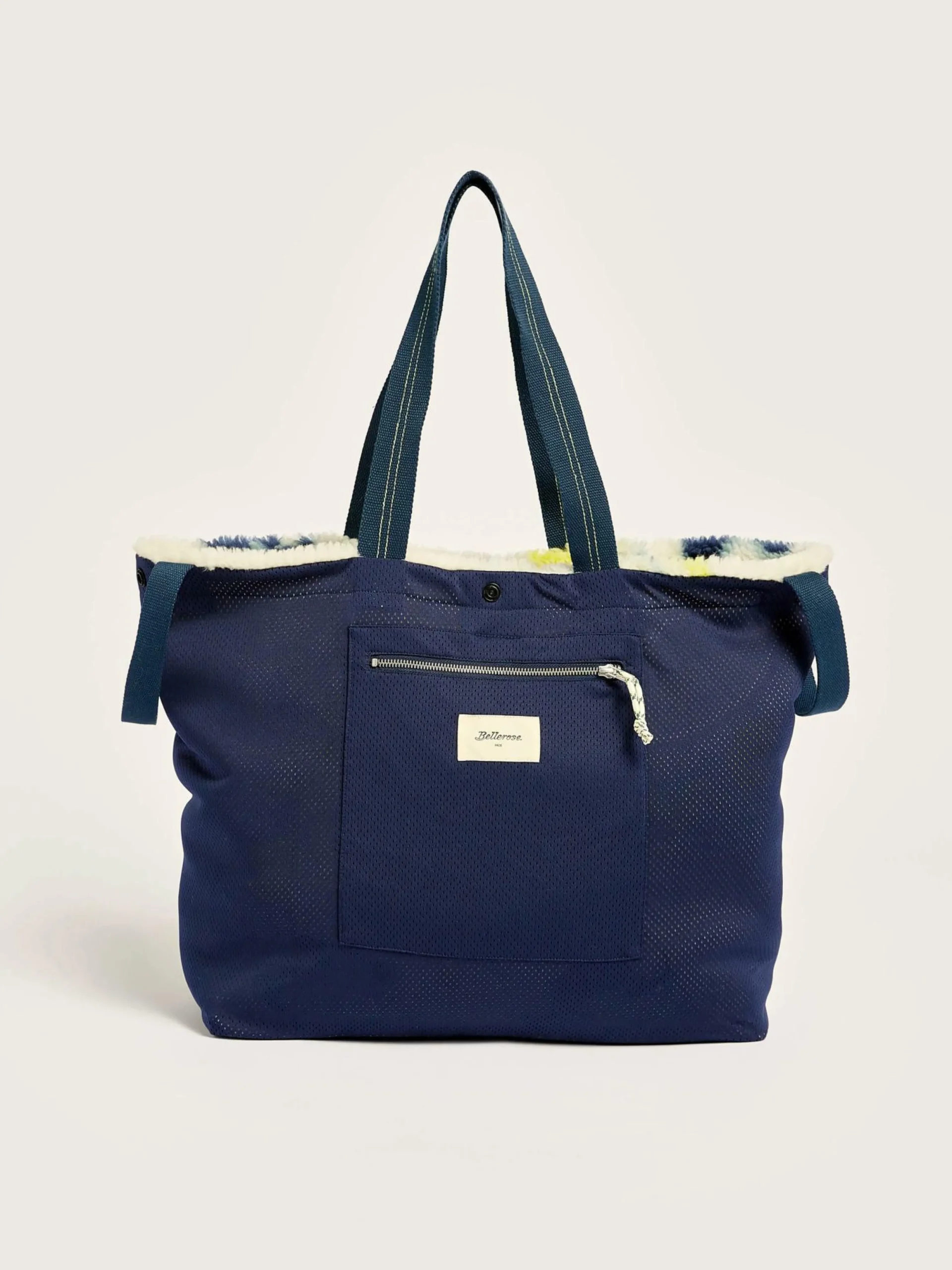 Sac à main à double fermeture en fausse fourrure imprimée de fleurs géantes et doublé de mesh bleu marine.