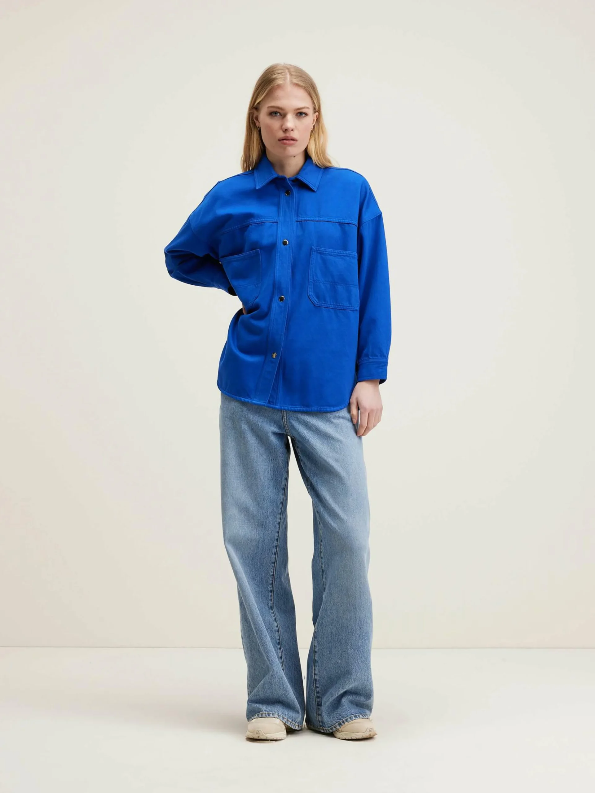 Surchemise ample en sergé de coton lazuli, avec un col classique et des larges poches plaquées.