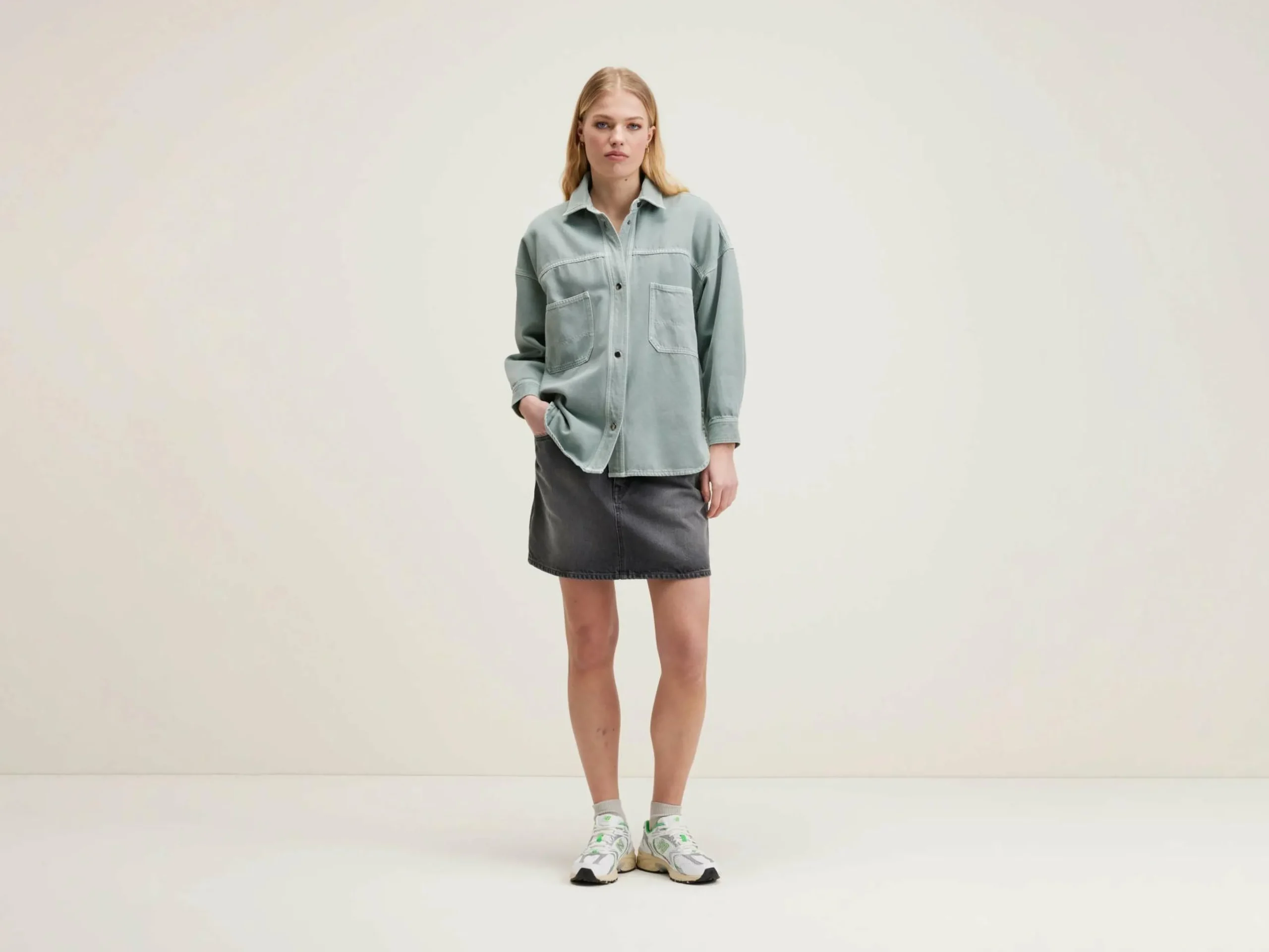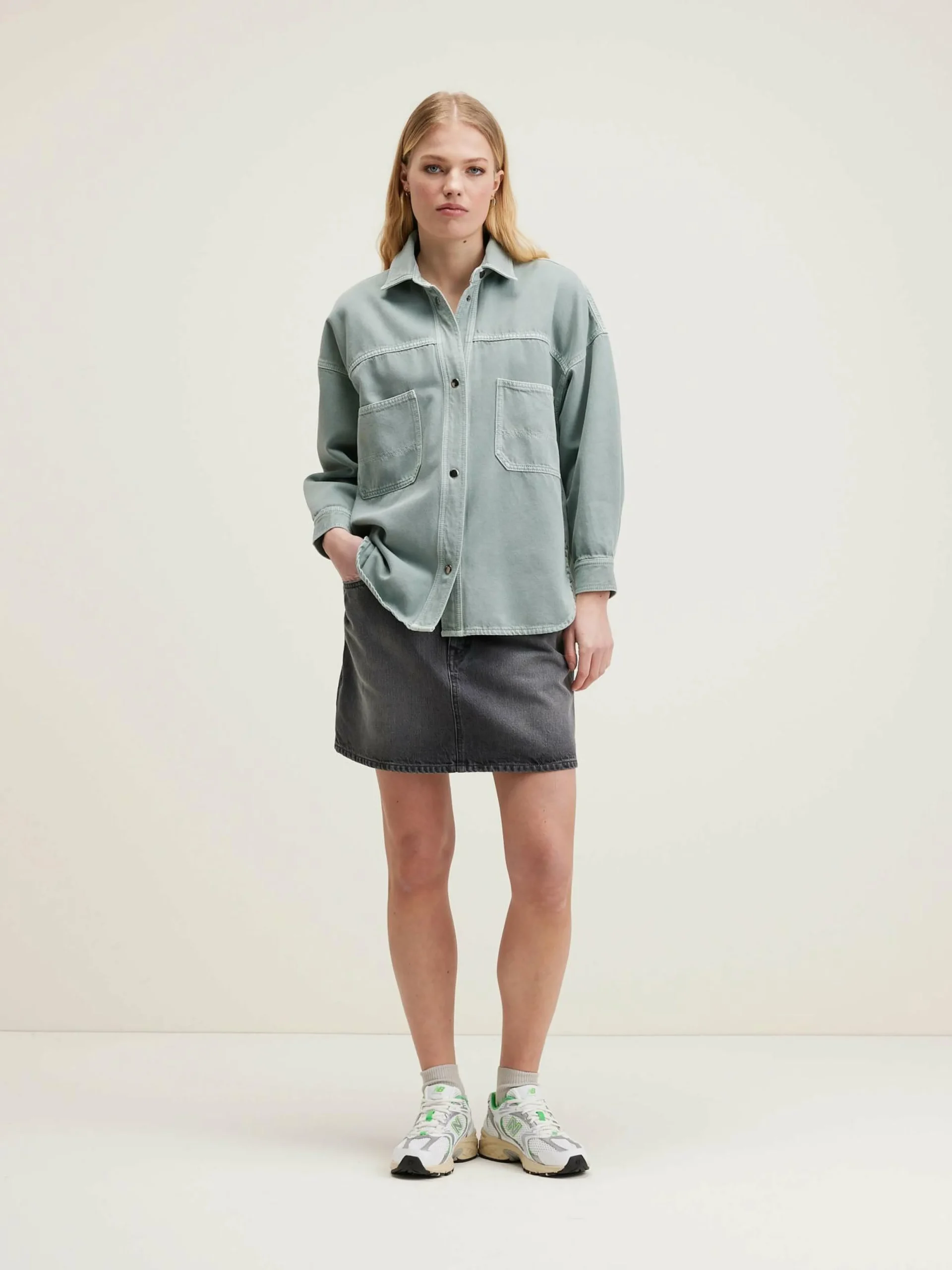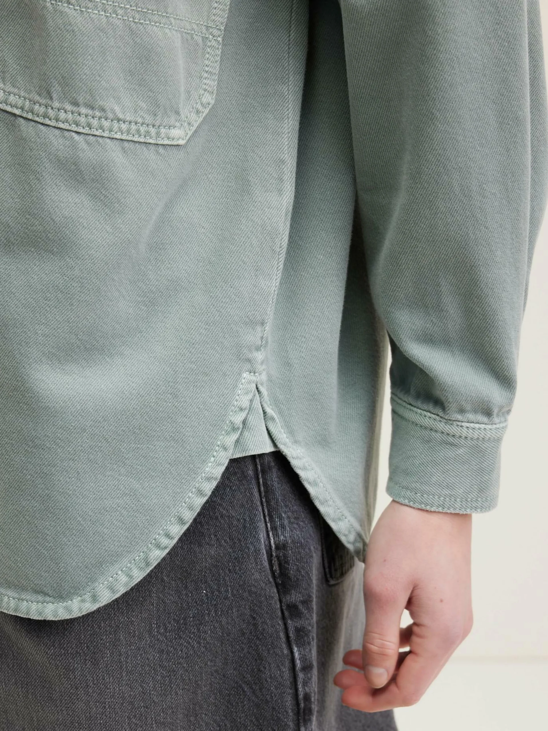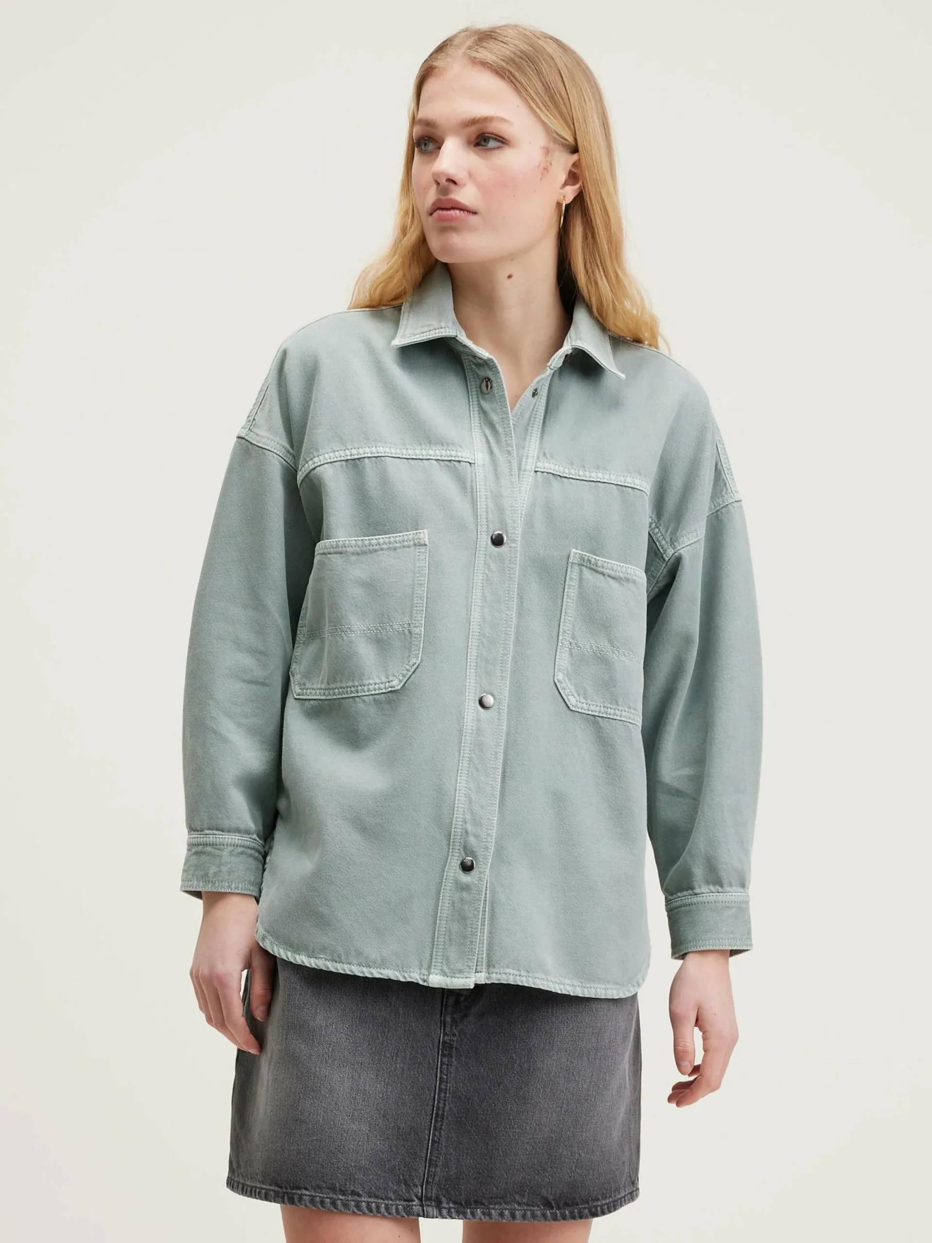 Surchemise ample en sergé de coton vert d’eau, avec un col classique et des larges poches plaquées.