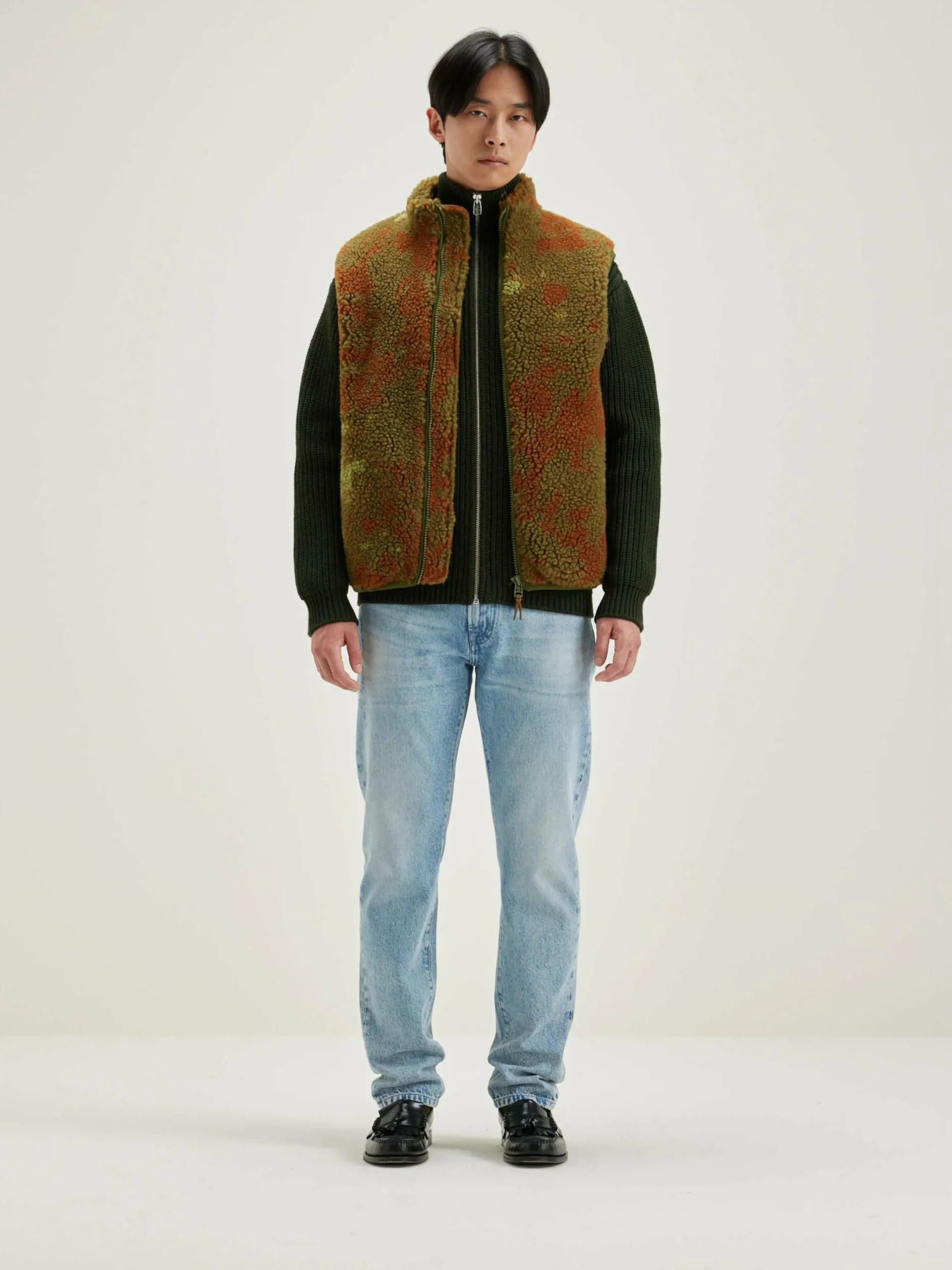 Sweatshirt zippé sans manches, coupe droite, confectionné en polaire imprimée camouflage.