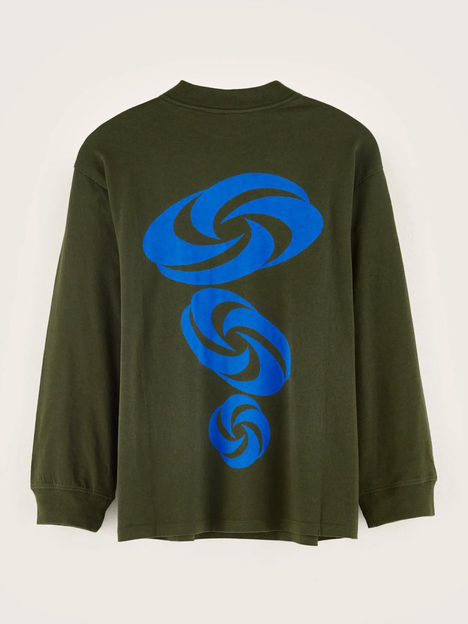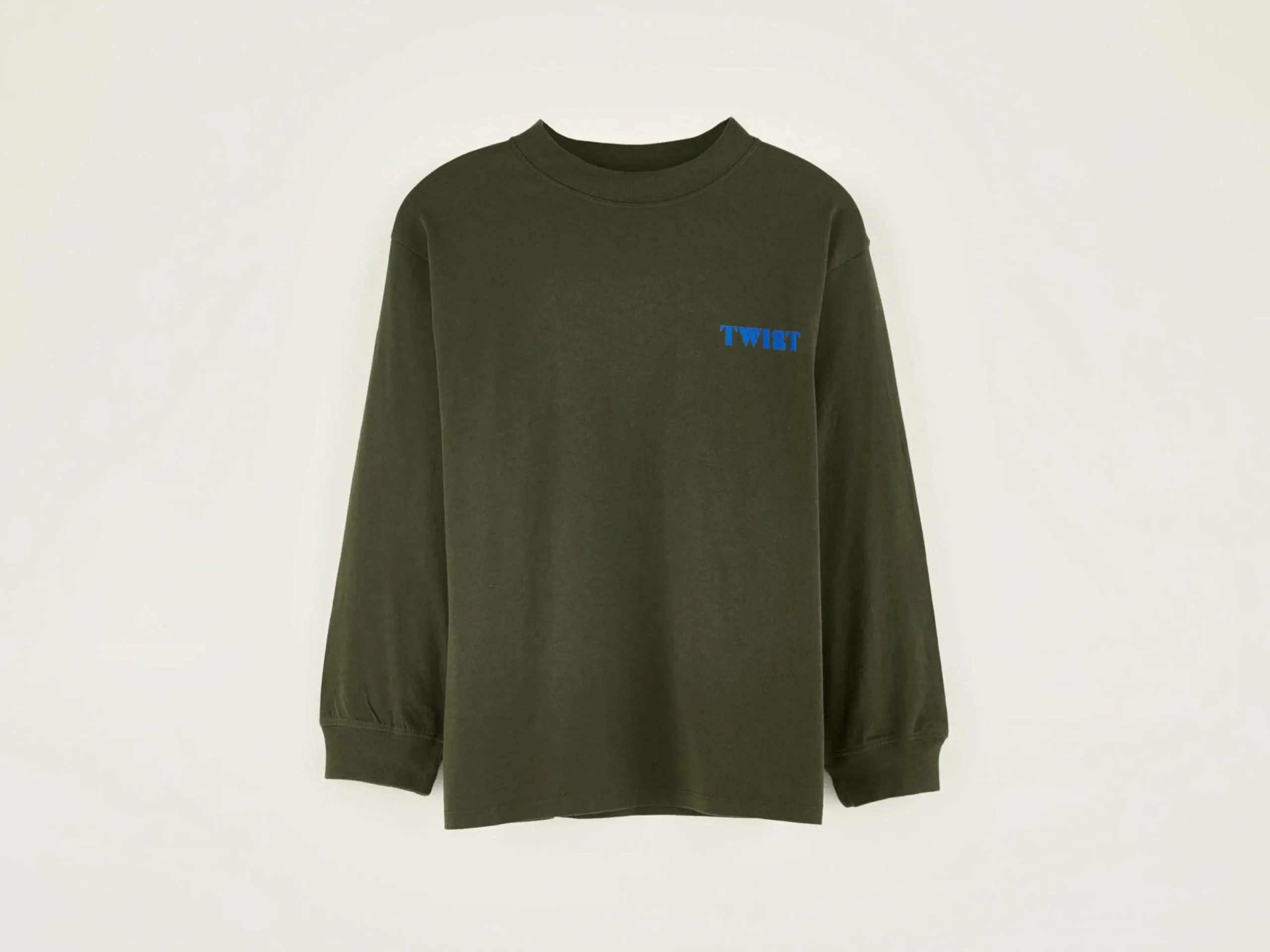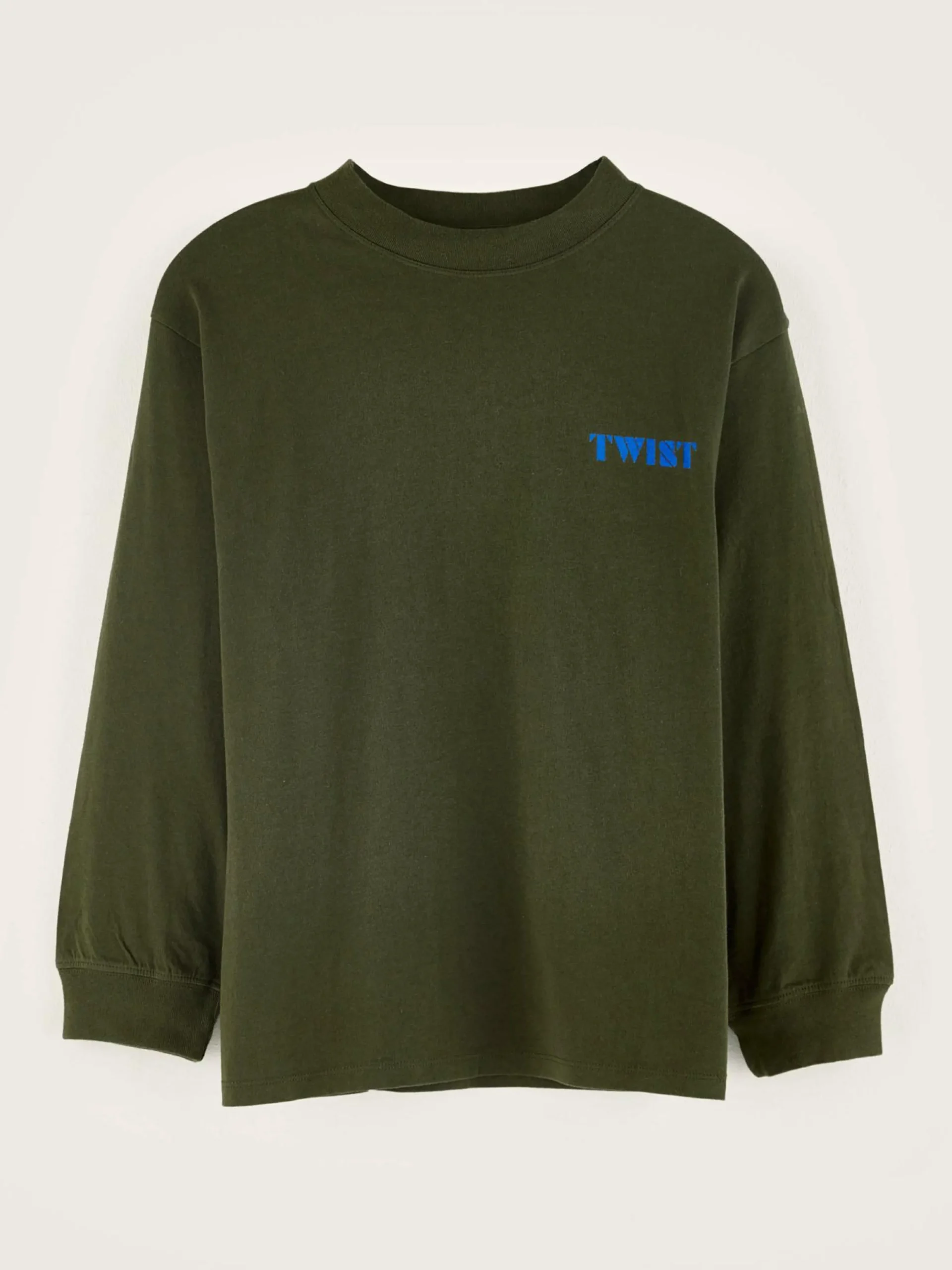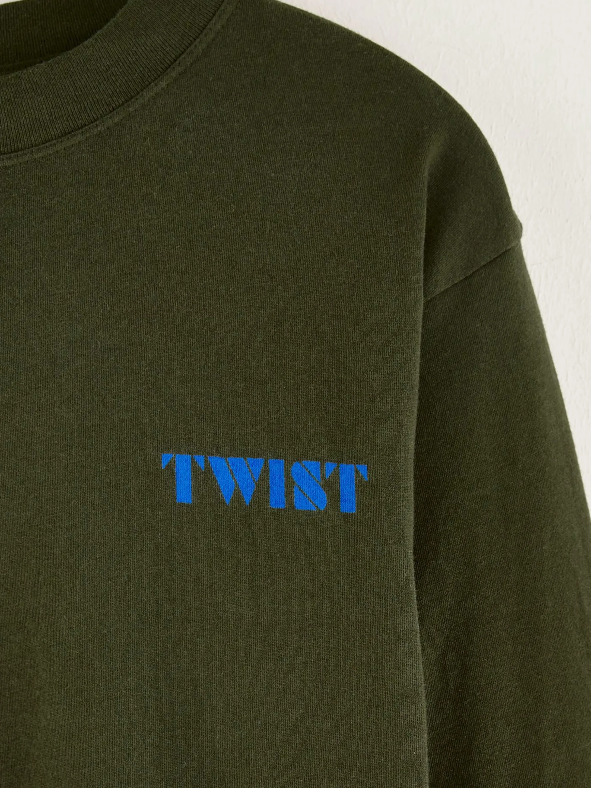 T-shirt décontracté en jersey de coton brossé couleur vert mousse avec impression « twist » sur le devant et le dos.