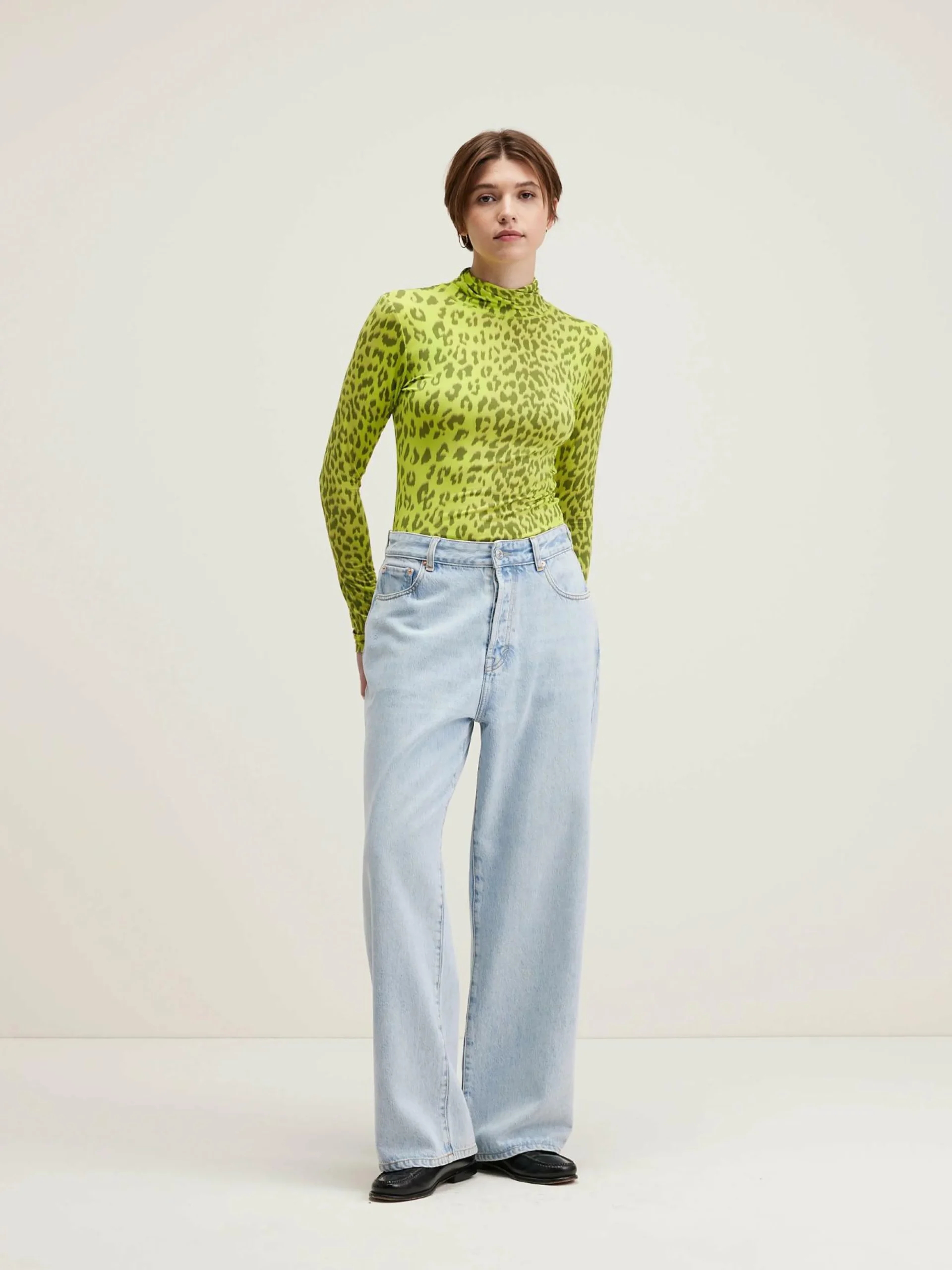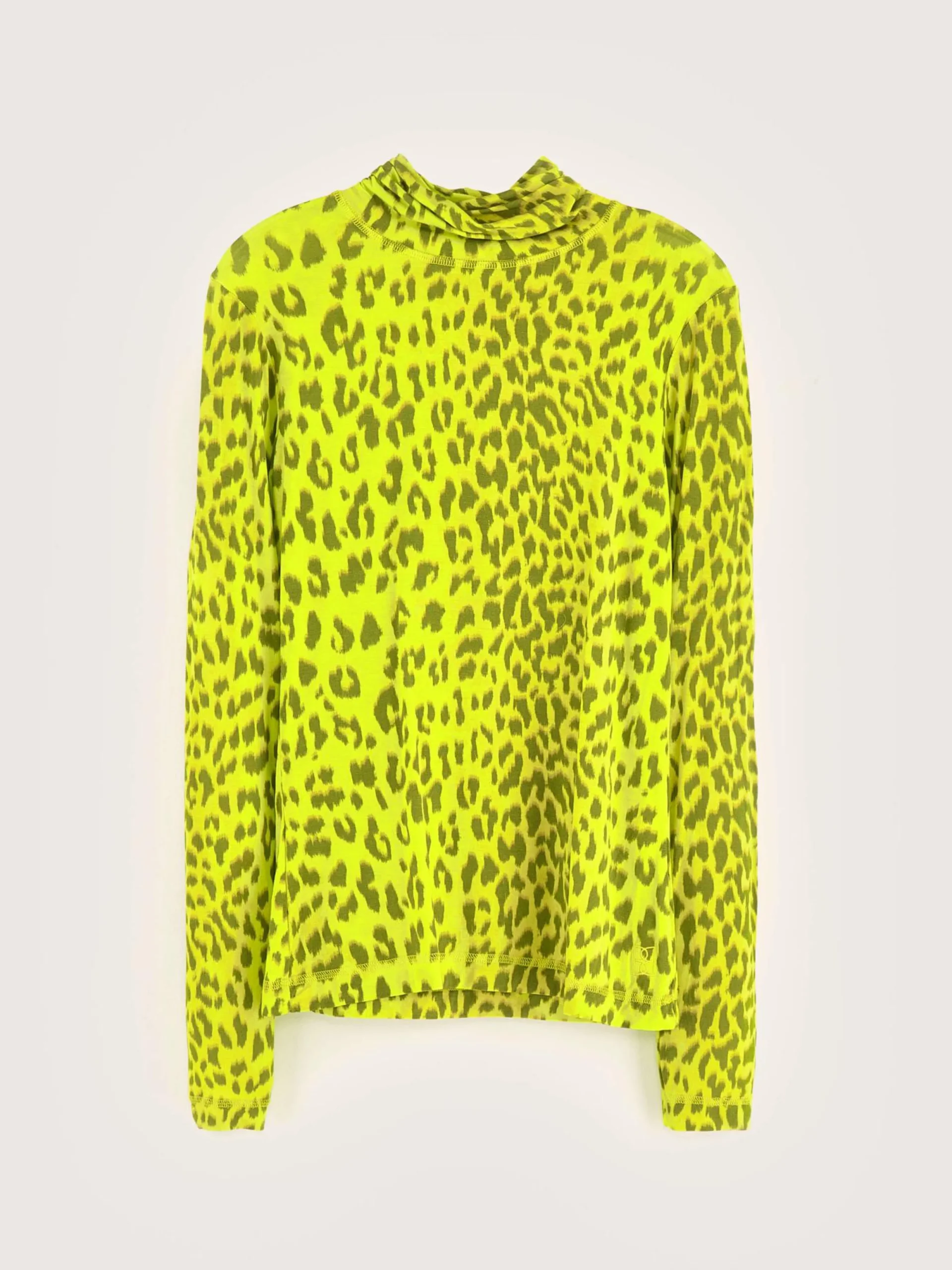 T-shirt à manches longues, coupe slim et col montant, en tissu effet seconde peau à motif léopard sur fond jaune.