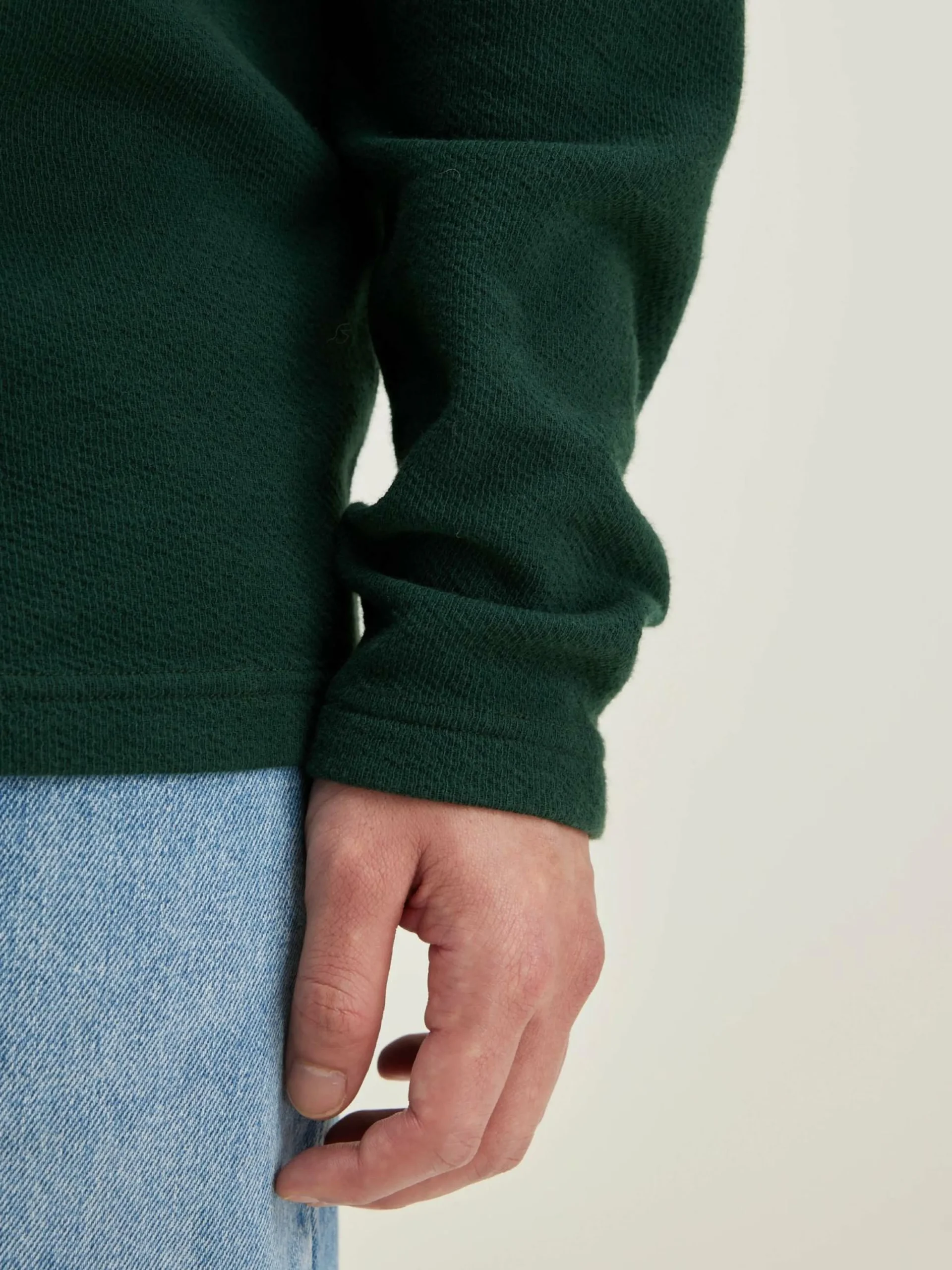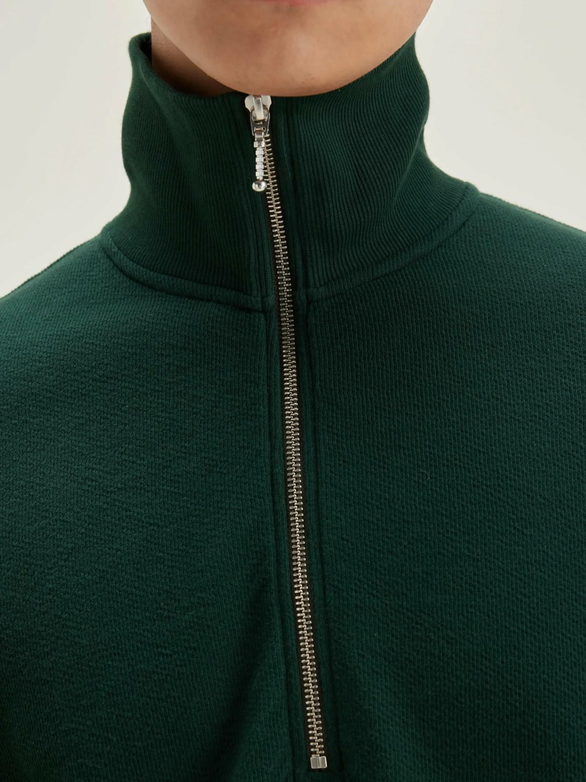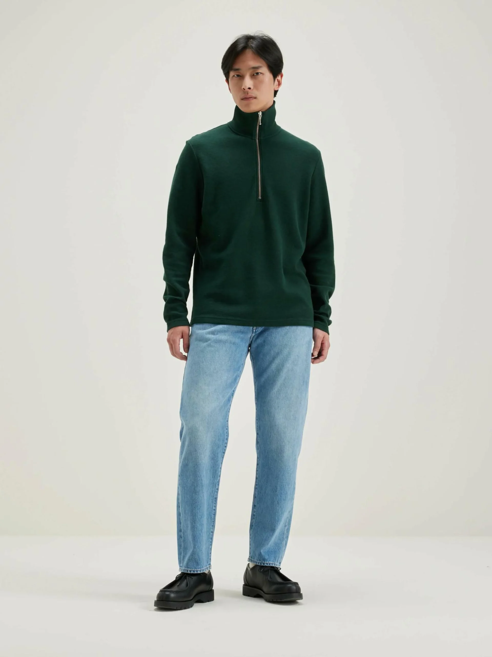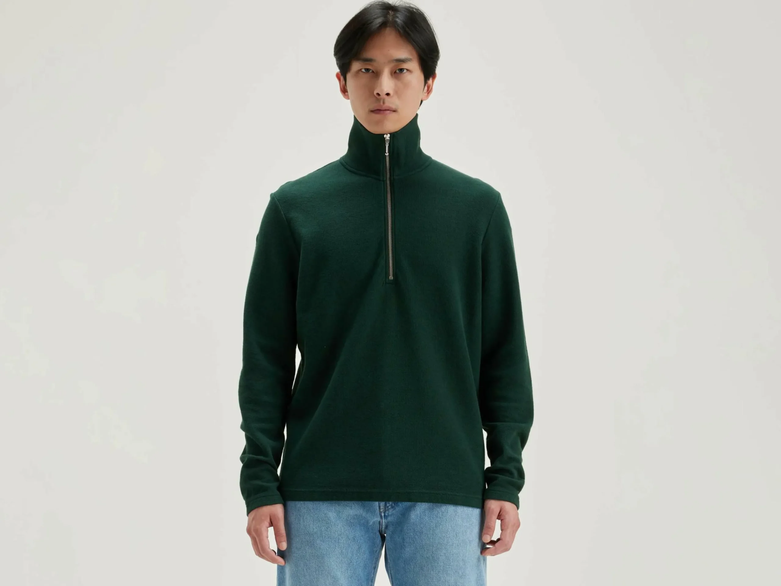 T-shirt classique à col zippé en jersey de coton double-face vert foncé.