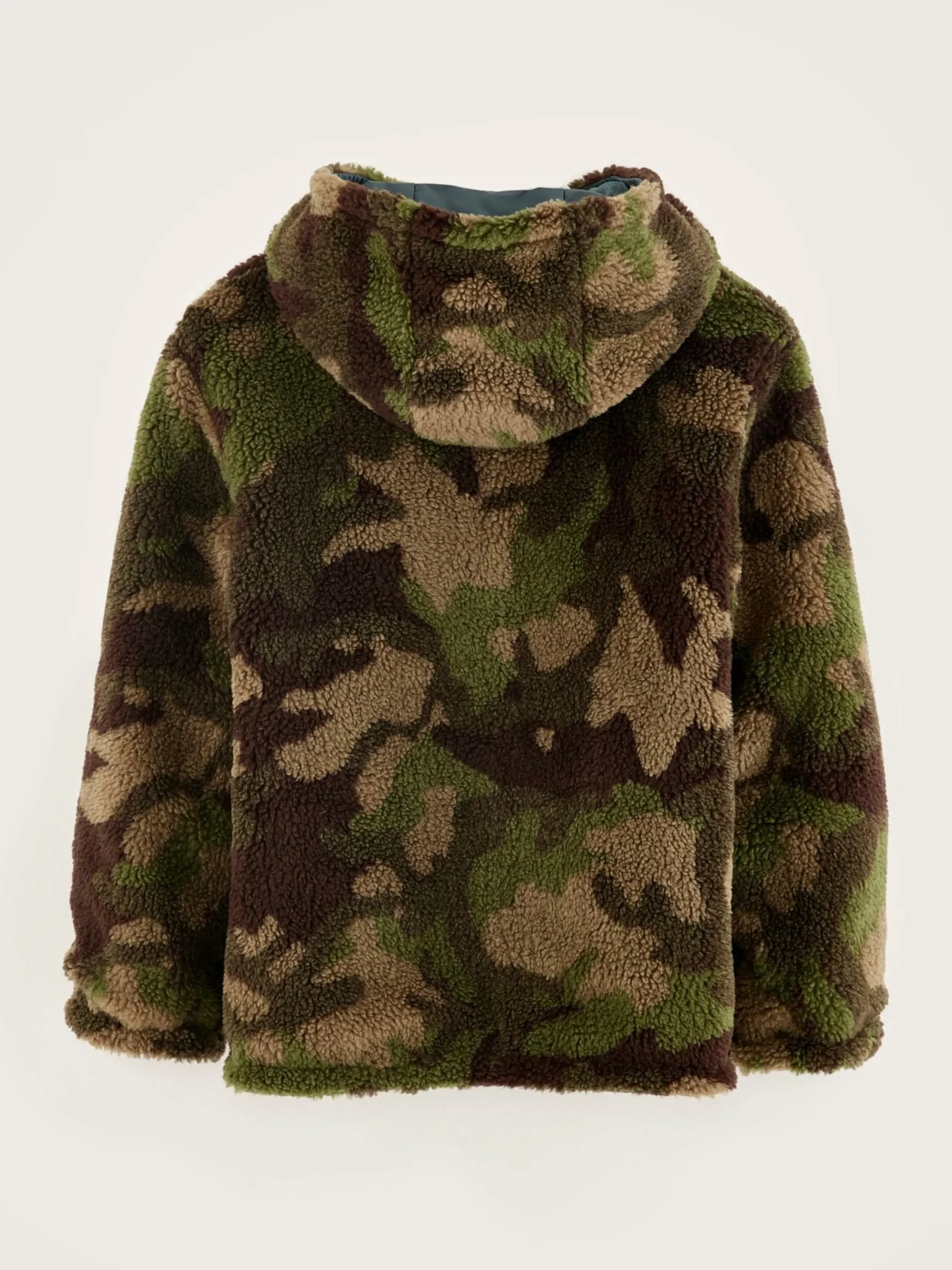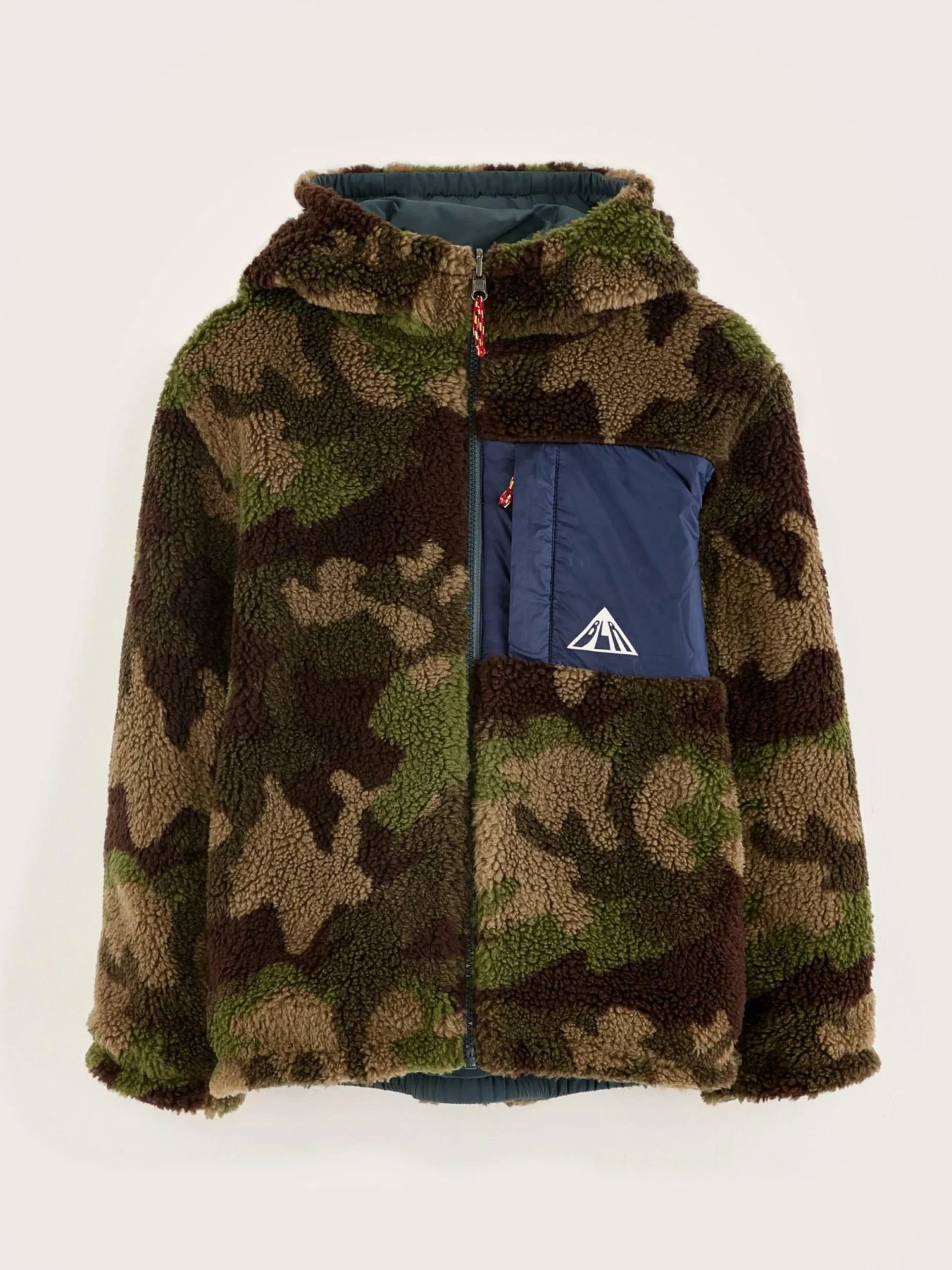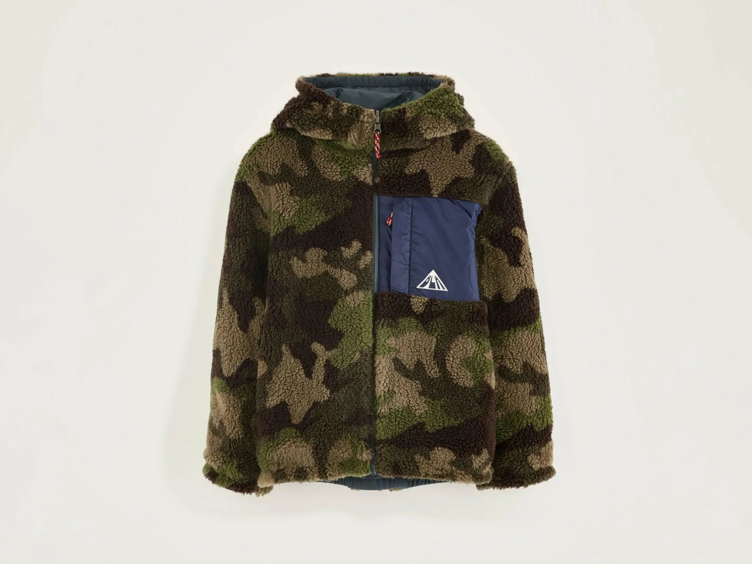 Veste réversible à capuche, coupe classique en tissu gris bleu et doublée de teddy imprimé camouflage.