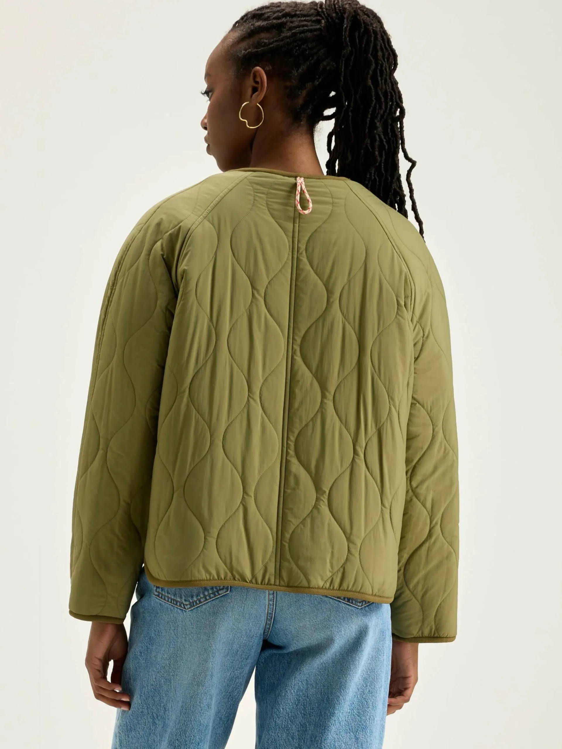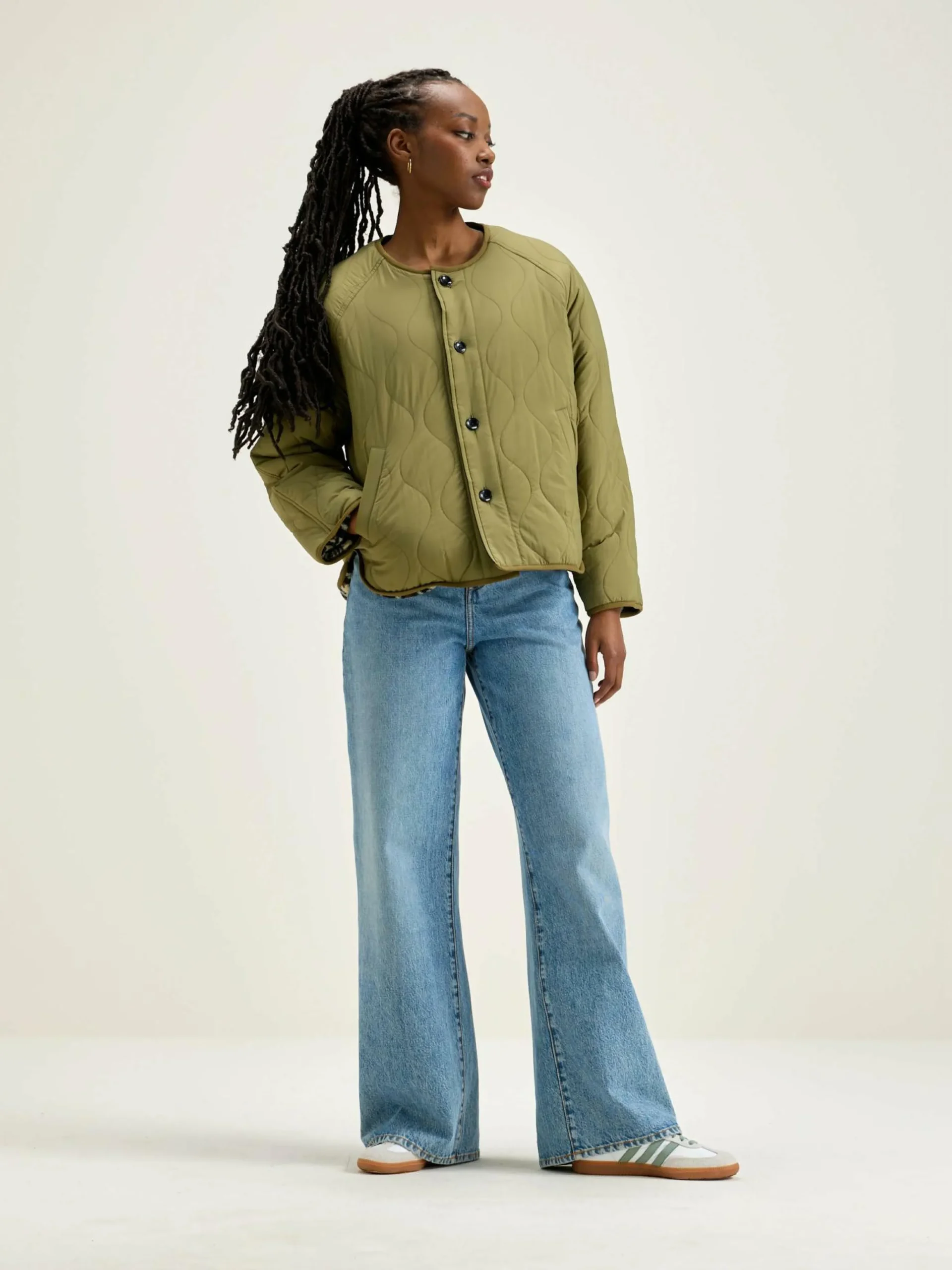 Veste oversize réversible à manches raglan. Un côté en ripstop kaki et l’autre en jersey bouclette imprimé léopard.