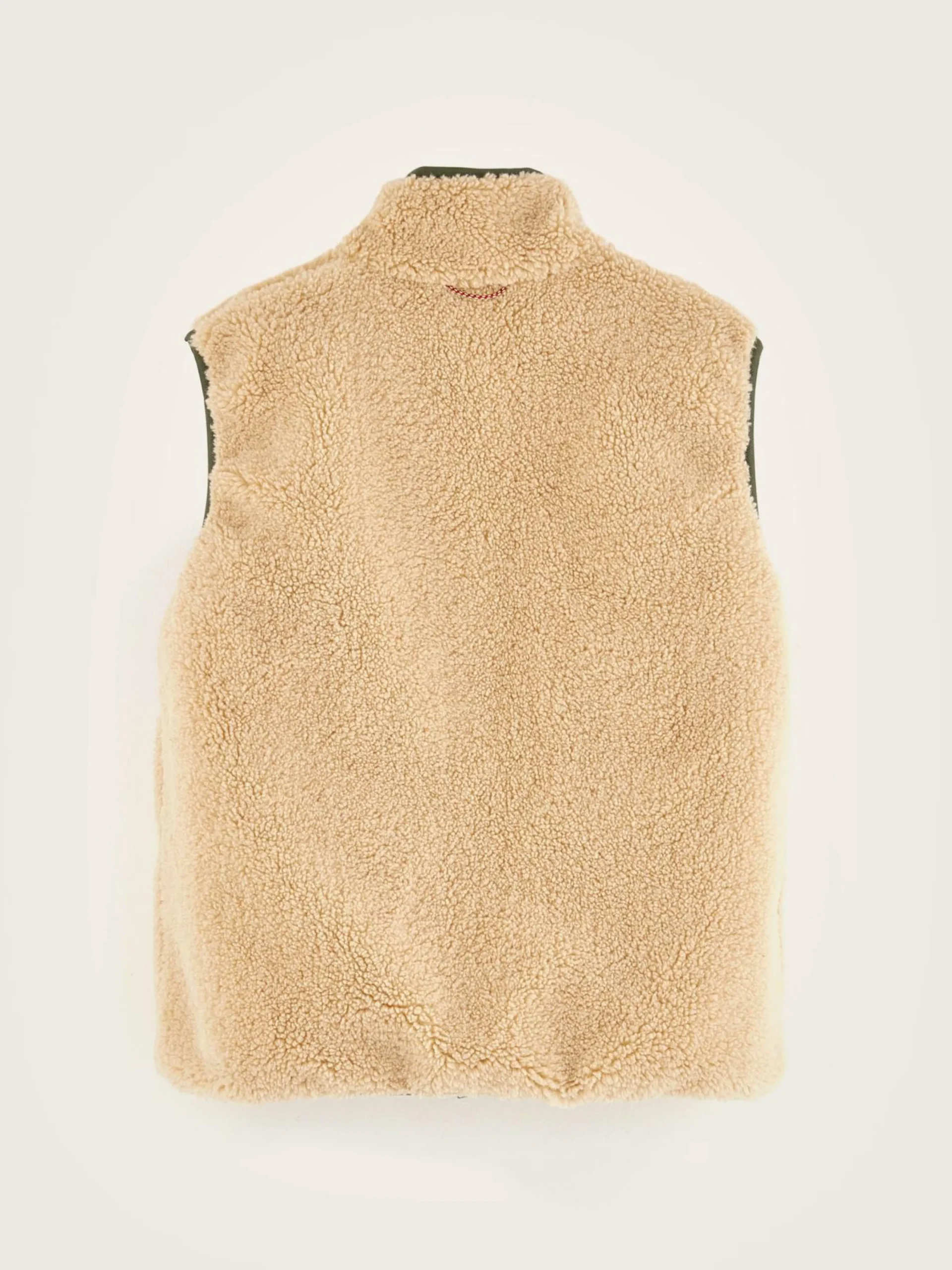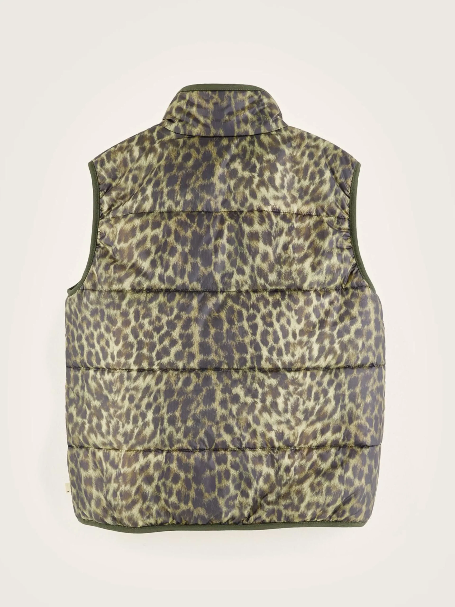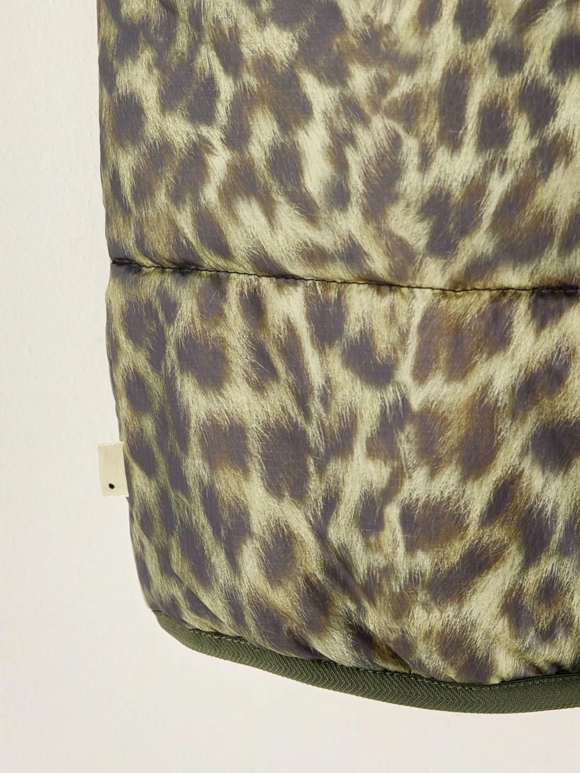 Veste réversible sans manches imprimée léopard. Un côté en nylon ripstop déperlant, l’autre en teddy ultra-doux.