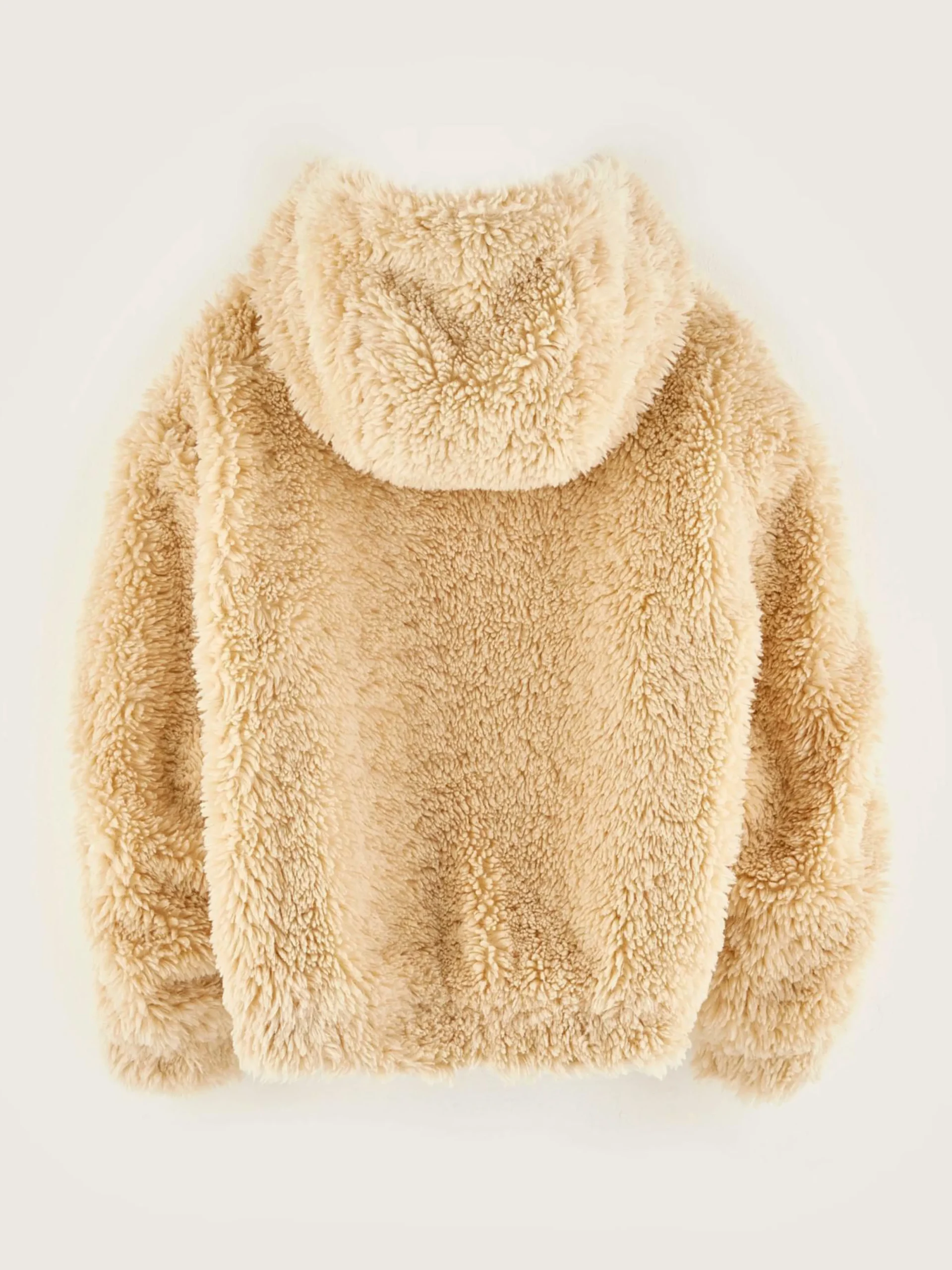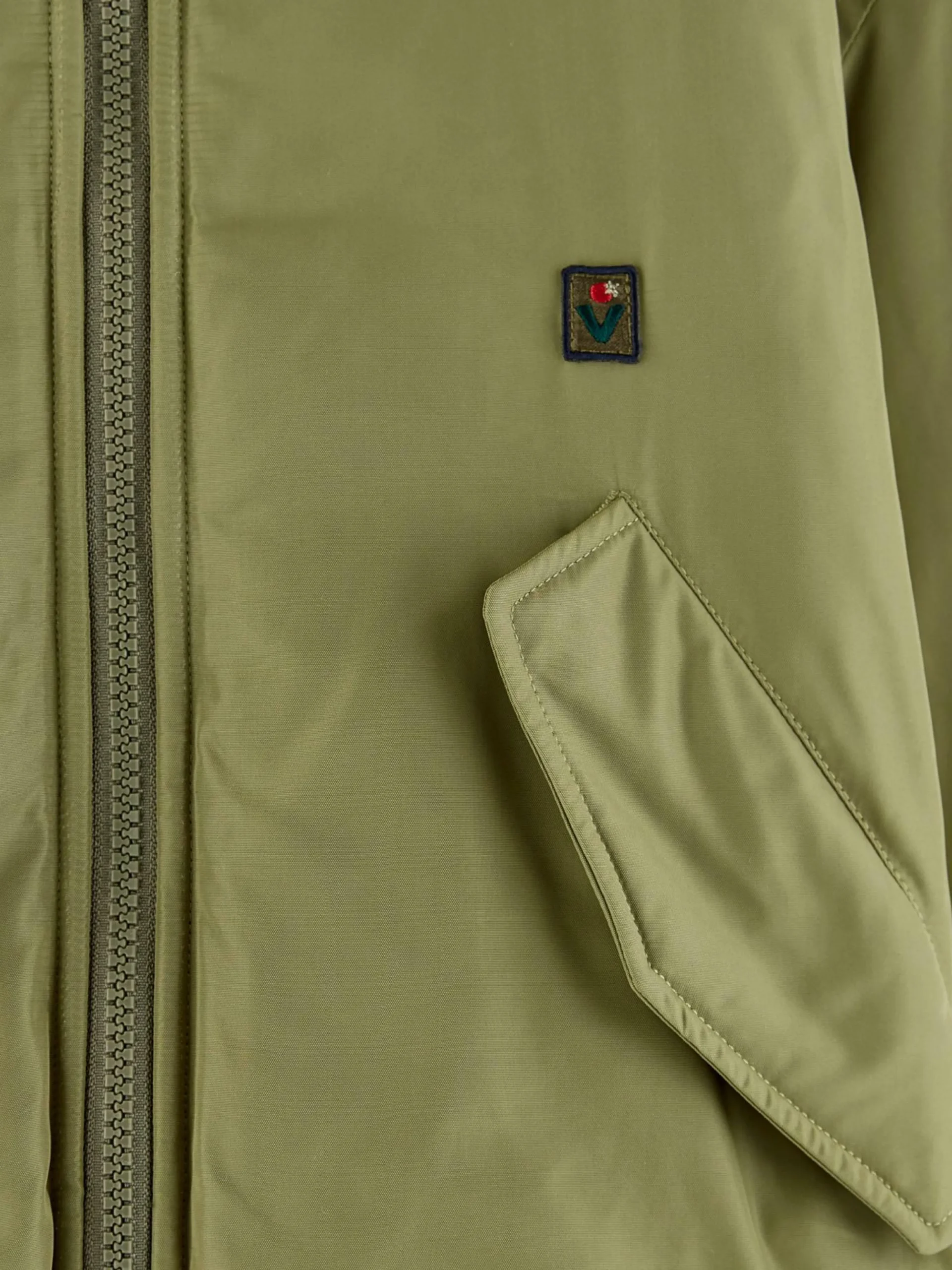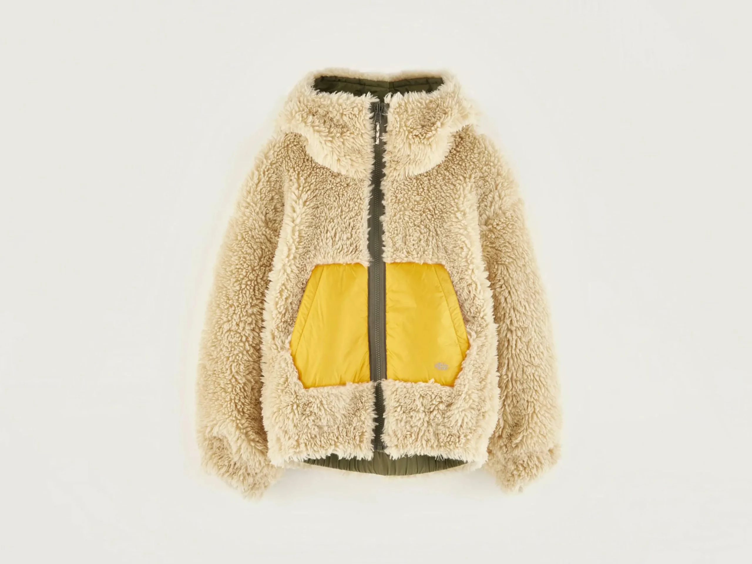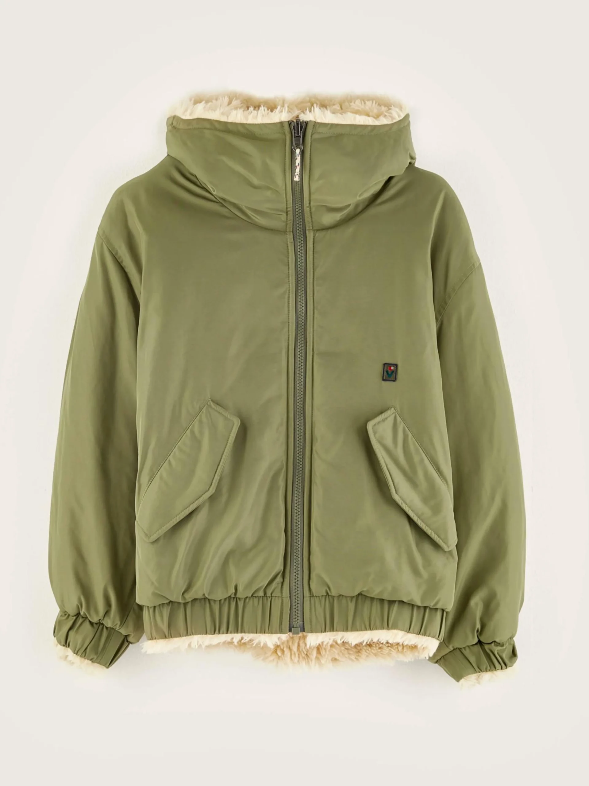 Veste réversible style bomber, couleur vert jeep et doublure en fausse fourrure écrue.