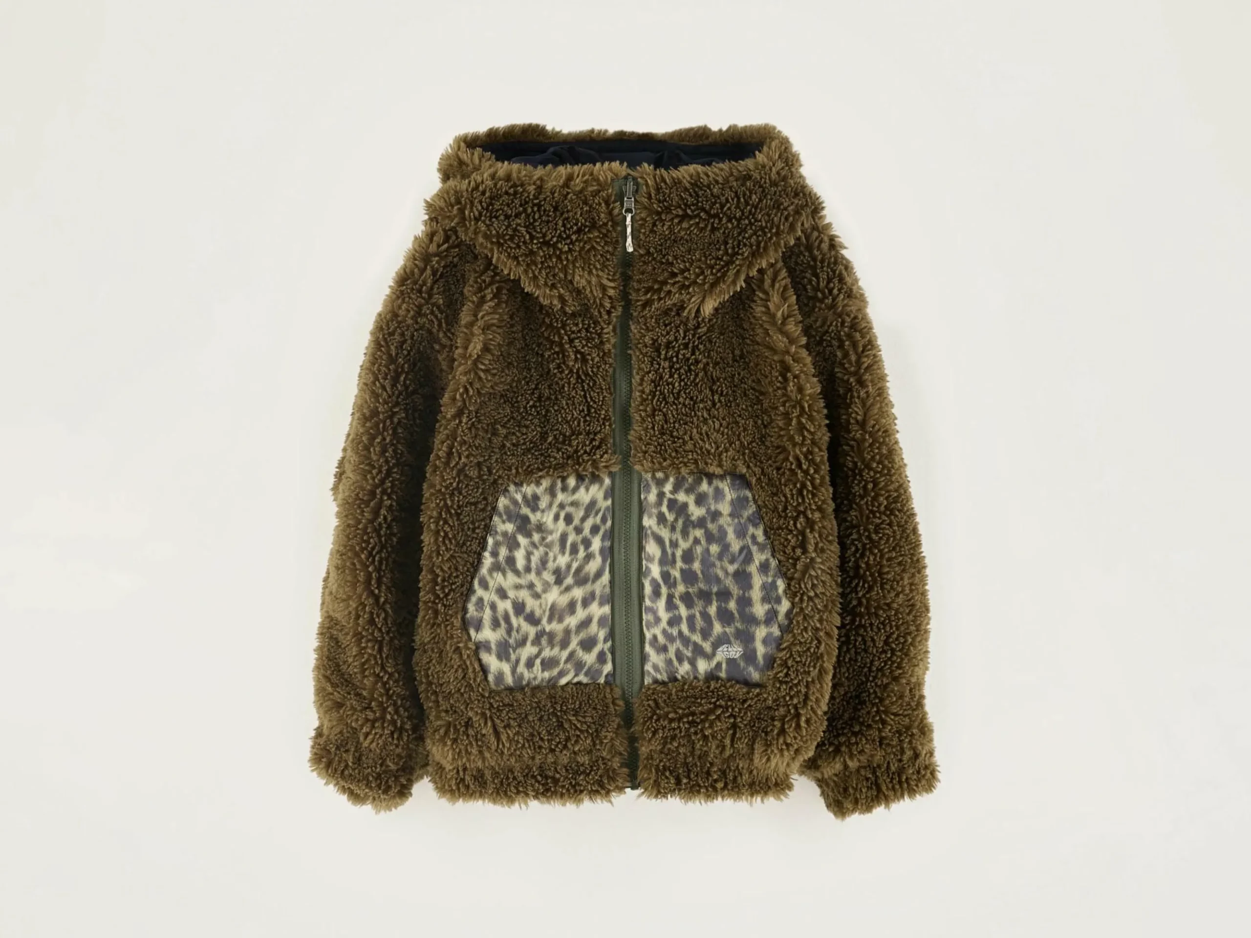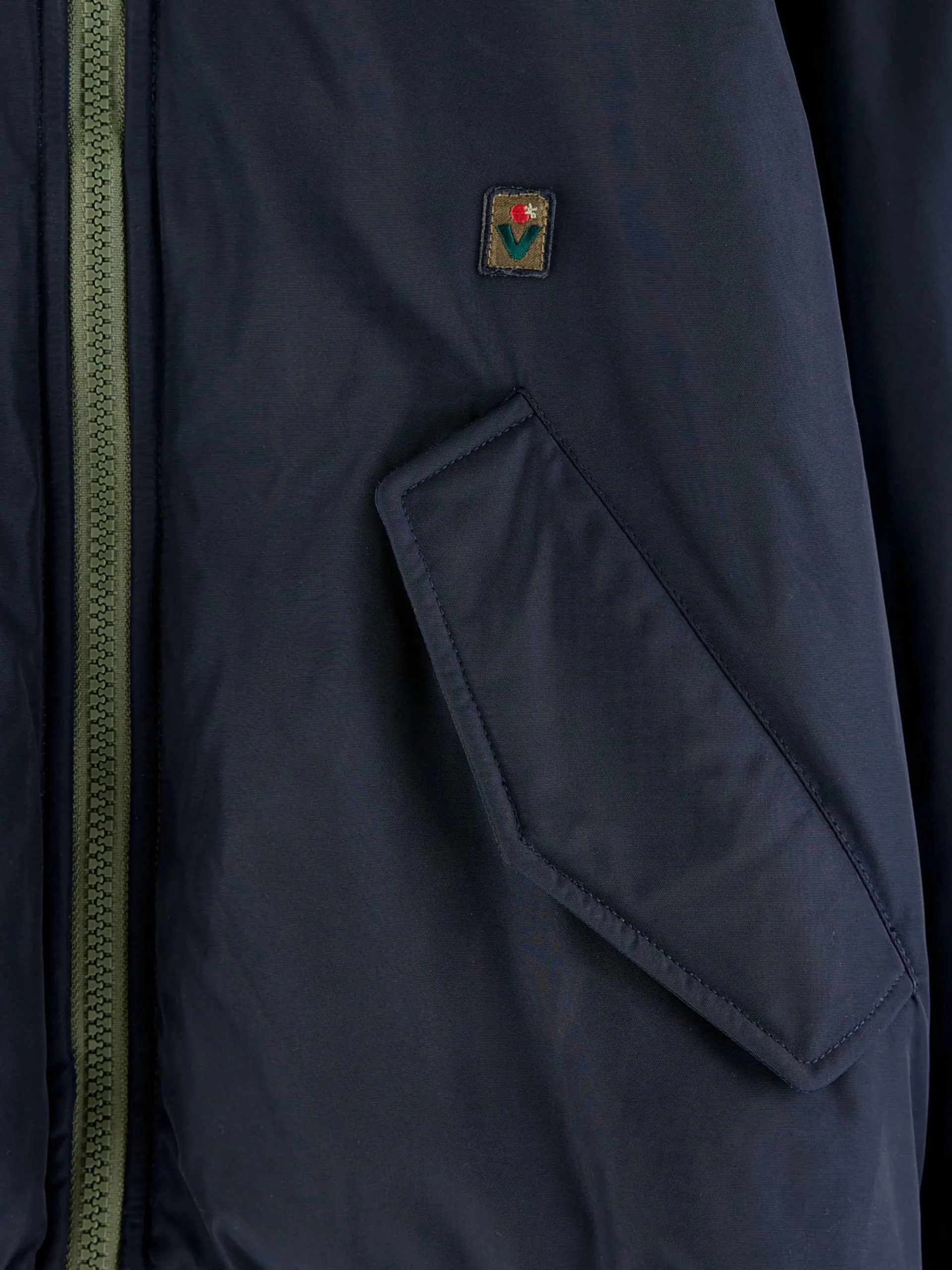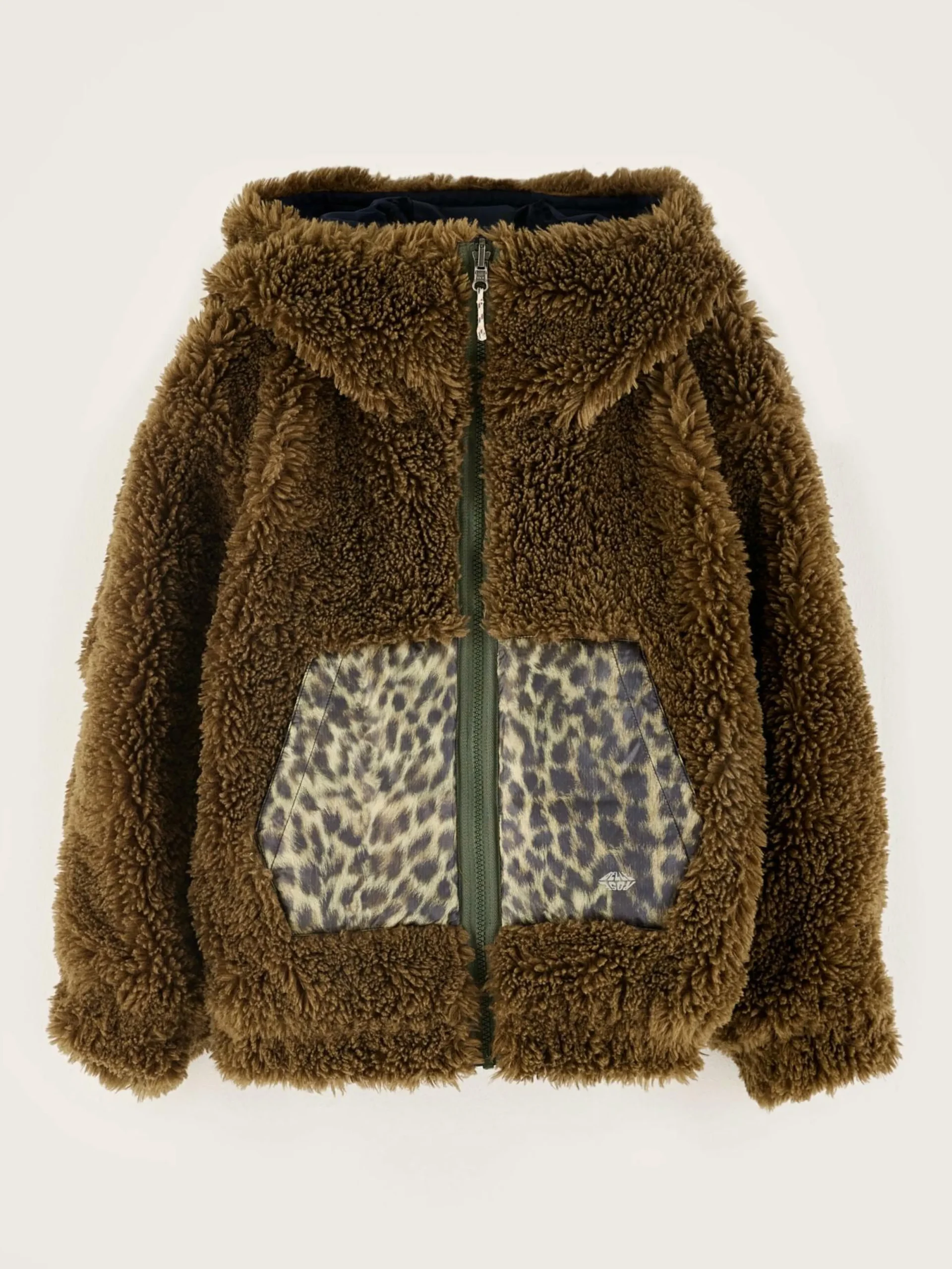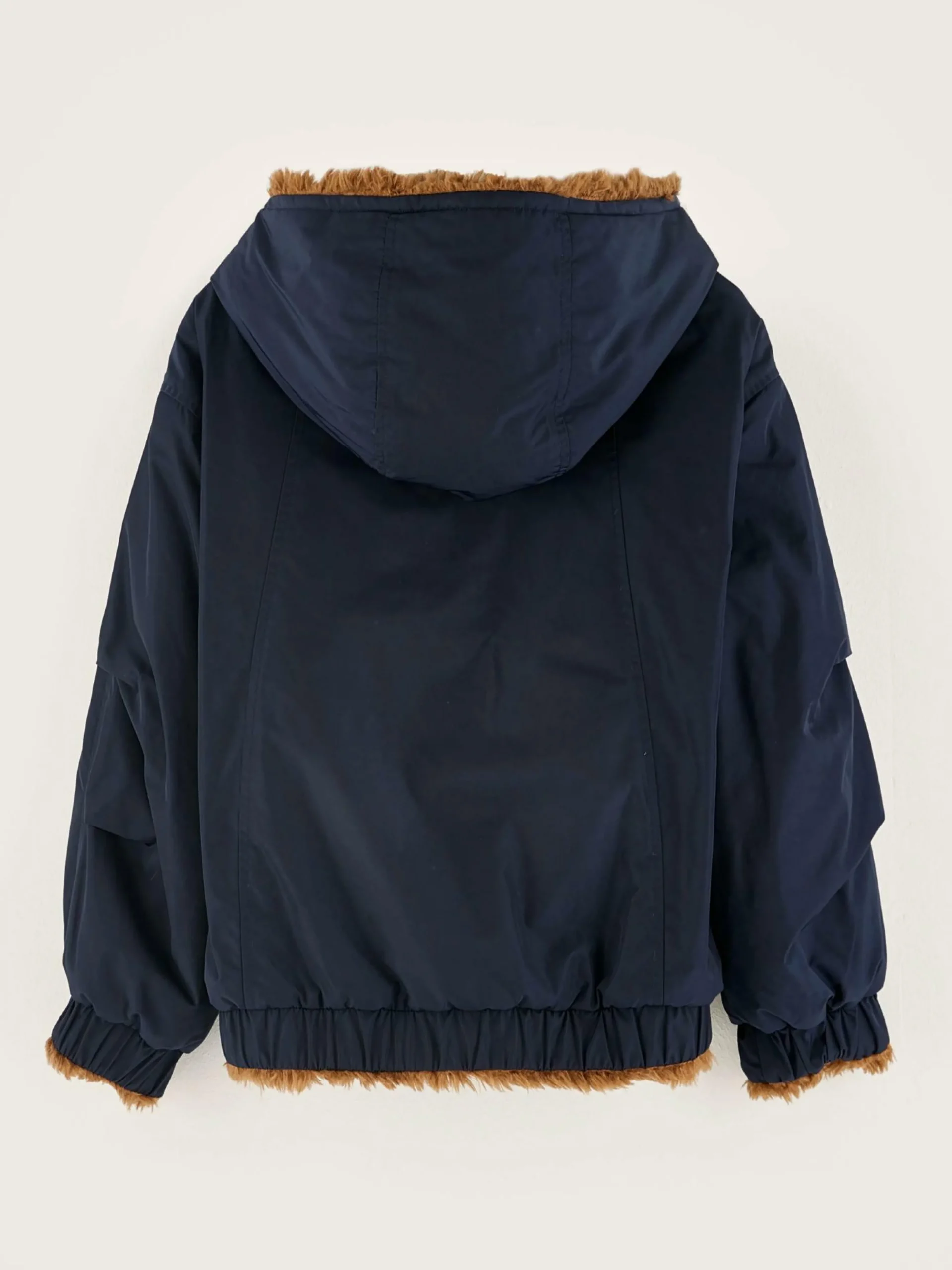Veste réversible style bomber, couleur bleu encre et doublure en fausse fourrure brune.