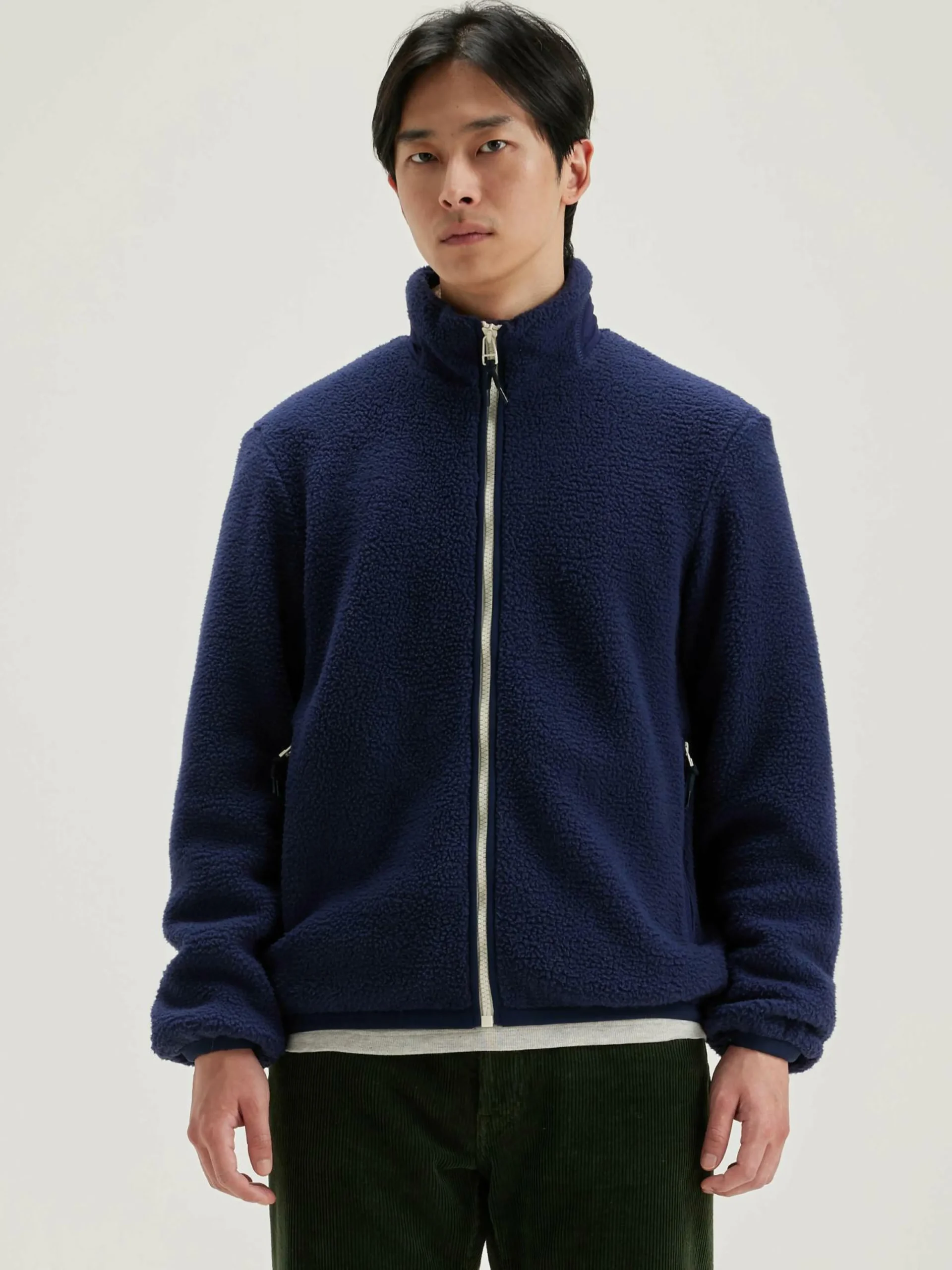 Veste sweatshirt droite et zippée en polaire bleu foncé.