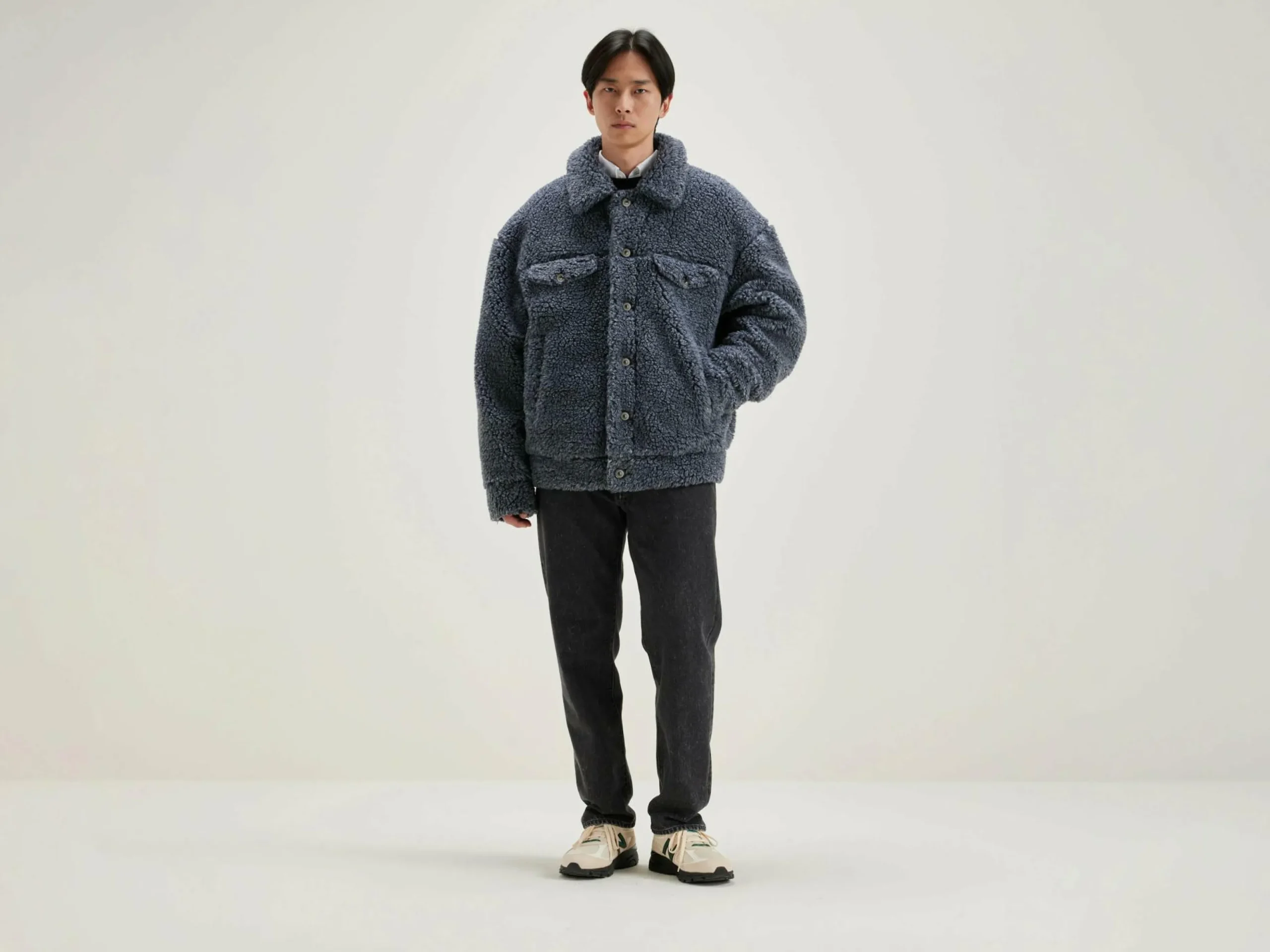 Veste oversize insiprée des vestes en jean et confectionnée en teddy gris anthracite chiné.