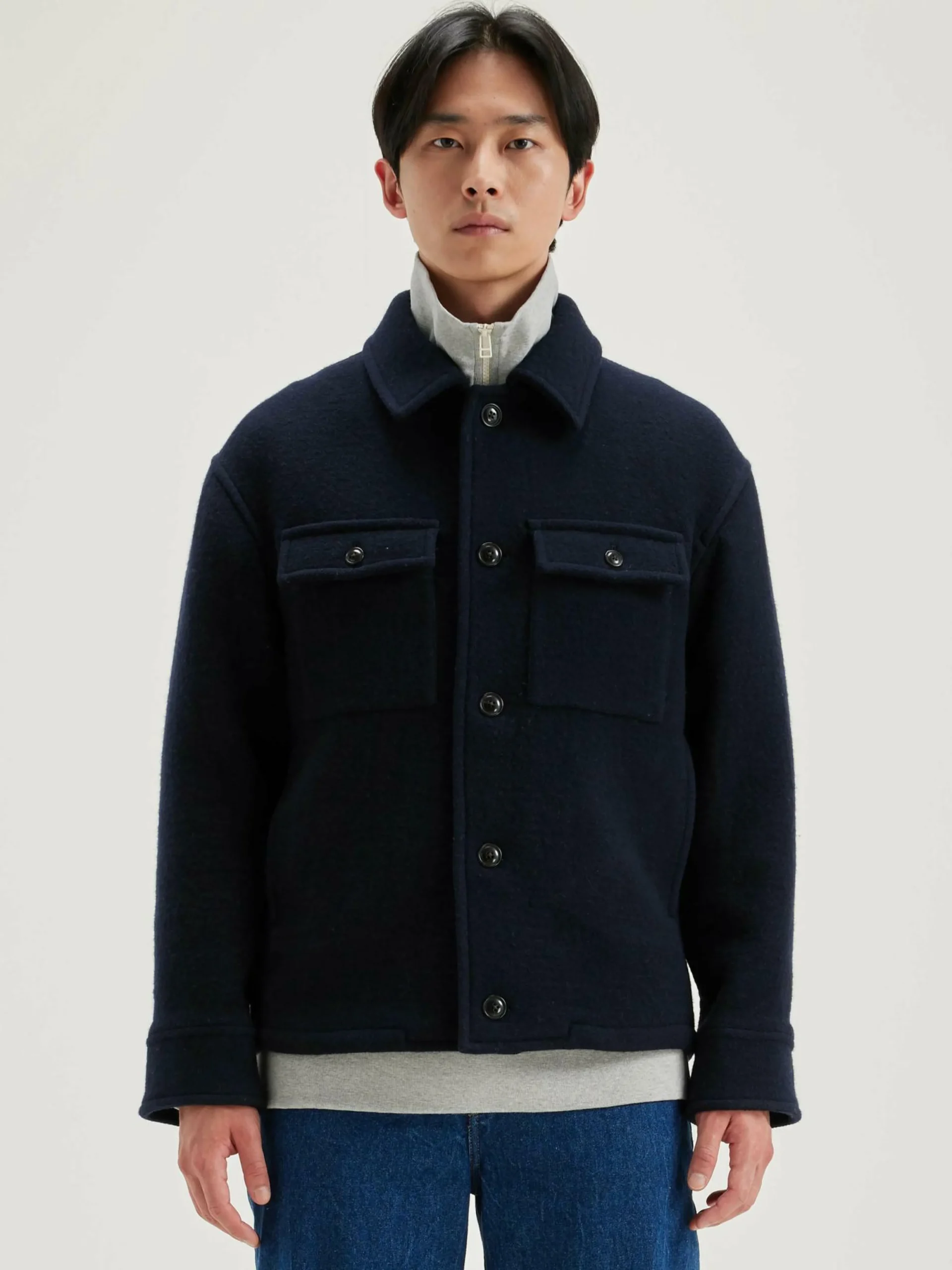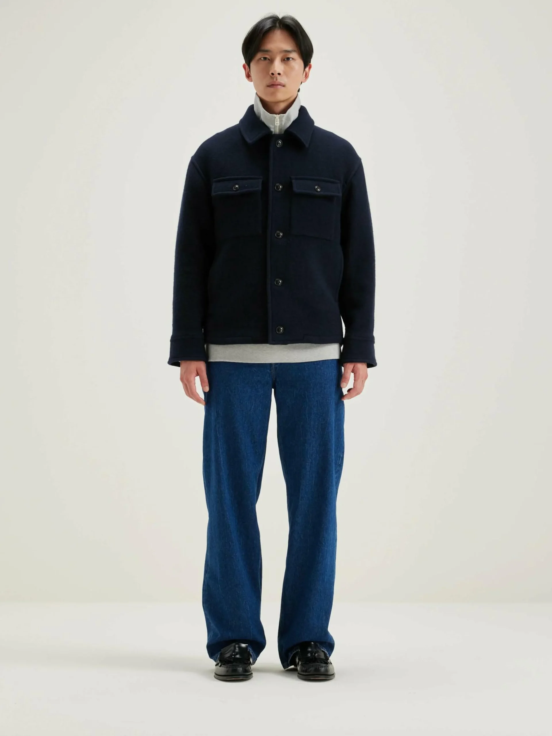 Veste droite décontractée en drap de laine double-face. Face externe en bleu marine et intérieur vert bouteille.
